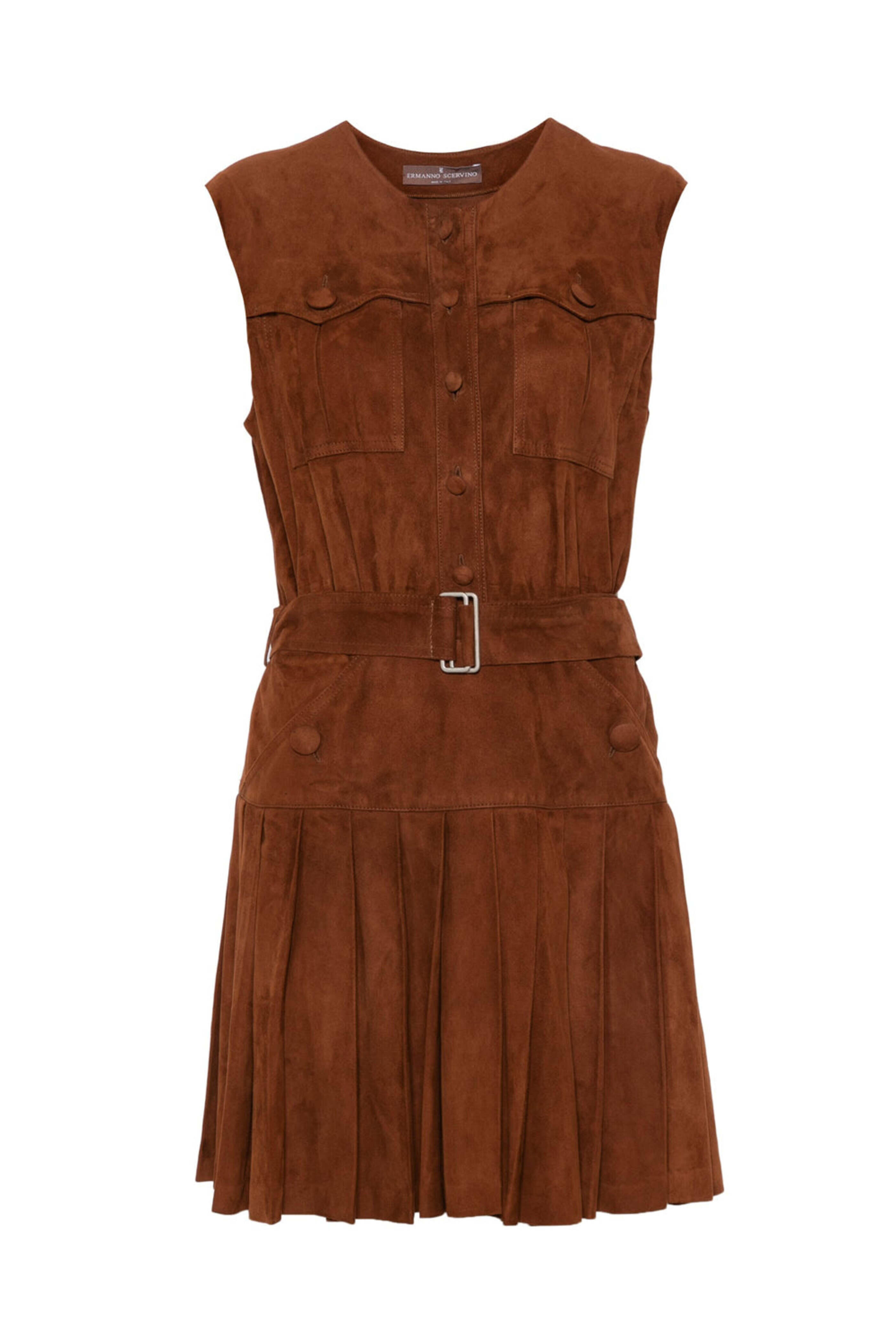 Ermanno Scervino Tortoise Suede Sneza Maniche Mini Dress. Round neck. Sleeveless. Half button placket. Chest and hop flap pockets; button closure. Self-cover button detail. Belt loops. Adjustable d-ring belt; self-fabrication. Pleated skirt. Mini length. Suede fabrication. 100% leather.