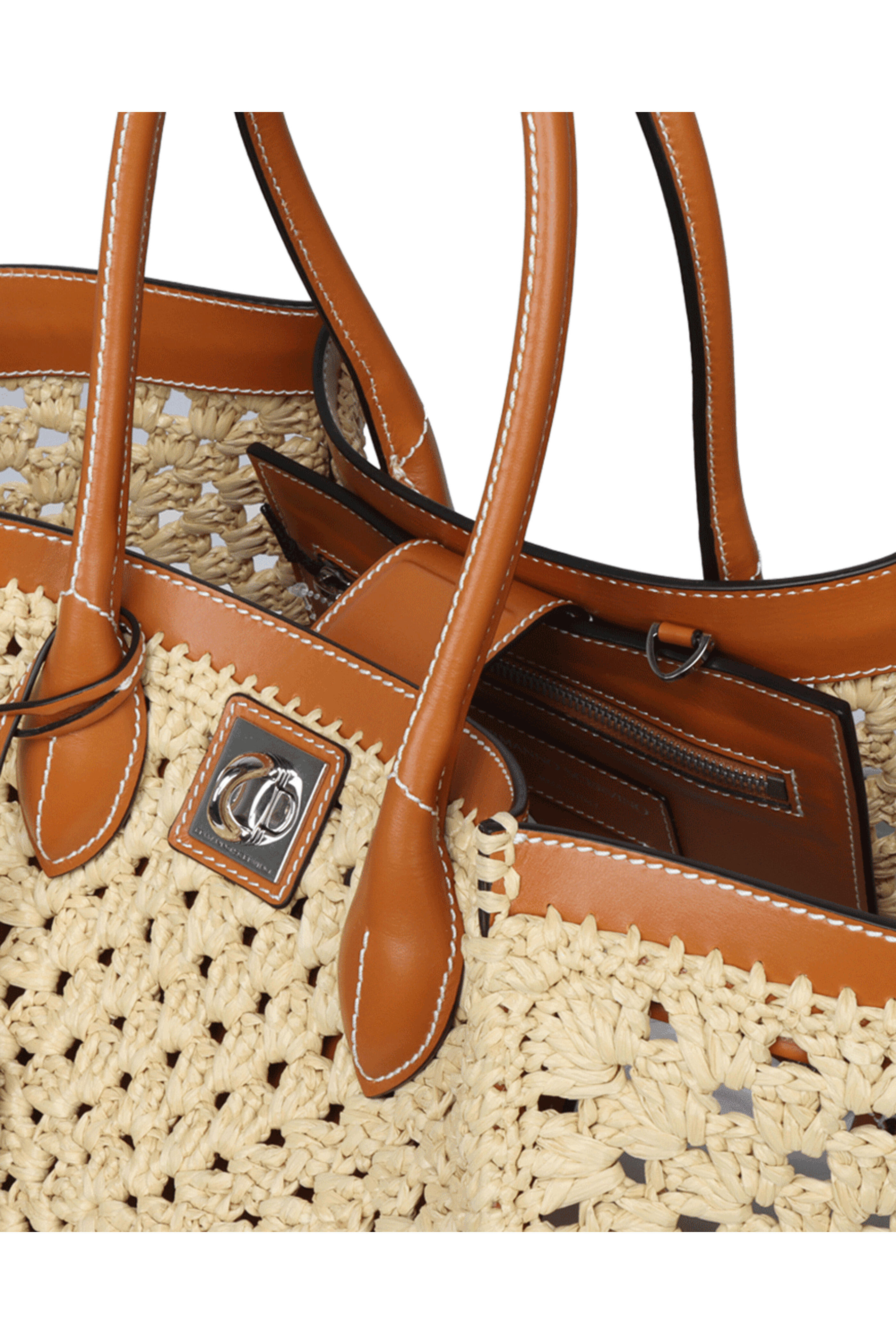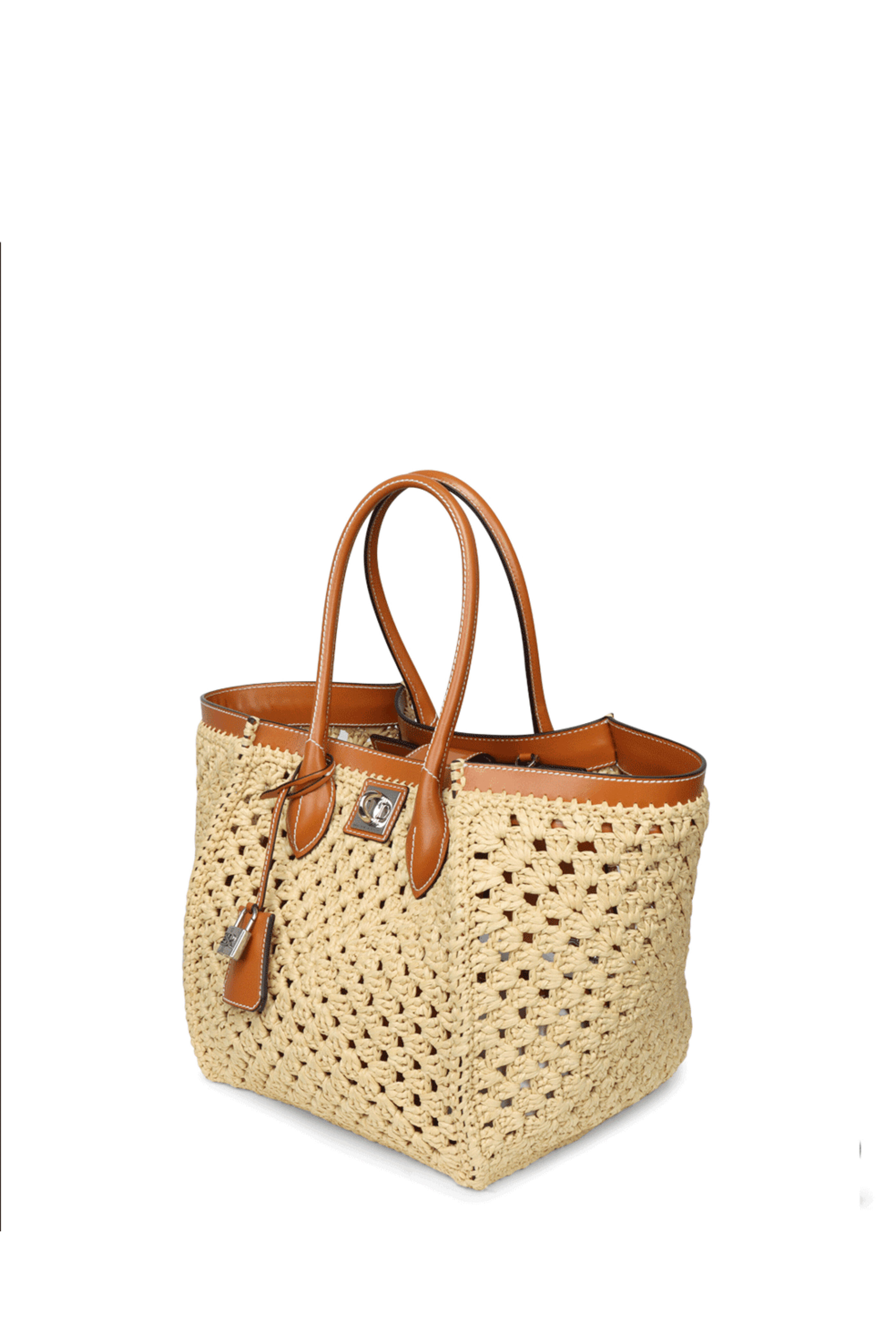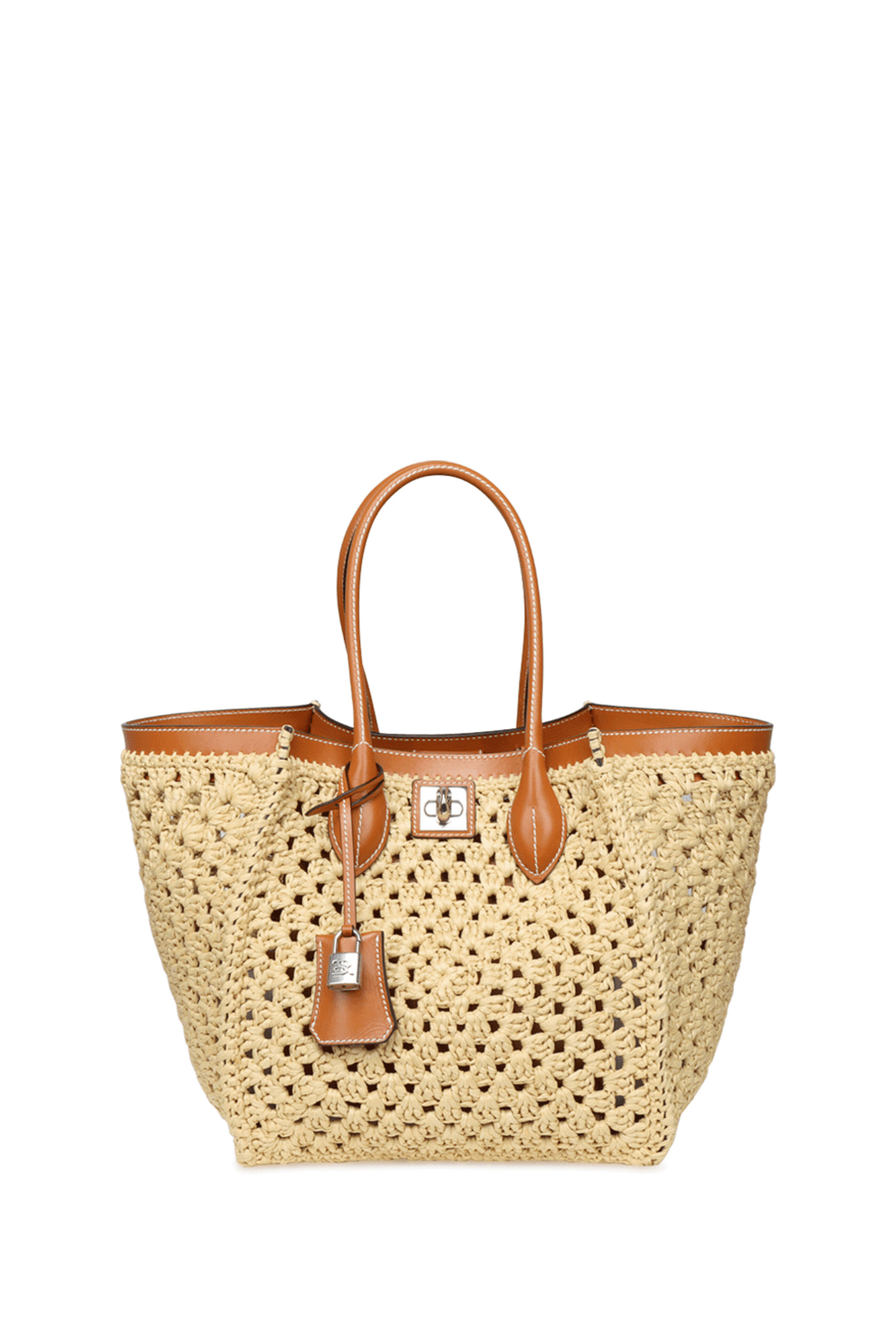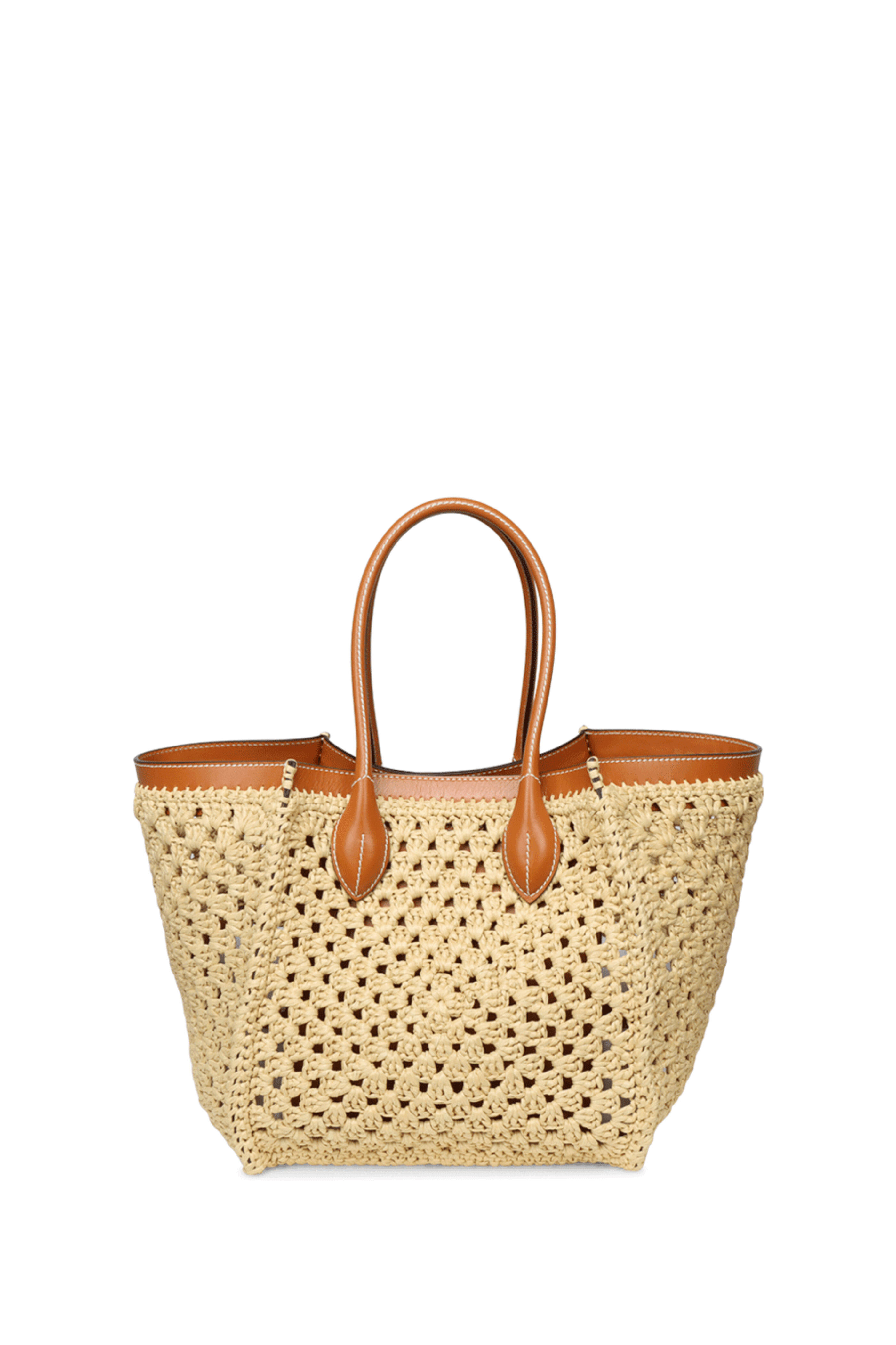 Ermanno Scervino Borsa Crotchet Shopping Tote in Banana and Cream. Open top. Turn-clasps fastening. Dual top handles. Adjustable, detachable shoulder strap. Features a leather bell and logo padlock. This workmanship uses the high mesh stitch, which creates a three-dimensional texture and a visual effect of great impact. Rafia crochet outer. Calf leather trim. Unlined. 14 W x 17 H x 10 D. 7 handle drop. Made in Italy.