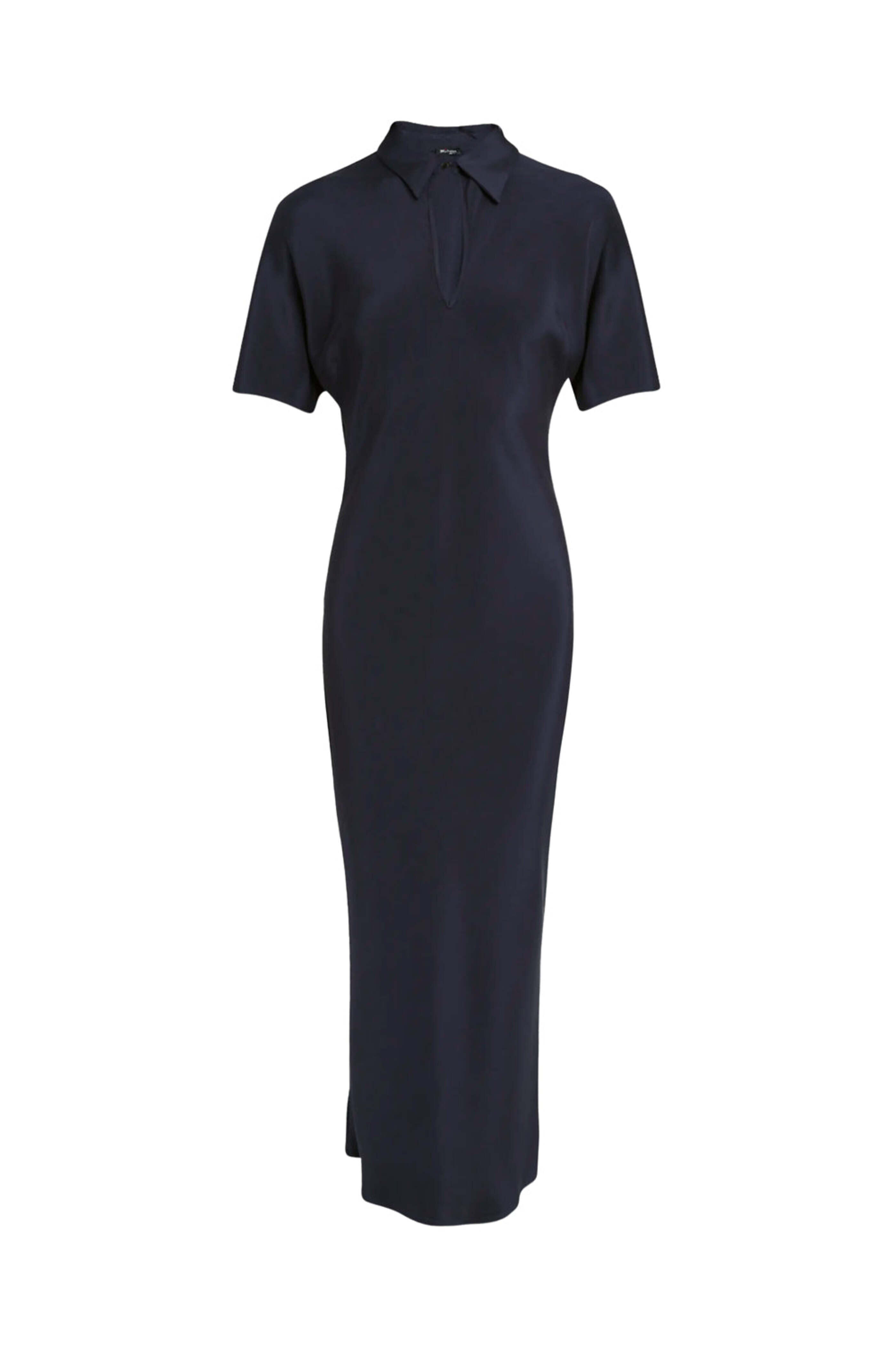 Kiton Navy Keyhole Midi Dress. Collar. Button front closure; keyhole detail. Short dolman sleeves. Slim silhouette. Midi length. Silk, elastane. Made in Italy.