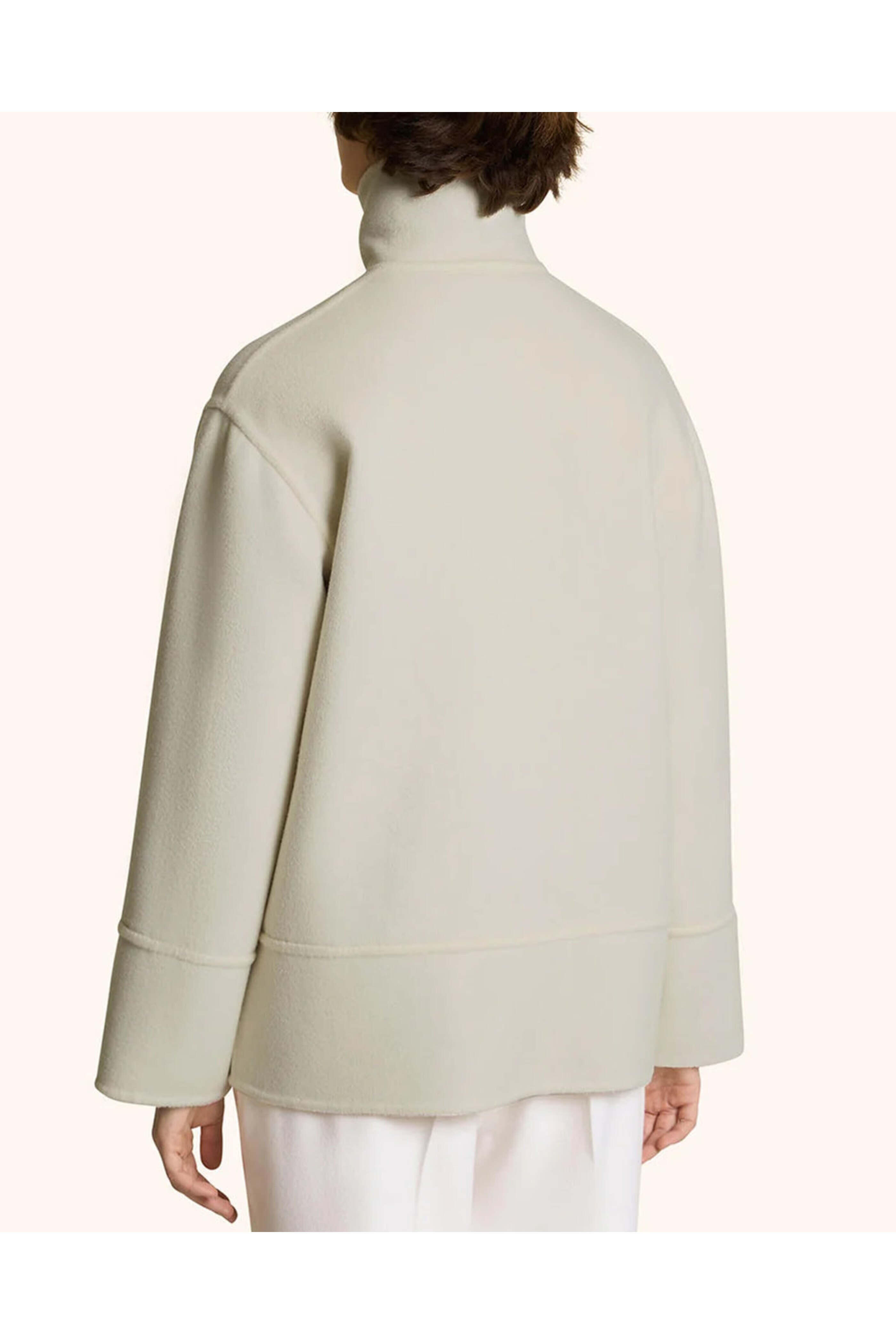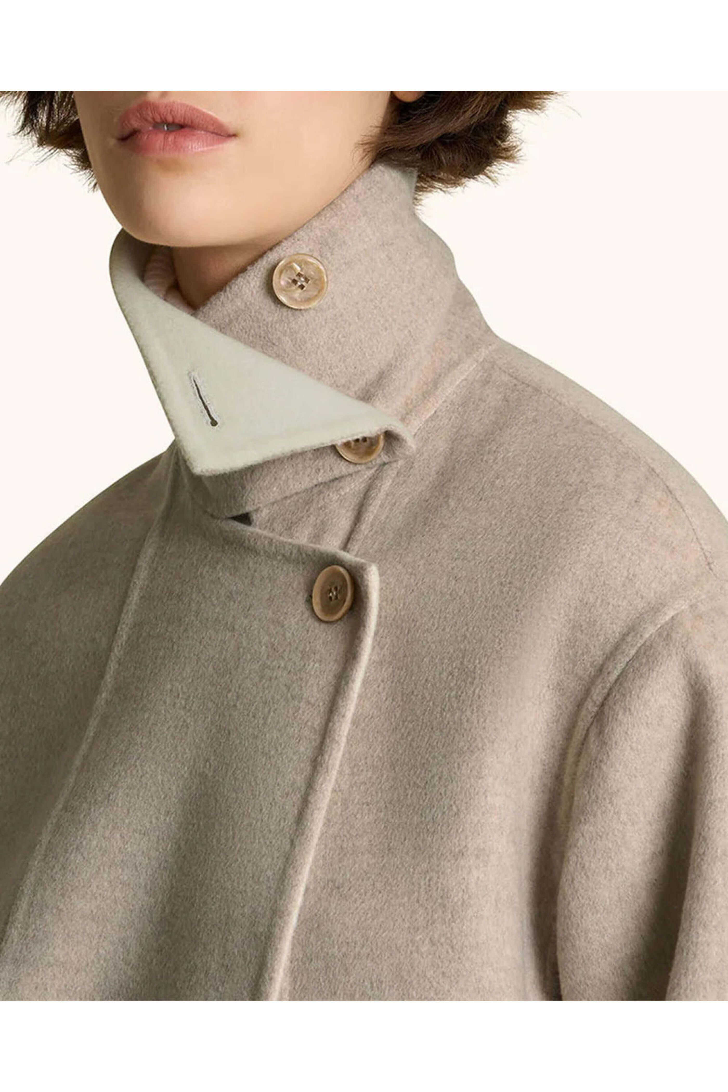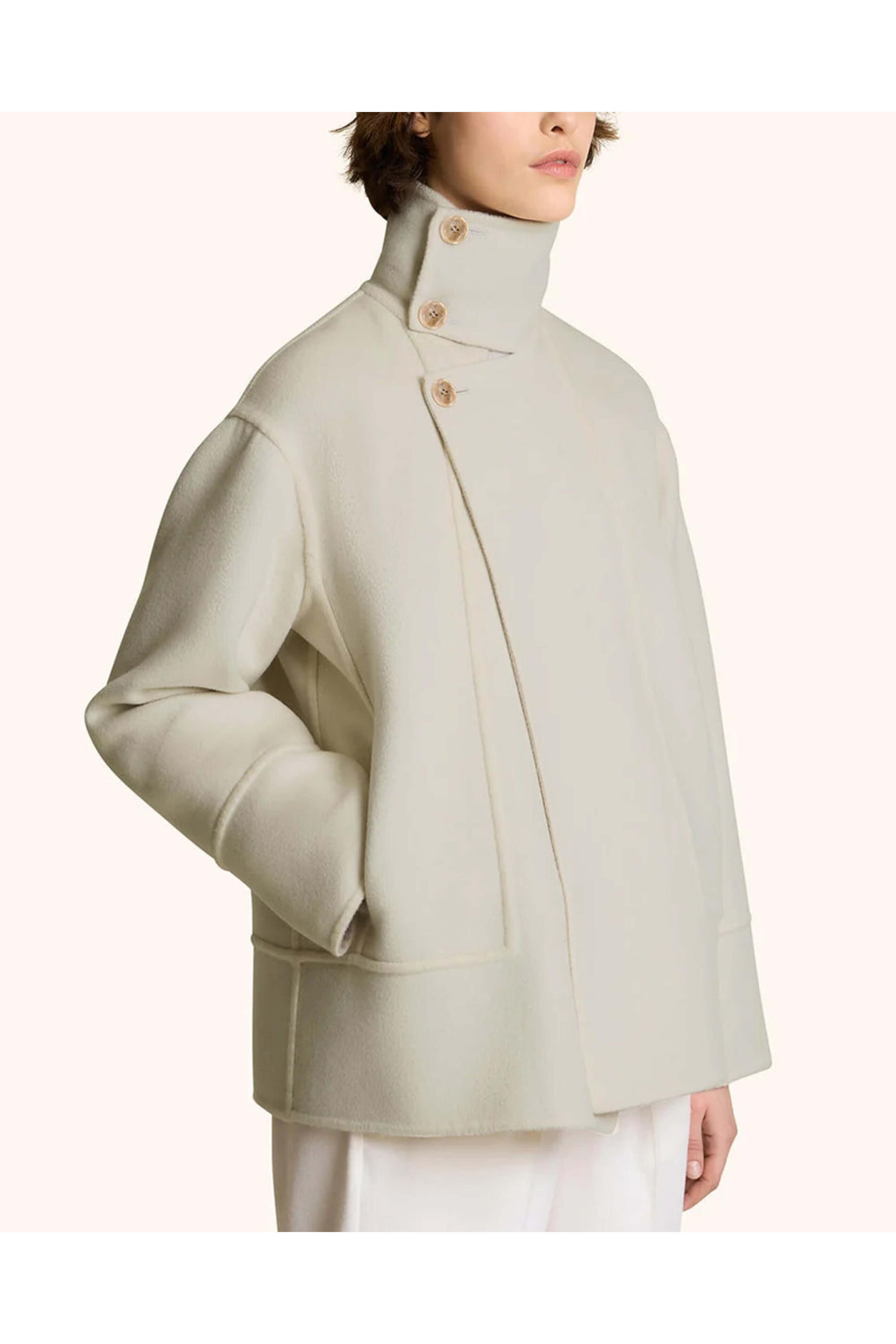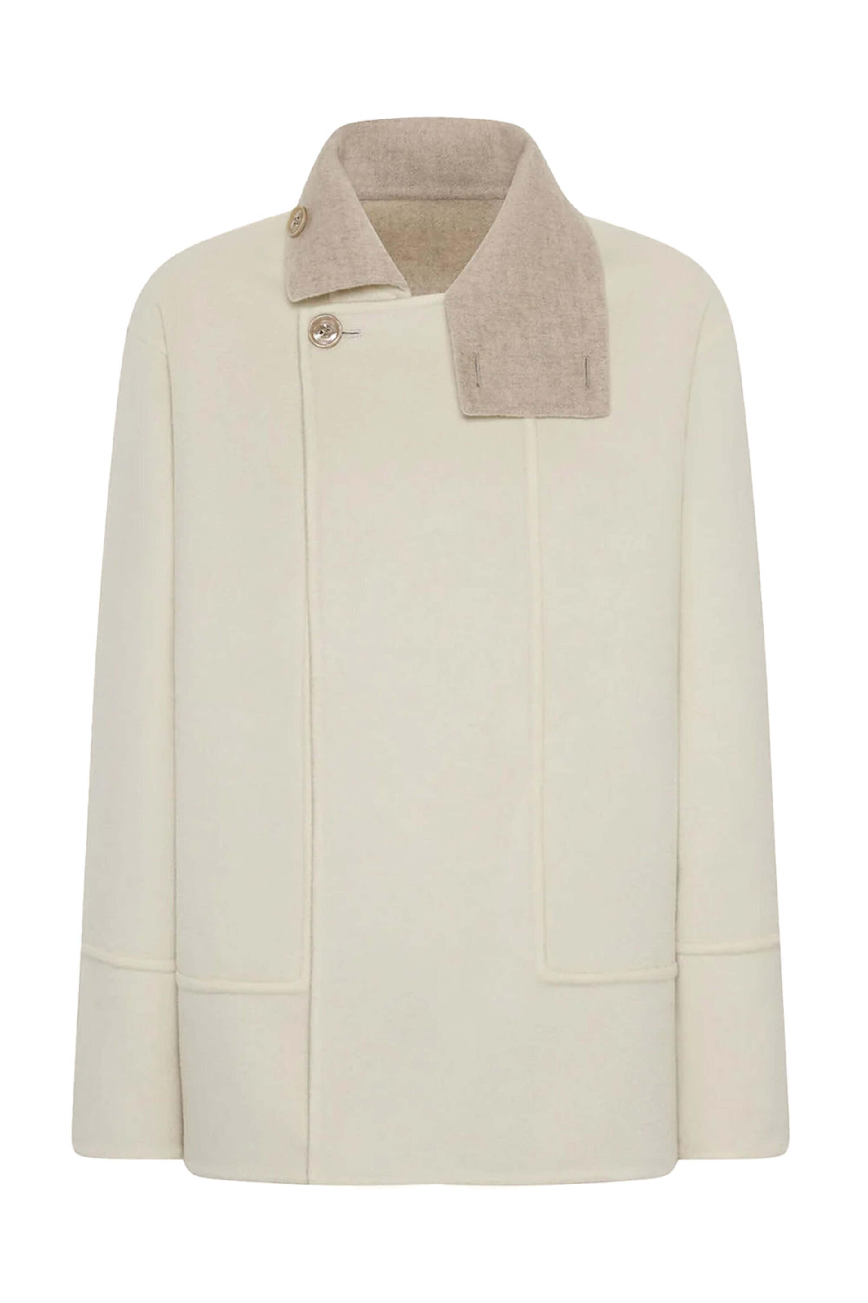 Kiton Cream and Hazel Short Coat. Stand collar; button closure. Long sleeves. Concealed front closure. Side slip pockets. Boxy fit. Reversible fabrication. Made in Italy. 100% cashmere.