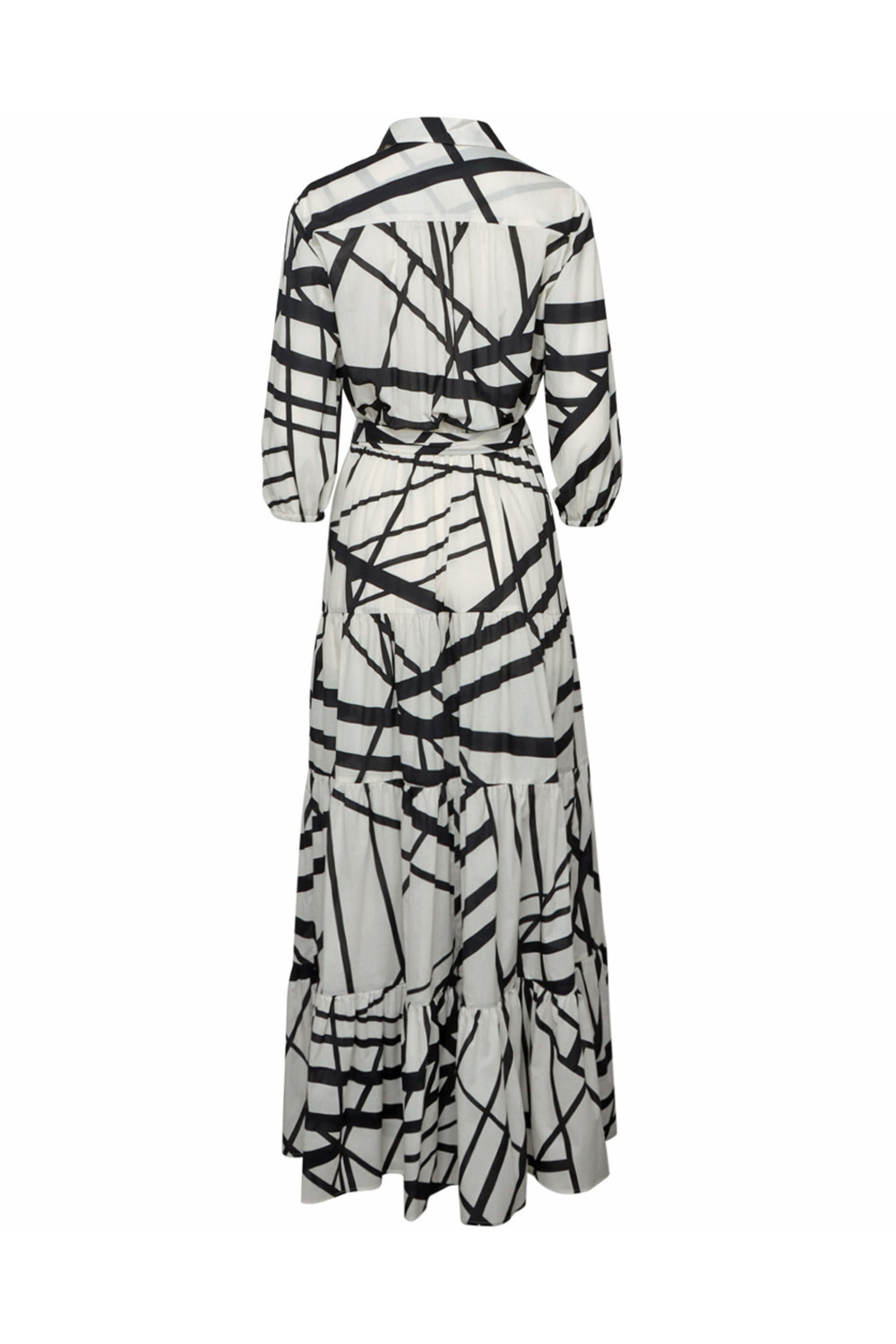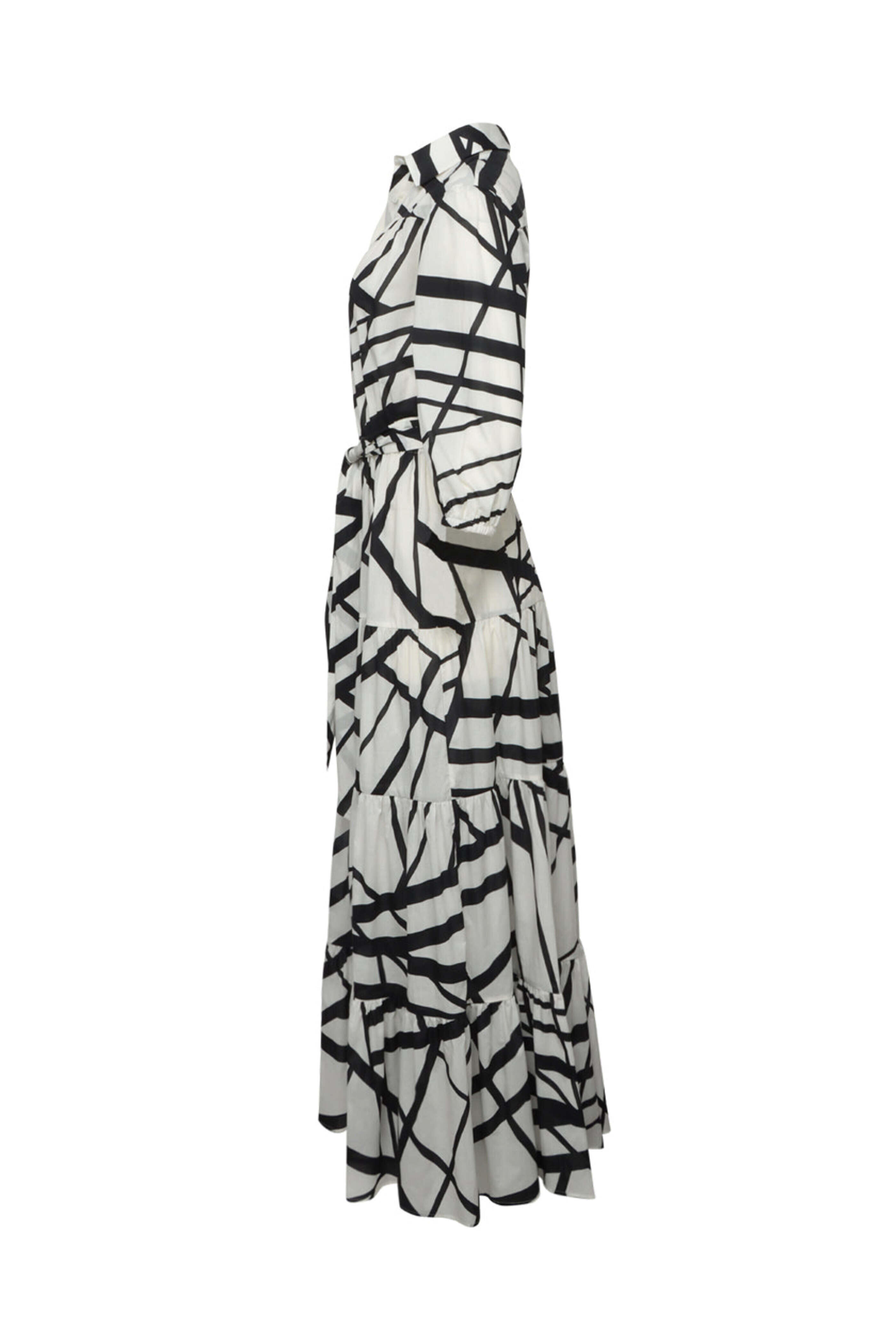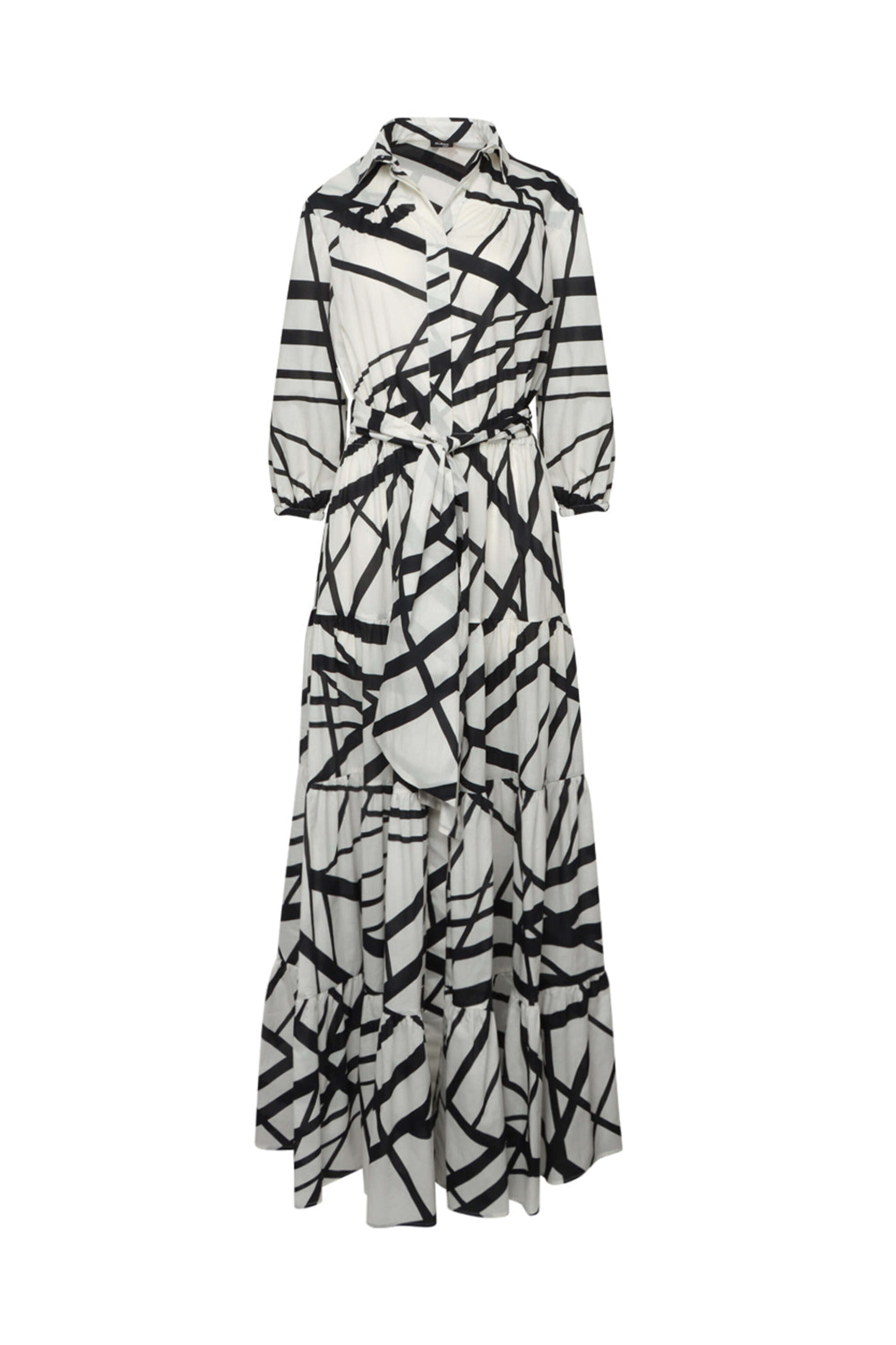 Kiton White and Black Printed Shirtdress. Collar. ¾ length sleeves; elastic cuffs. Concealed button down front closure. Elastic waist. Removable self-tie belt; self-fabrication. Tiered aline silhouette. Maxi length. Made in Italy. 100% cotton.