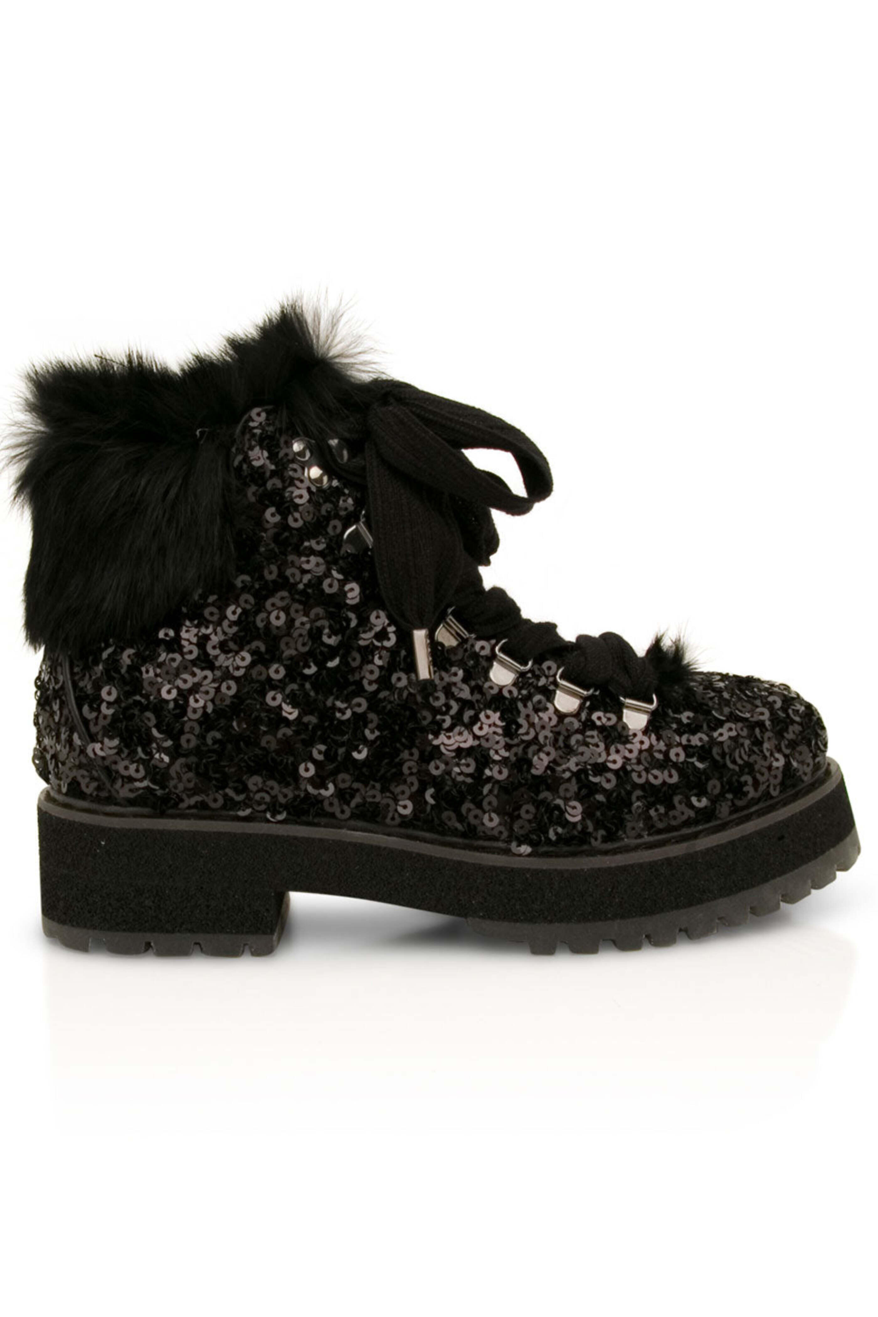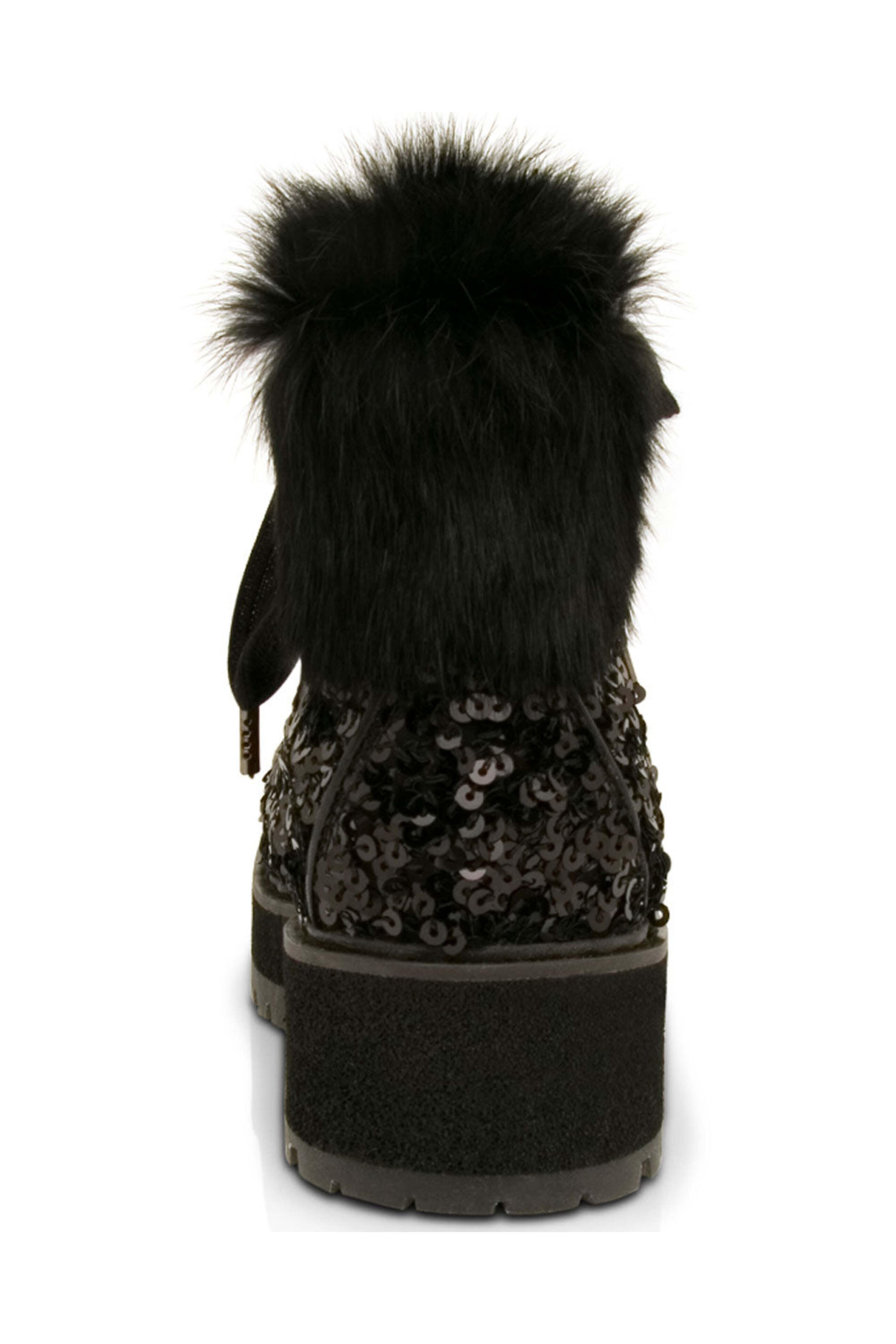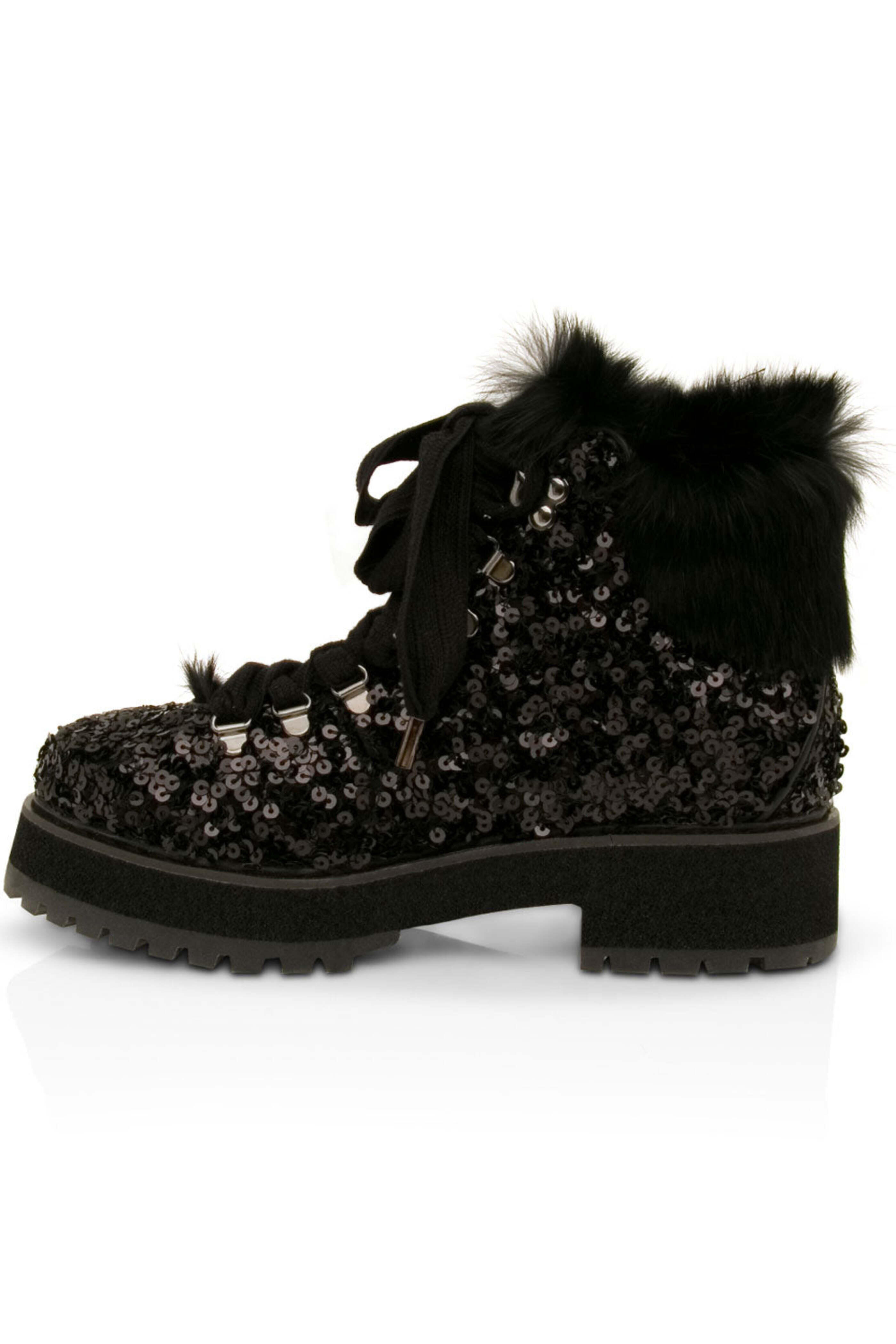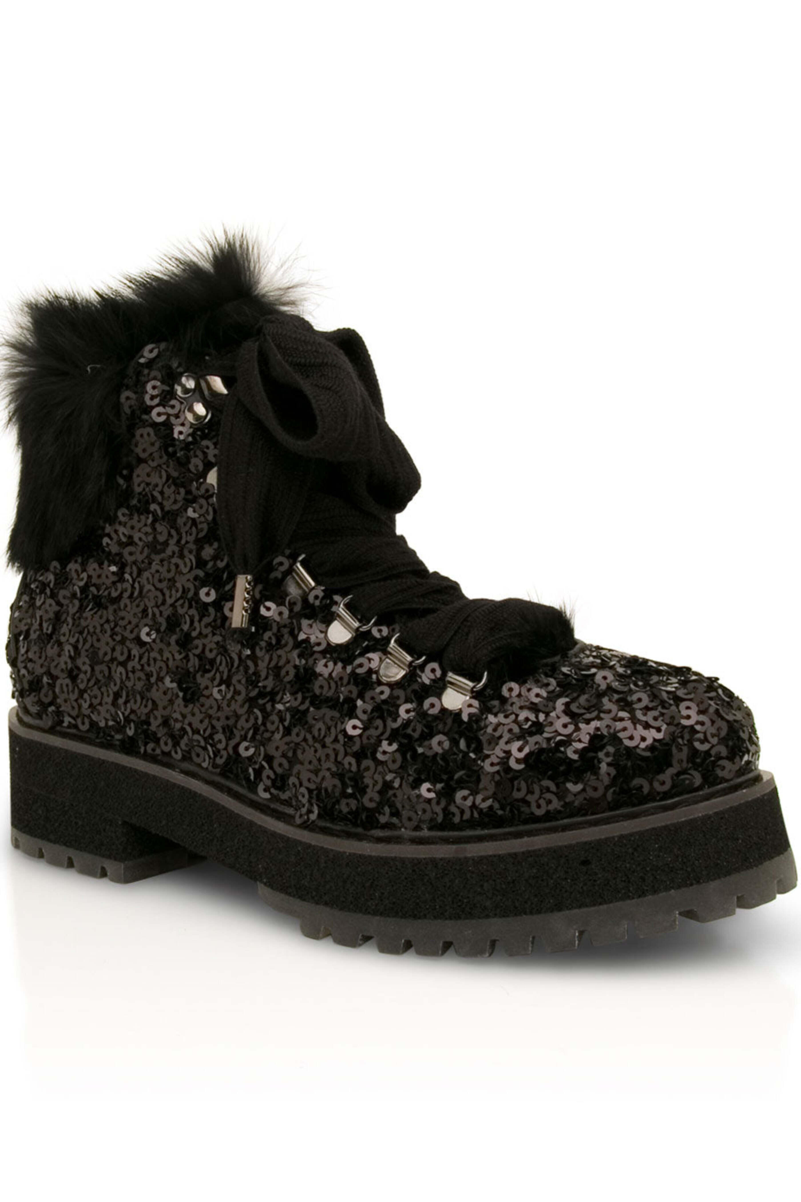AGL Apreski Special Bootie in Nero. Rounded toe. Lace up closure. Fur detail at ankle and tongue. 1 ½ in. platform. Leather upper; Embroidered sequins. Leather lining and footbed. Rubber lug sole. Made in Italy.