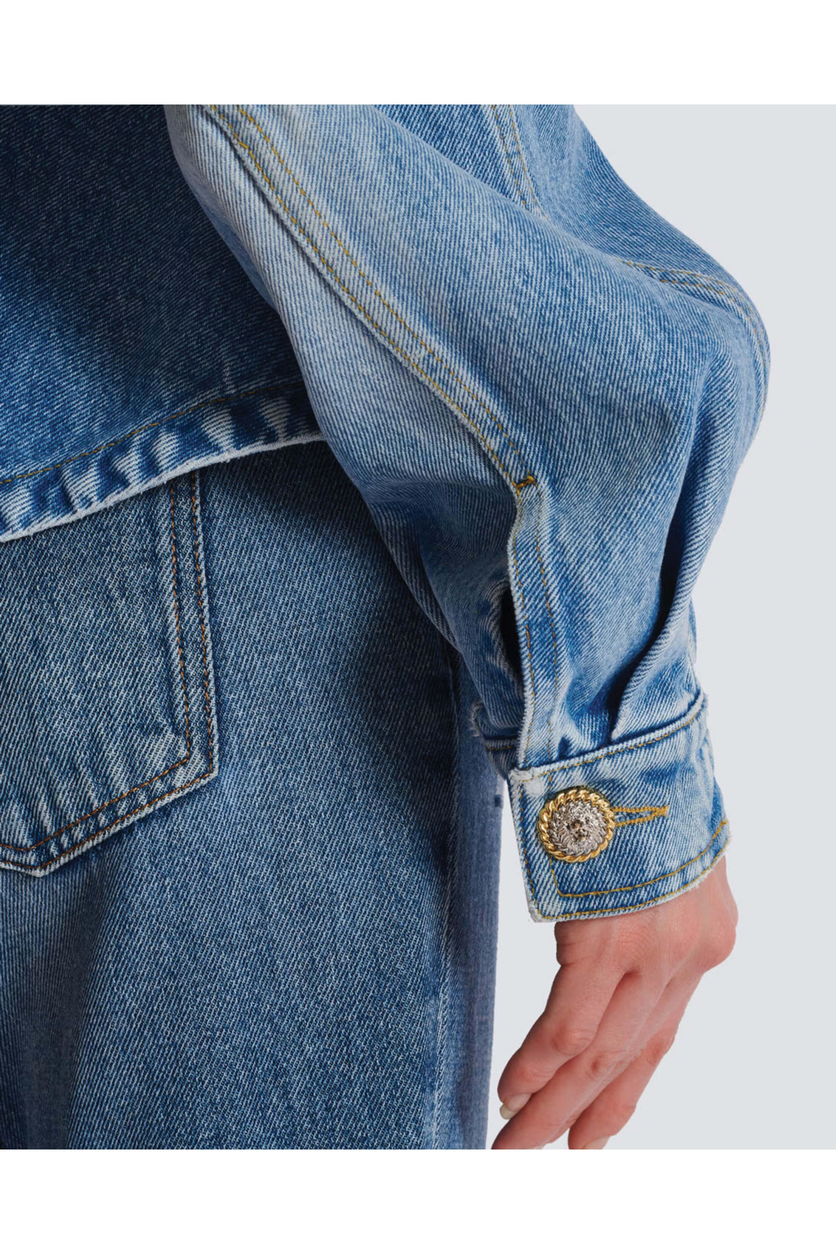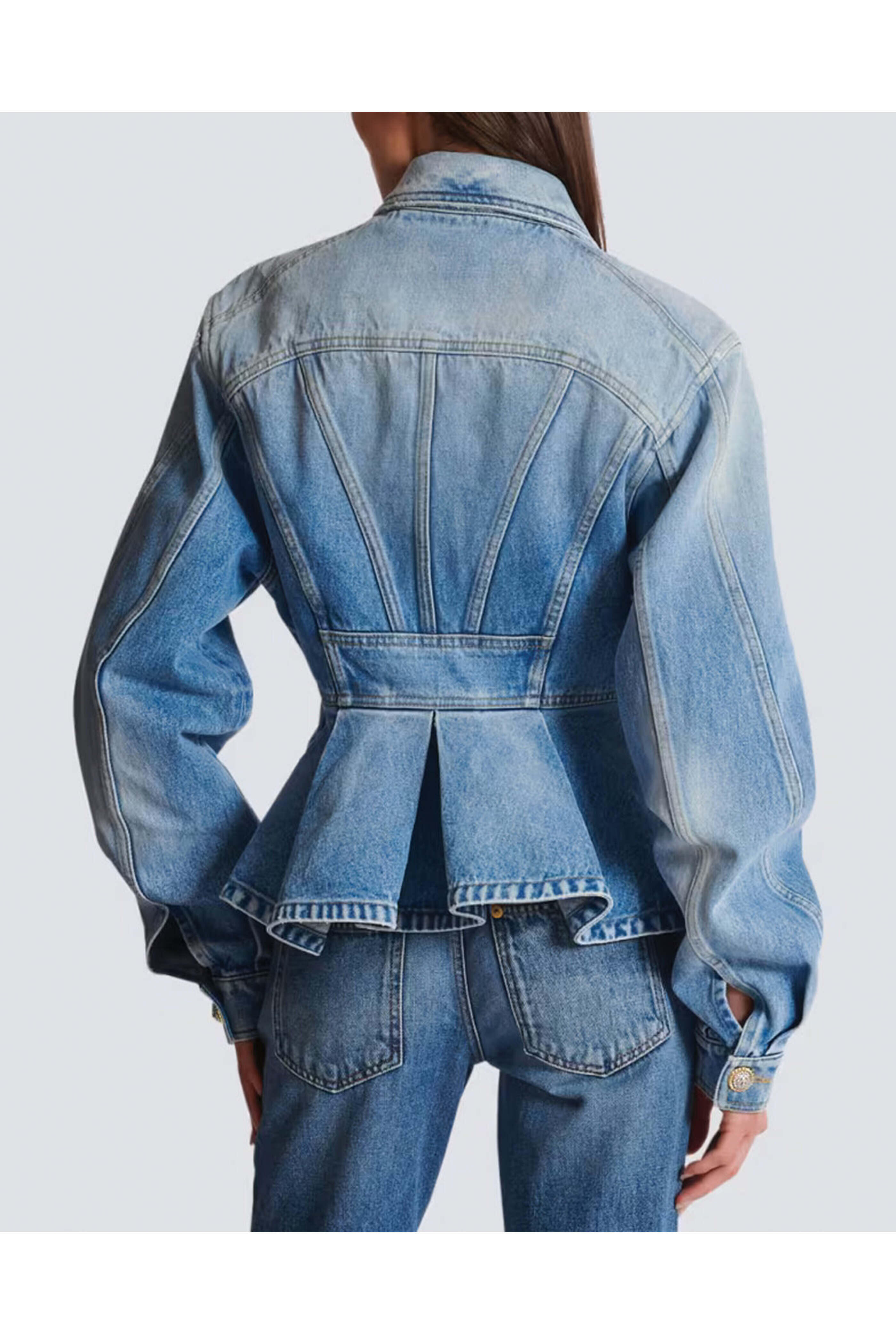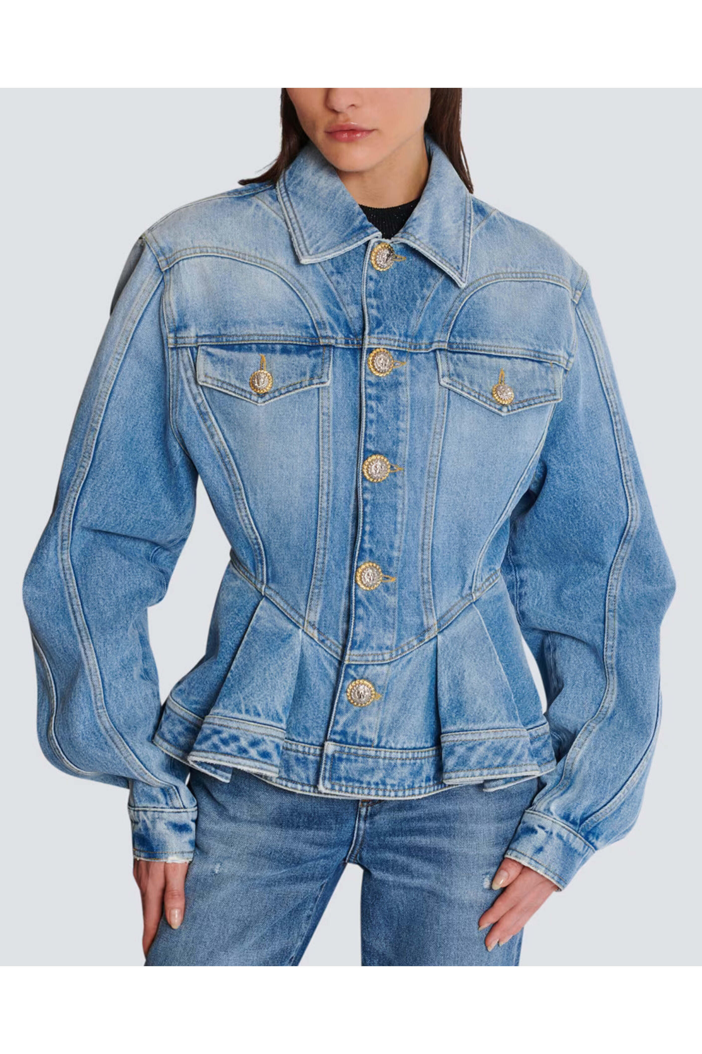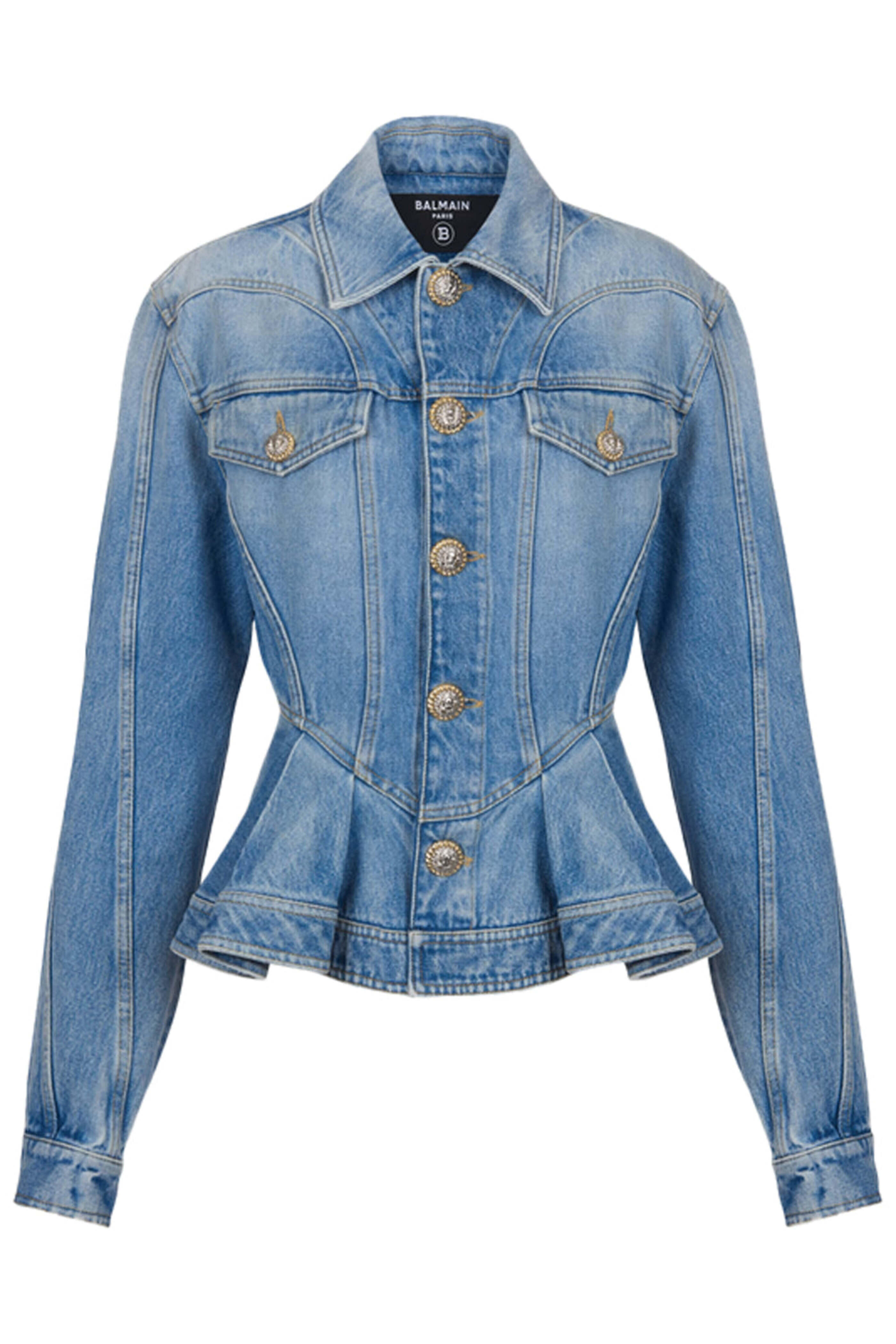 Balmain Ruffled Denim Jacket in Bleu. Collar. Long sleeves; button cuffs. Button down front closure. Chest flap pockets; button fastening. Gold and silver tone statement buttons. Peplum silhouette. Slim through waist. Denim fabrication. Made in Italy. 100% cotton.