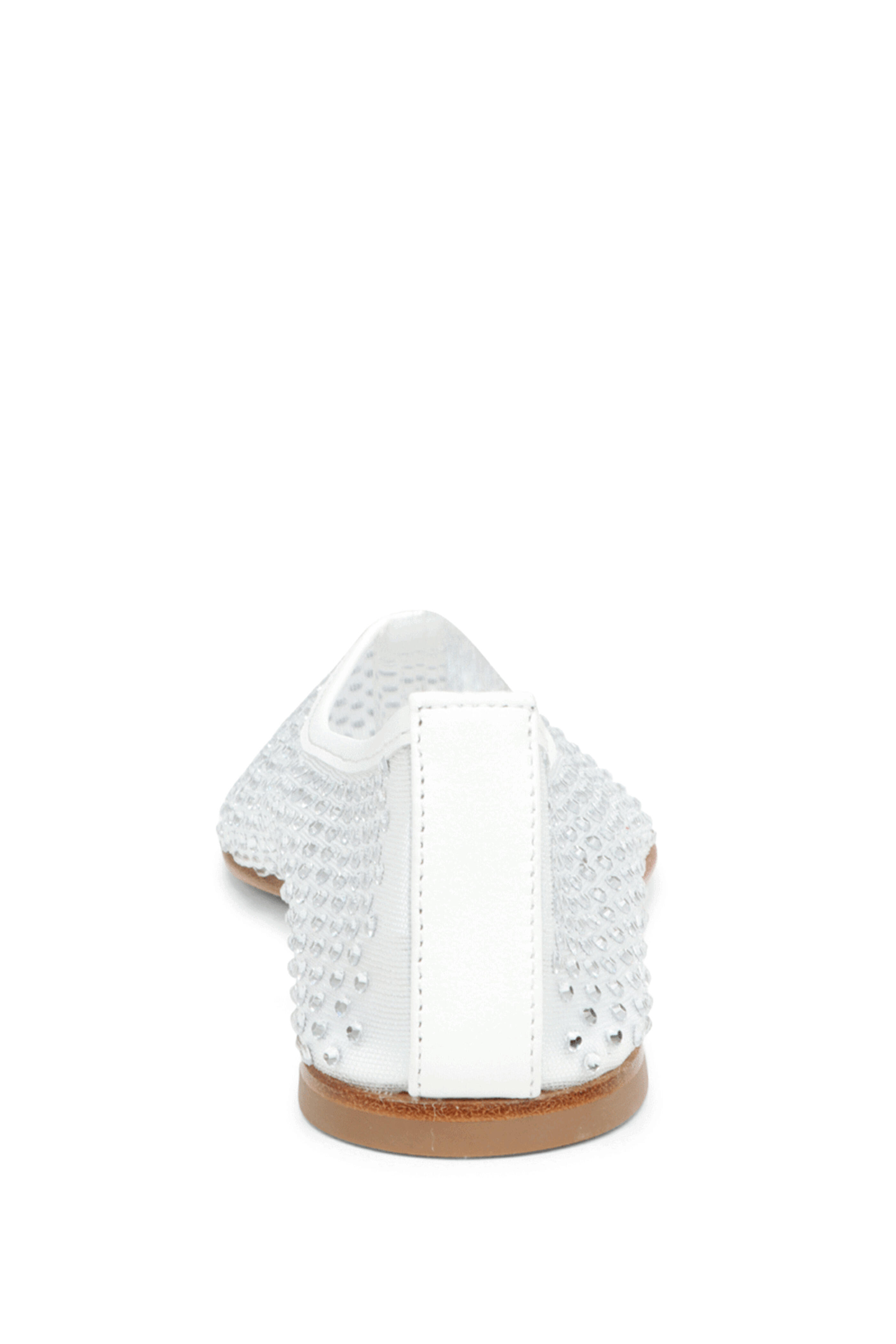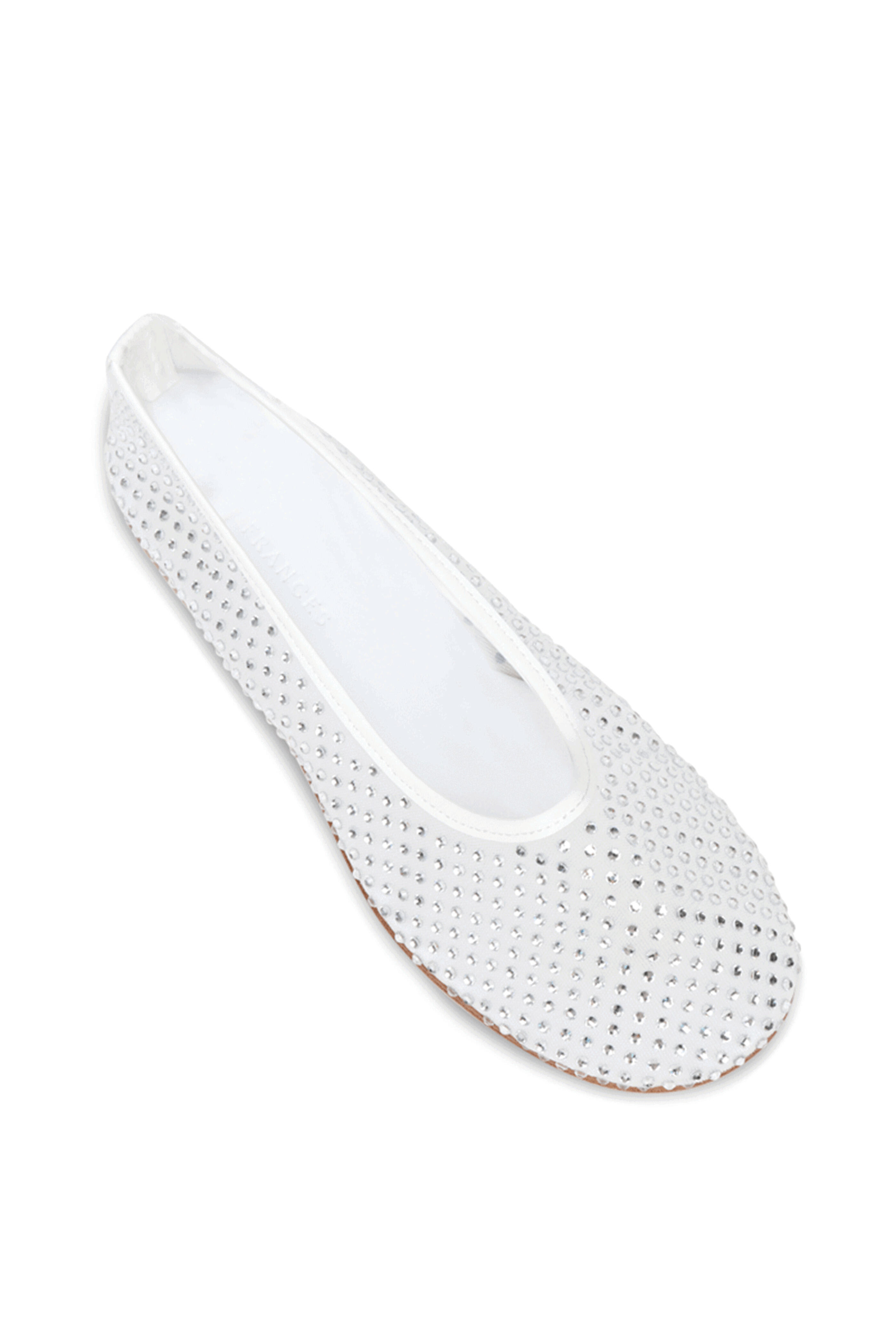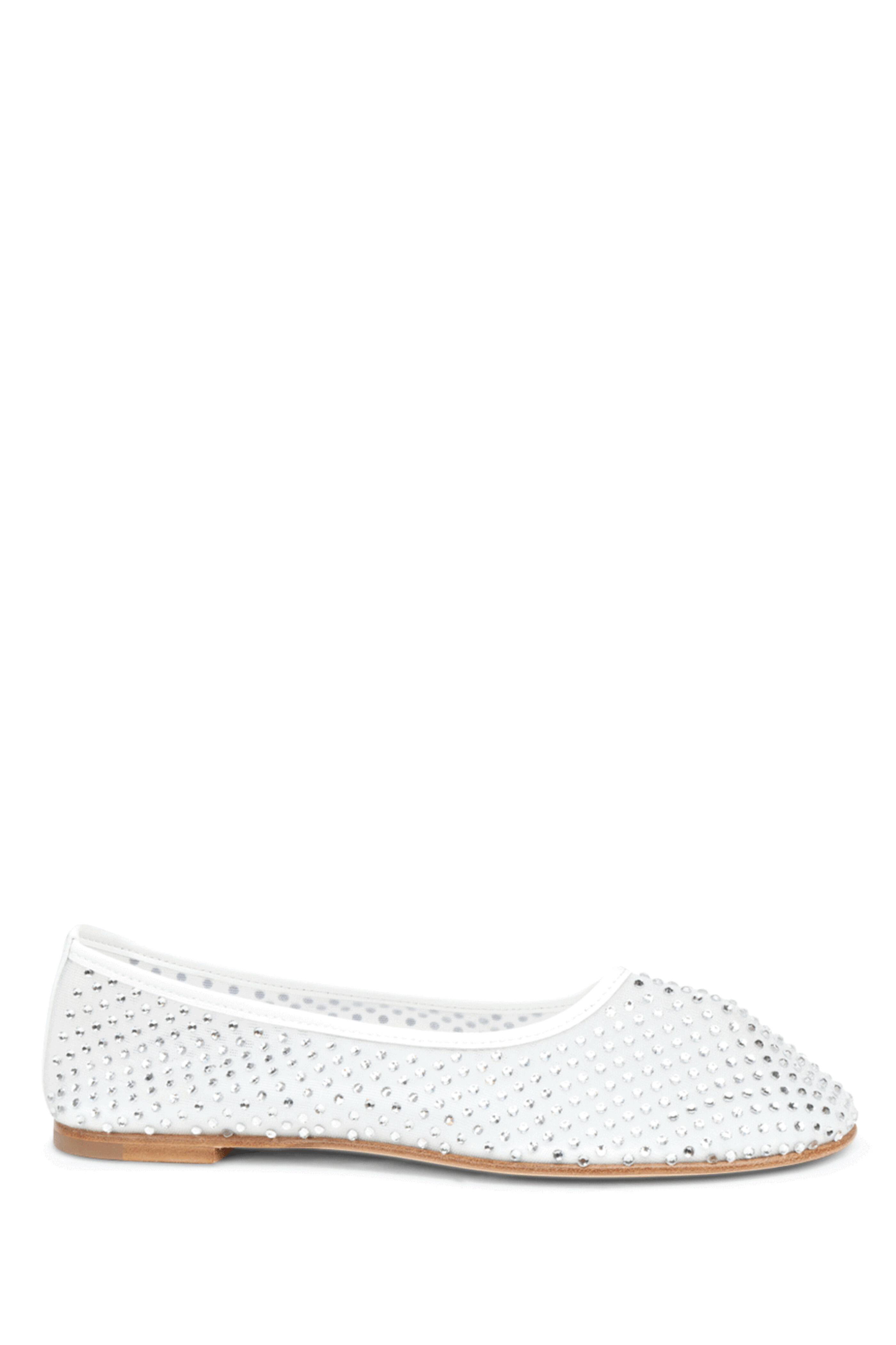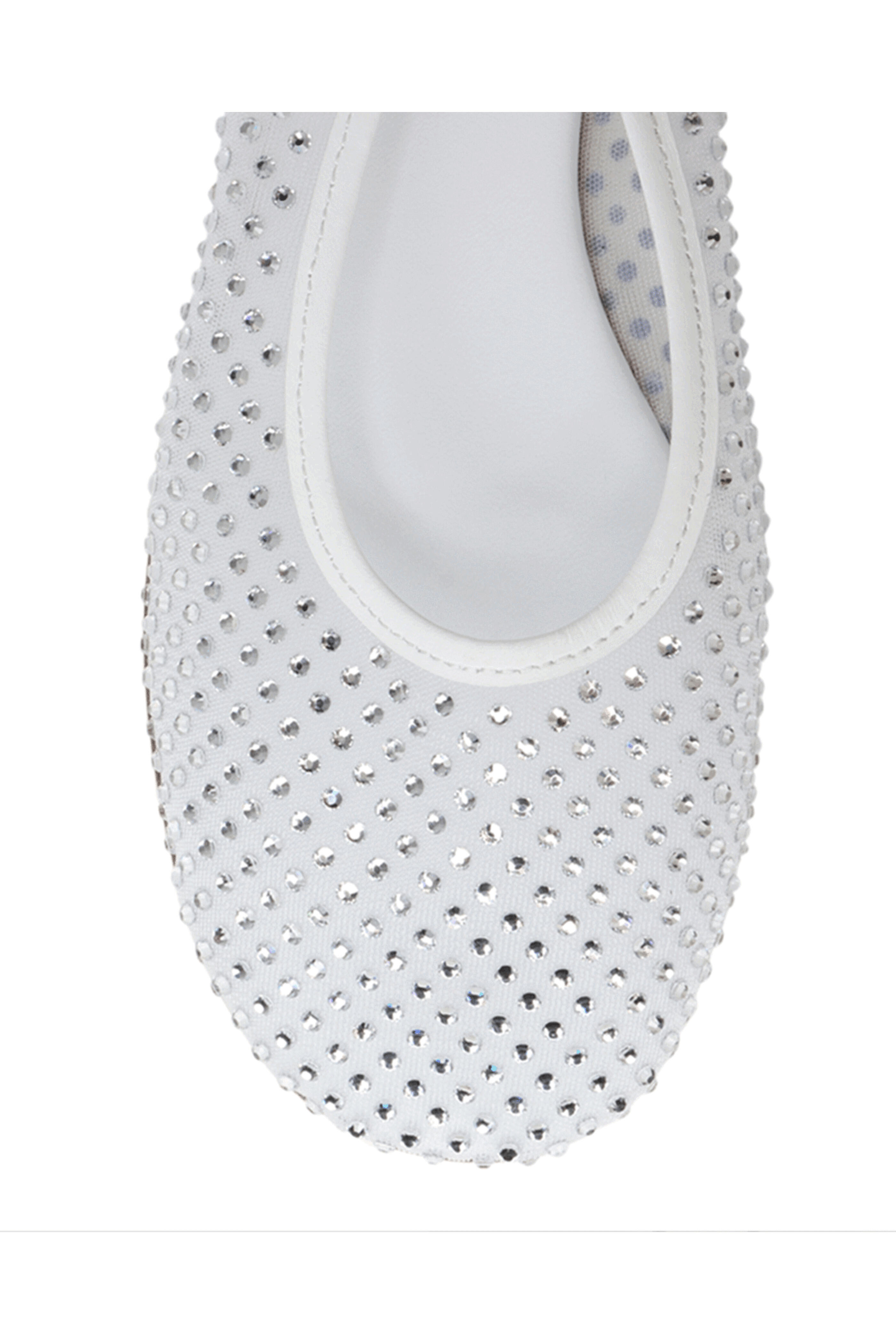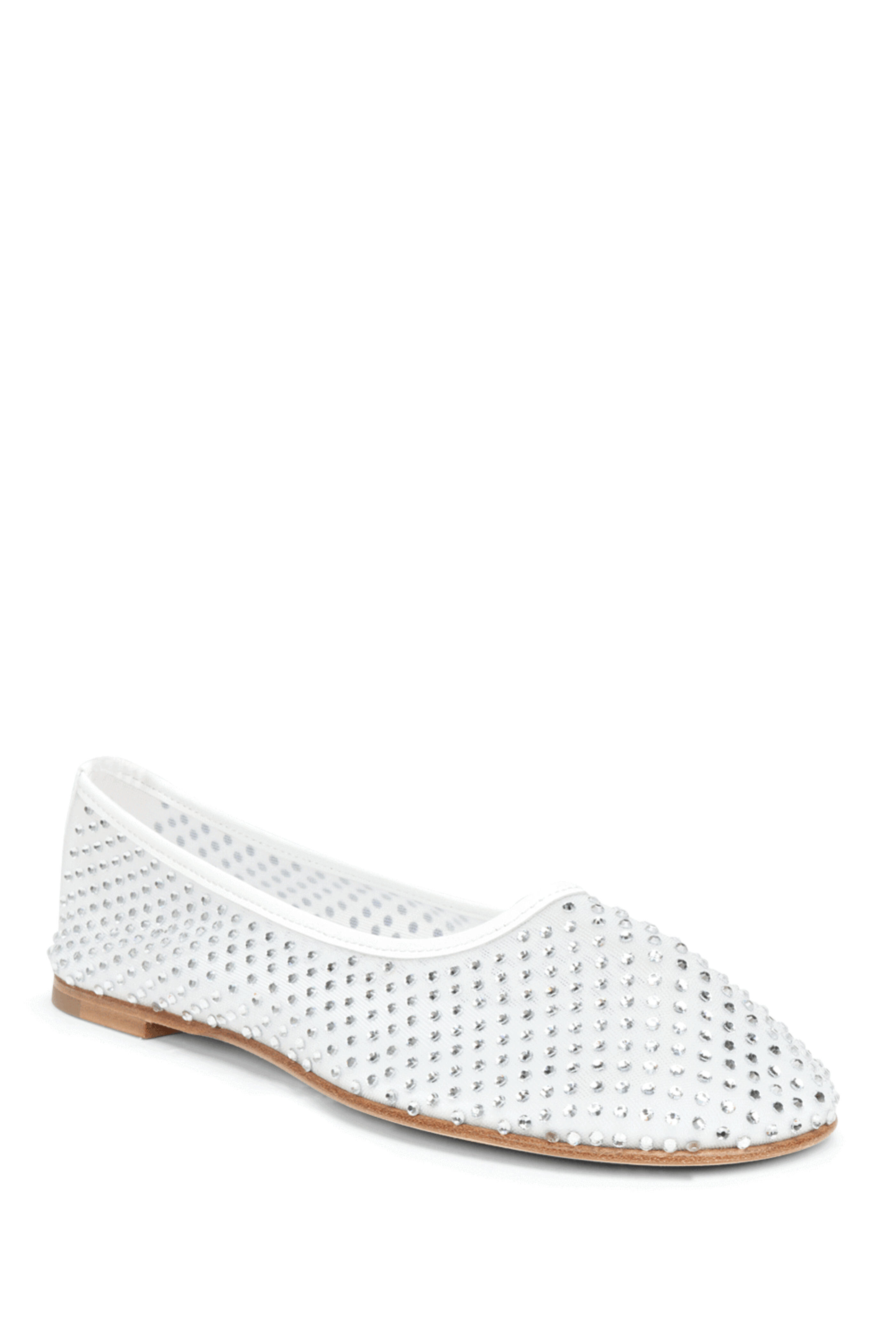 Sheer Italian mesh upper and lining. Round toe. Slip-on. Small rock crystals. Leather trim. Leather sole. Made in Italy.