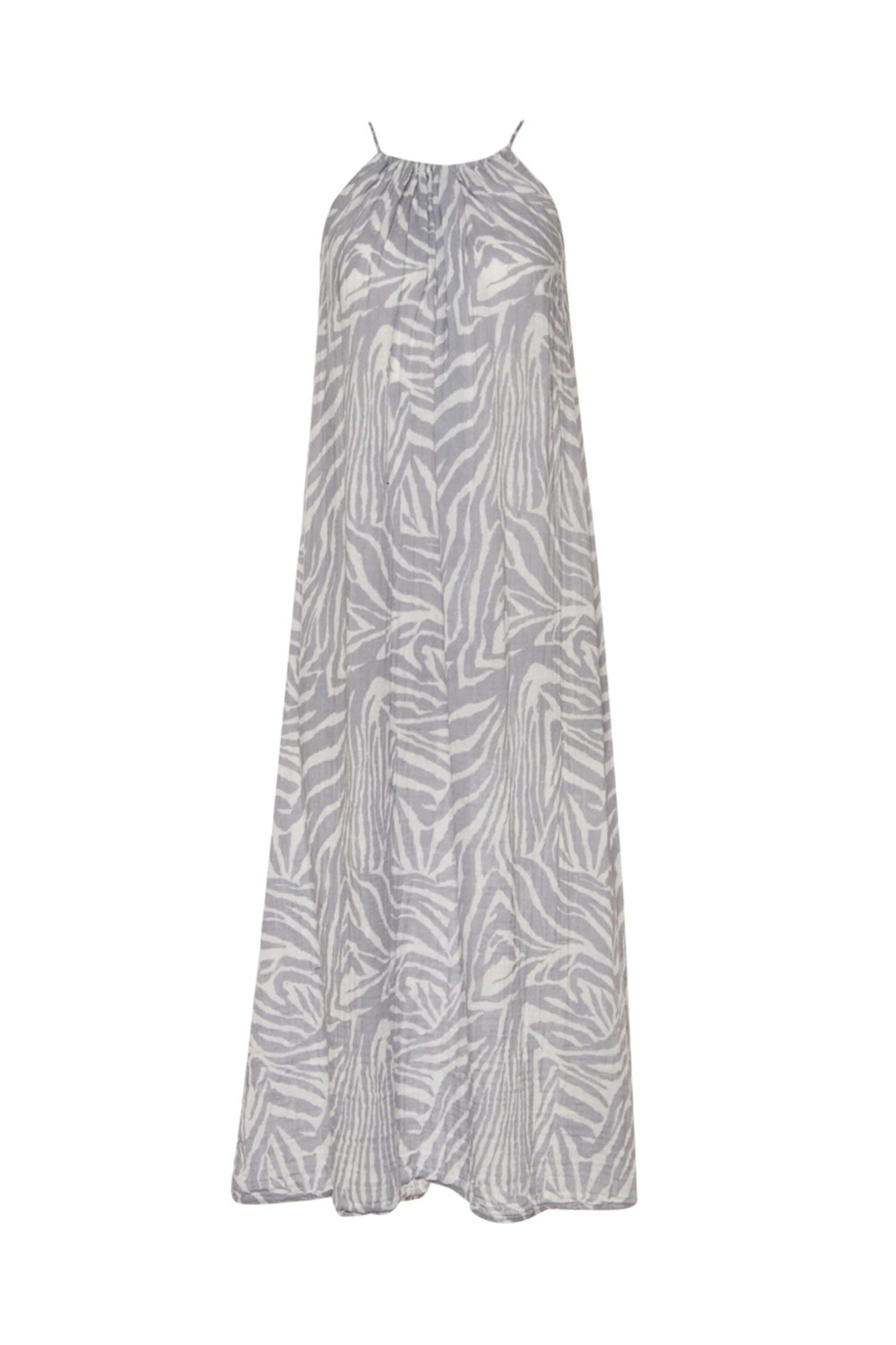 Michael Stars Sterling Zebra Print Naomi Maxi Dress Drawstring scoop neckline Sleeveless Relaxed fit Midi to maxi length Unlined 100% cotton Made in USA.