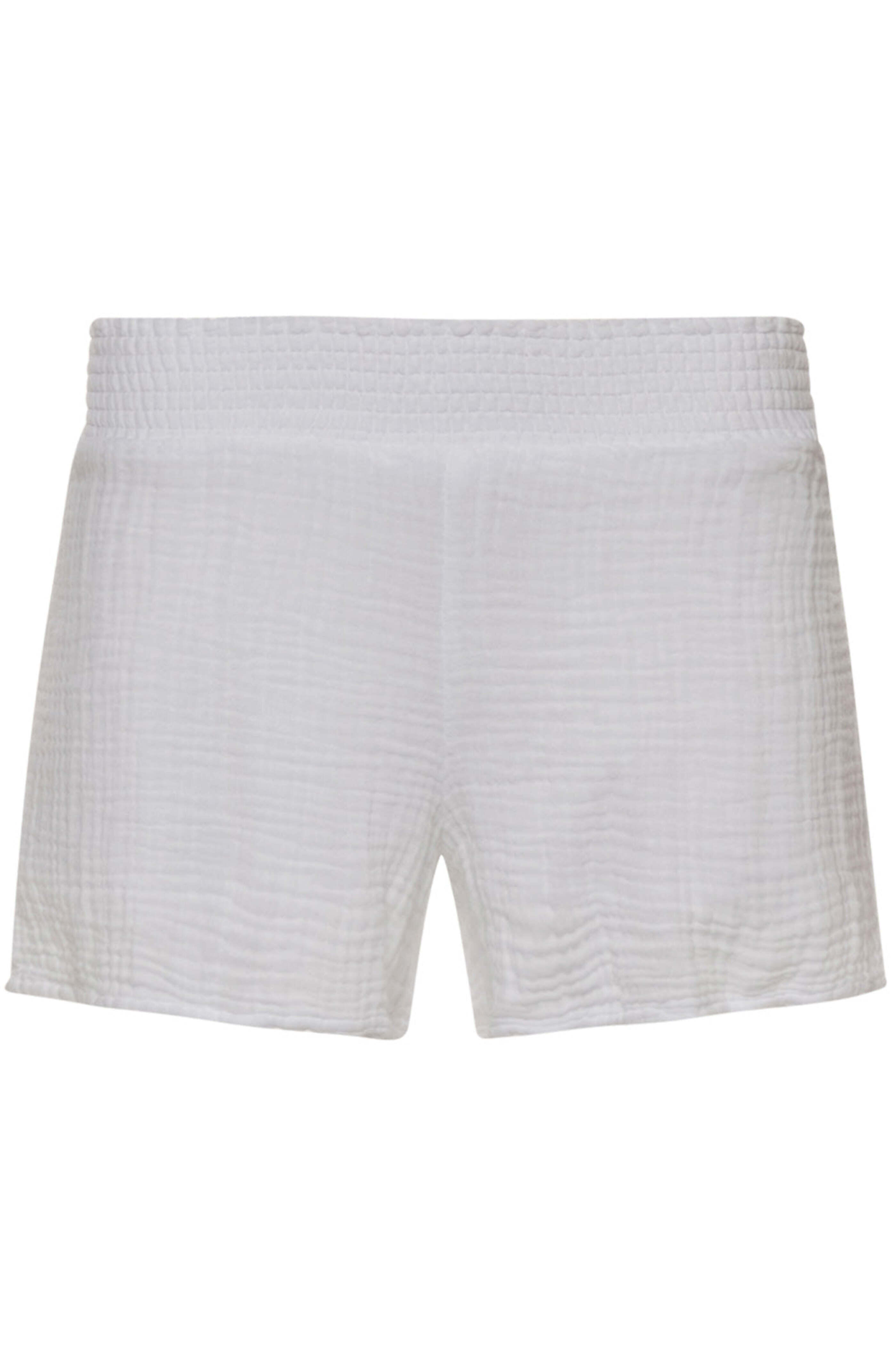 Michael Stars White Smocked Peggy Short Smocked waist Relaxed fit Lightweight gauze fabrication Frayed trim Lined 100% cotton Made in USA .