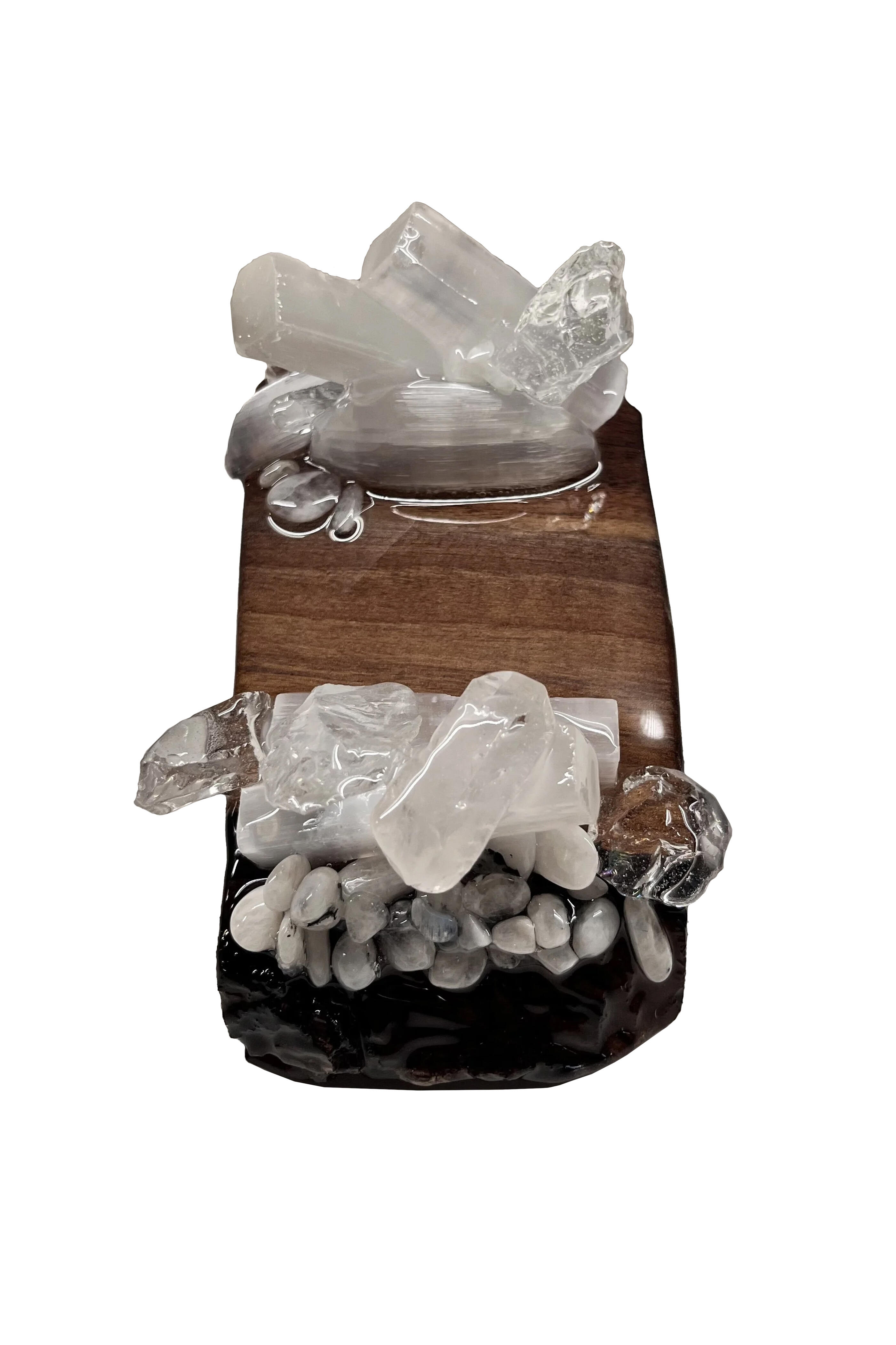 Made from rocks, crystals, and wood. Golds, business cards, recipe cards, place cards, tabletop serving pieces, eyeglasses, or mobile phone. Each artwork is handmade so colors or designs may vary. Made in Dallas, Texas.