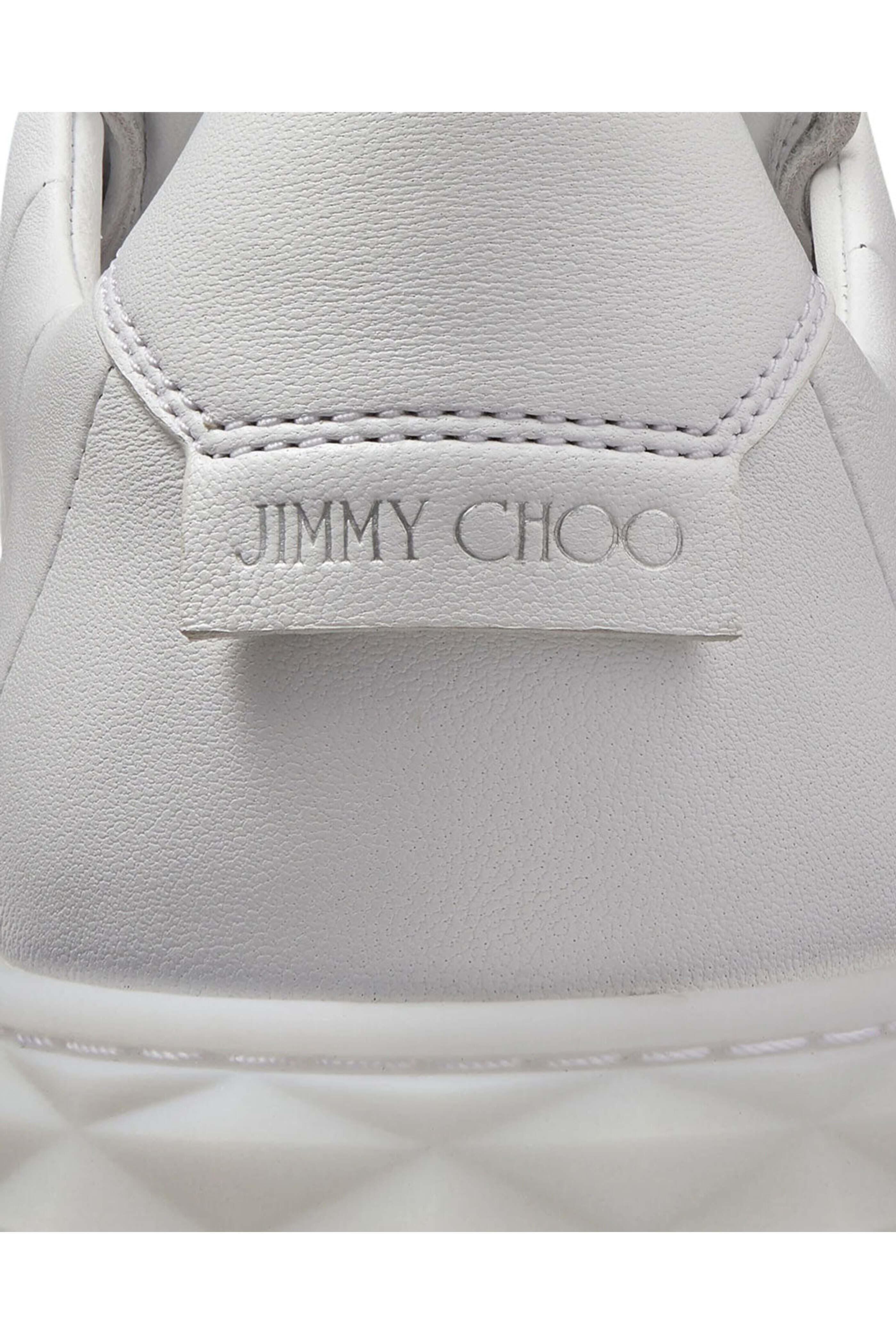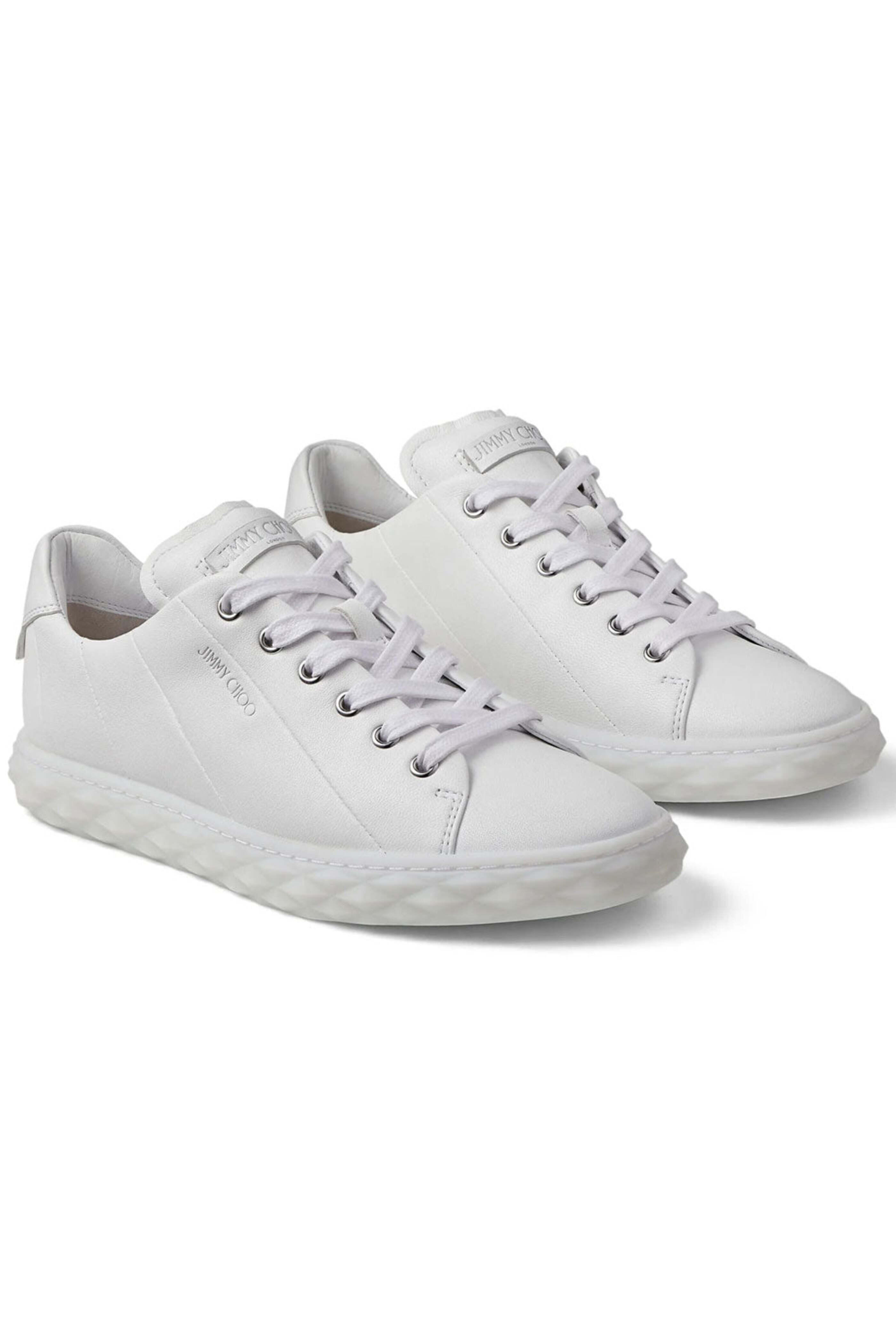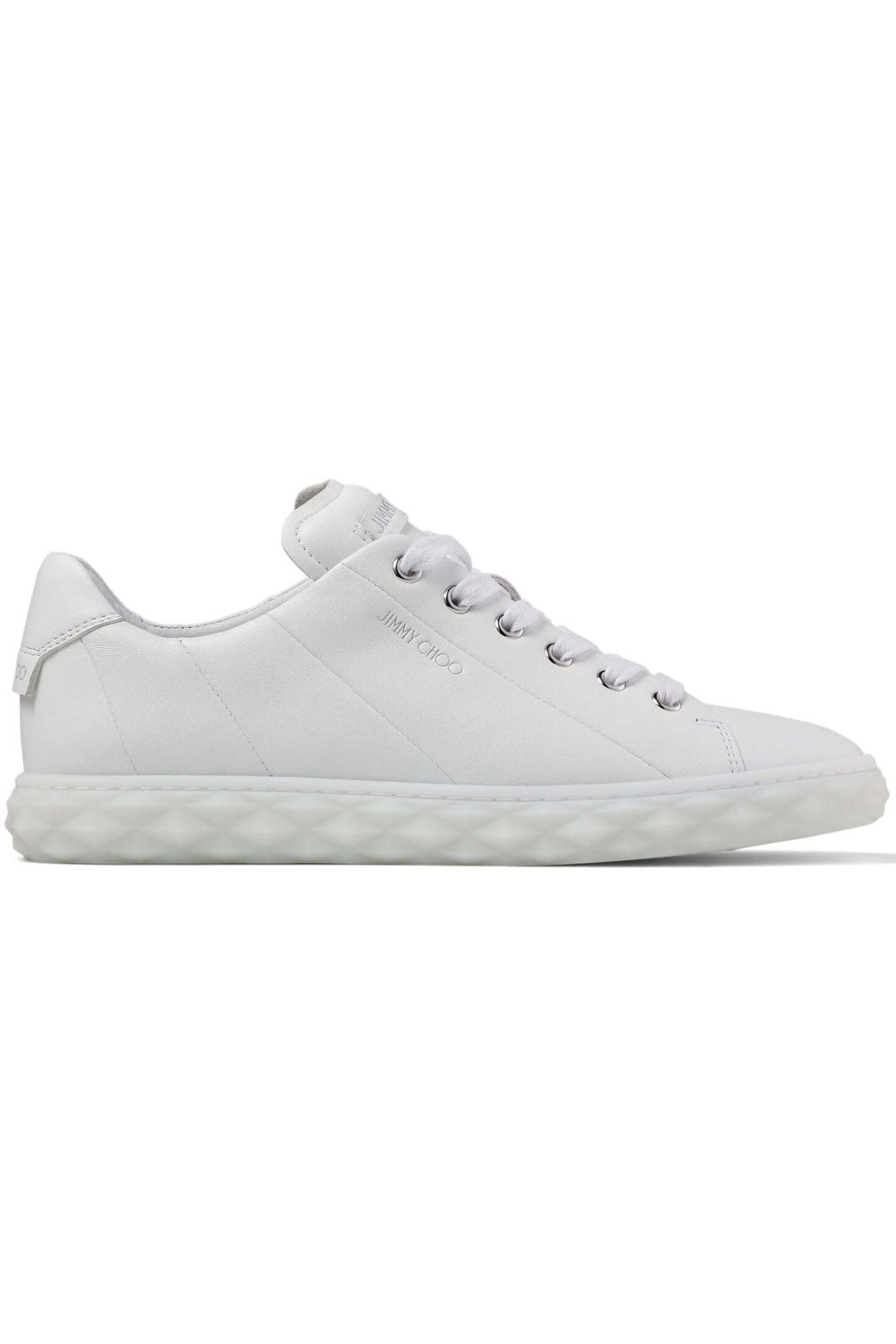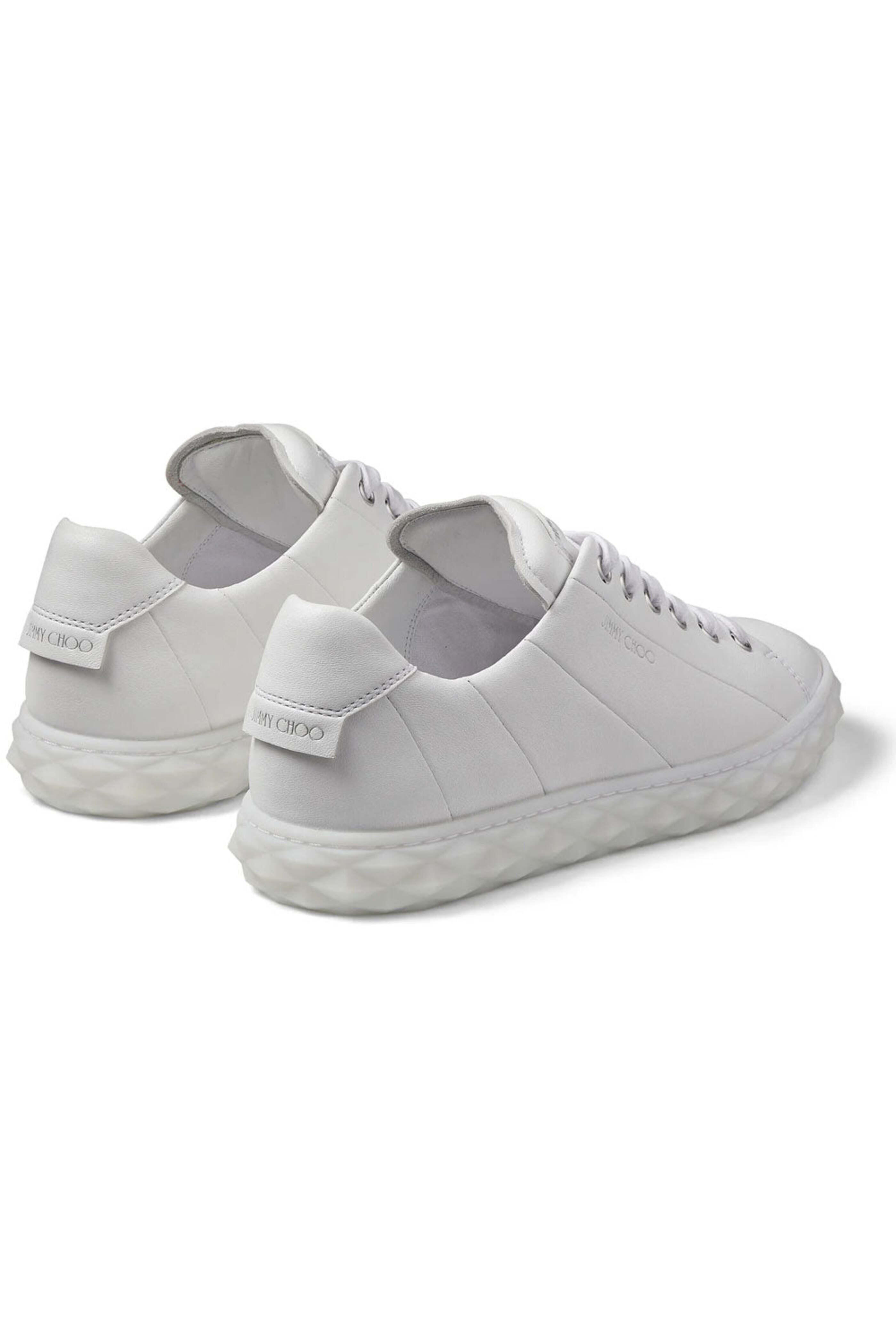 - Jimmy Choo Diamond Light Sneaker in White Nappa leather upper Low top sneaker Lace up front Flat laces Metal eyelets Rounded toe Cushioned collar and tongue Tonal stitching Leather lining and insole Padded footbed Rubber sole Made in Italy