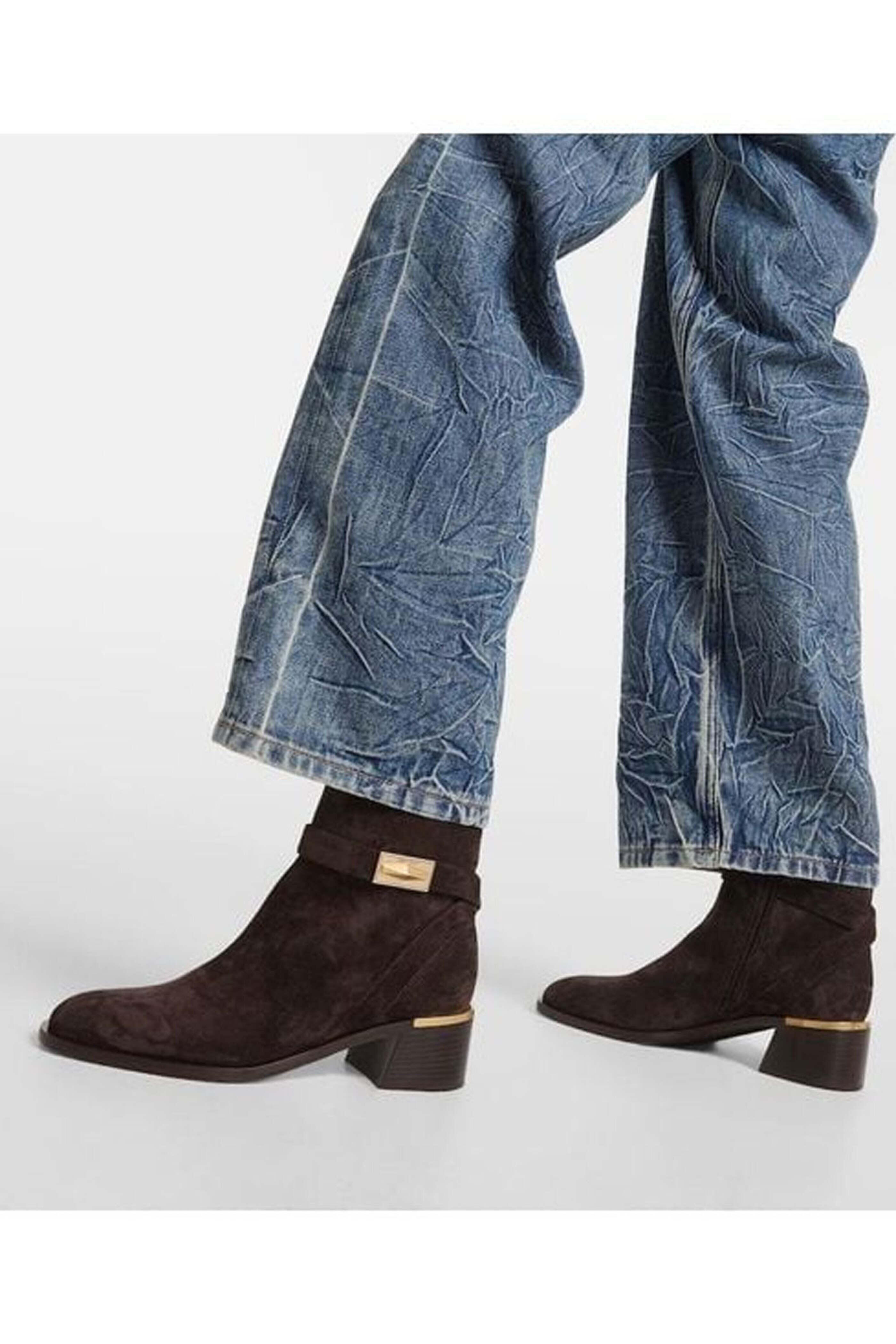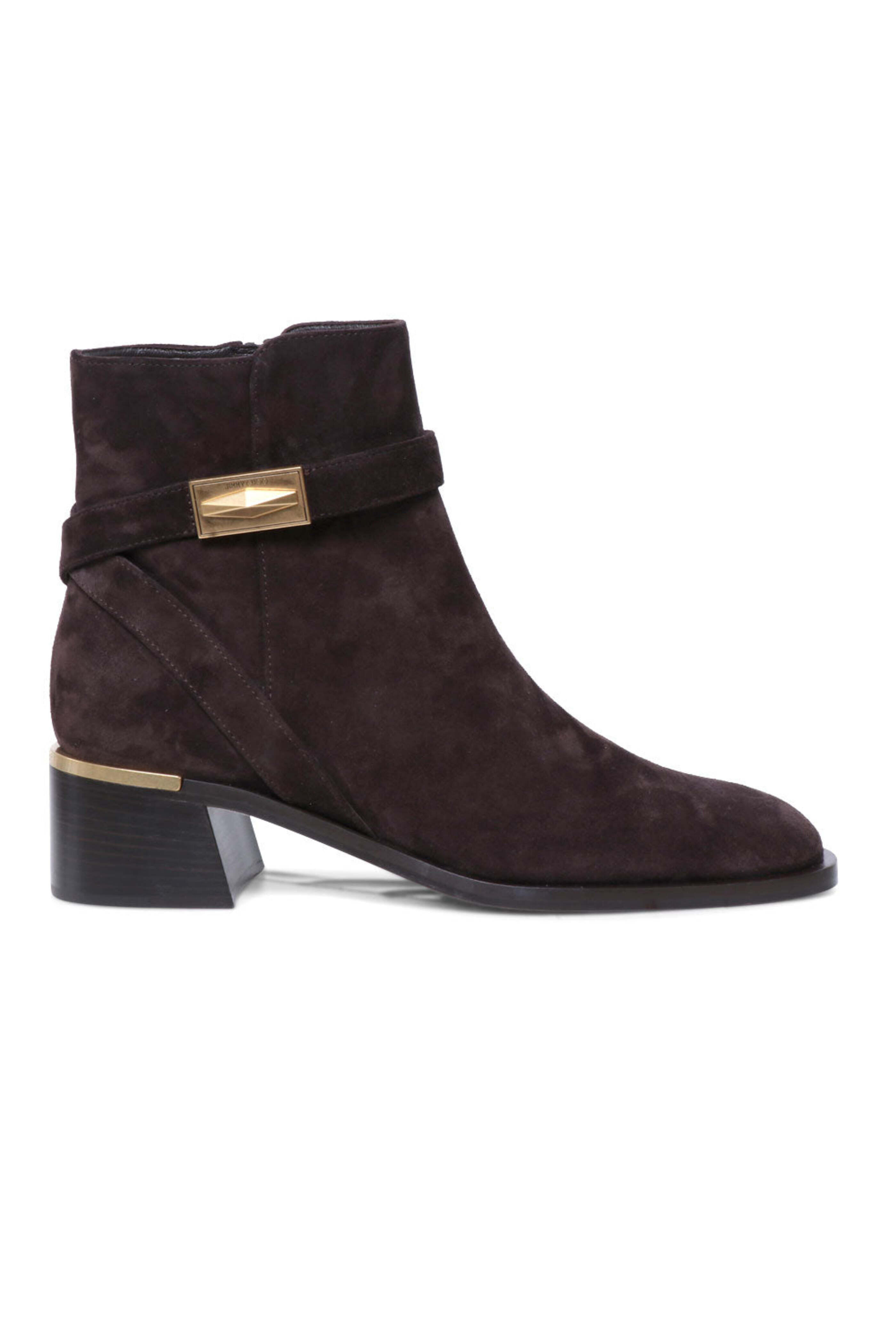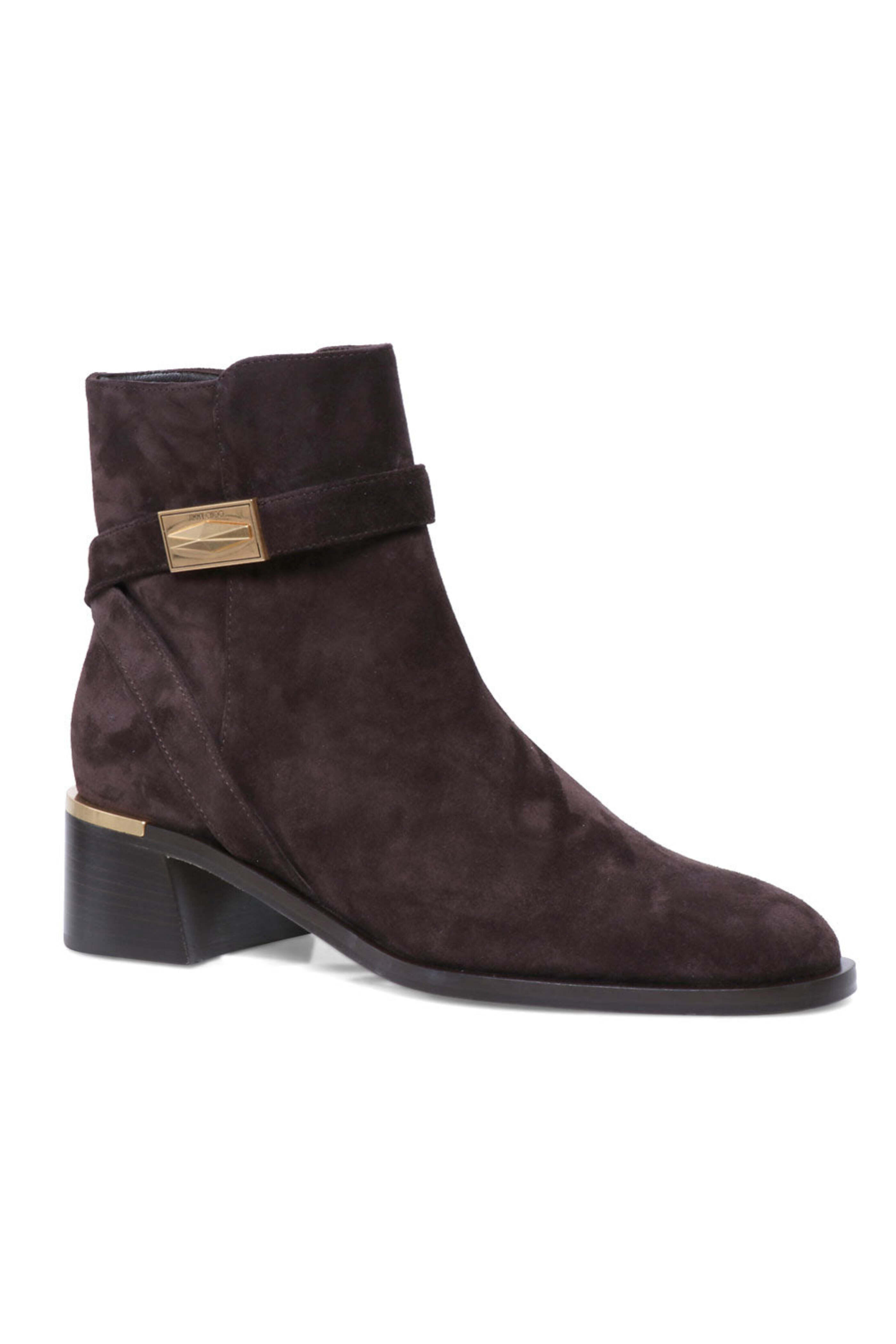 Jimmy Choo Diantha 45 Suede in Coffee. Round closed toe. Functional inside zip. Buckled strap detail. Leather upper, lining and sole. Made in Italy.