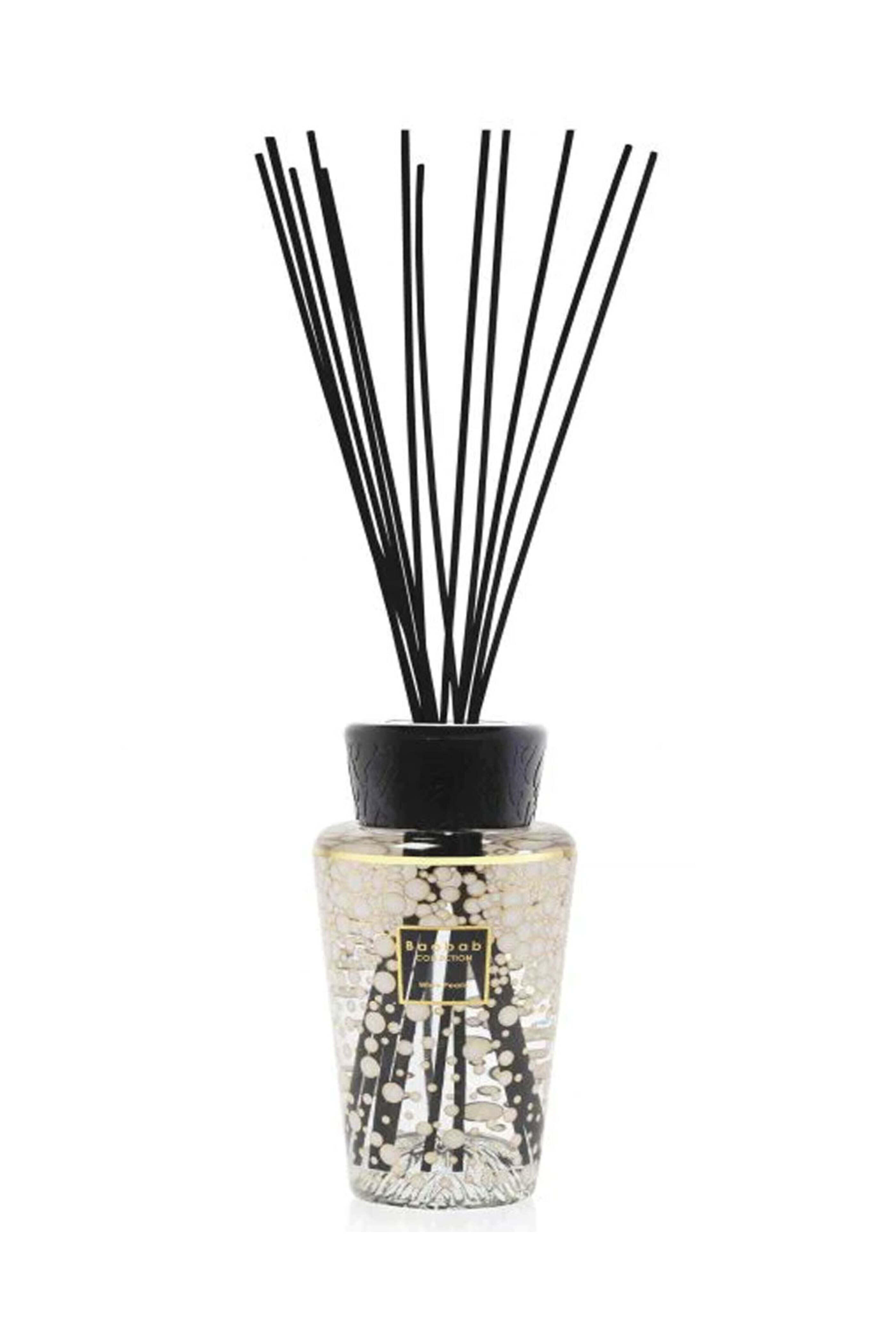 Baobab White Pearls Diffuser. Covered in 9-karat gold silkscreen print with a white pearl pattern. Black bakelite cap engraved with roots brings an elegant finish to the object. Notes of Orchid, Freesia, and Musk. 5. 500ml.
