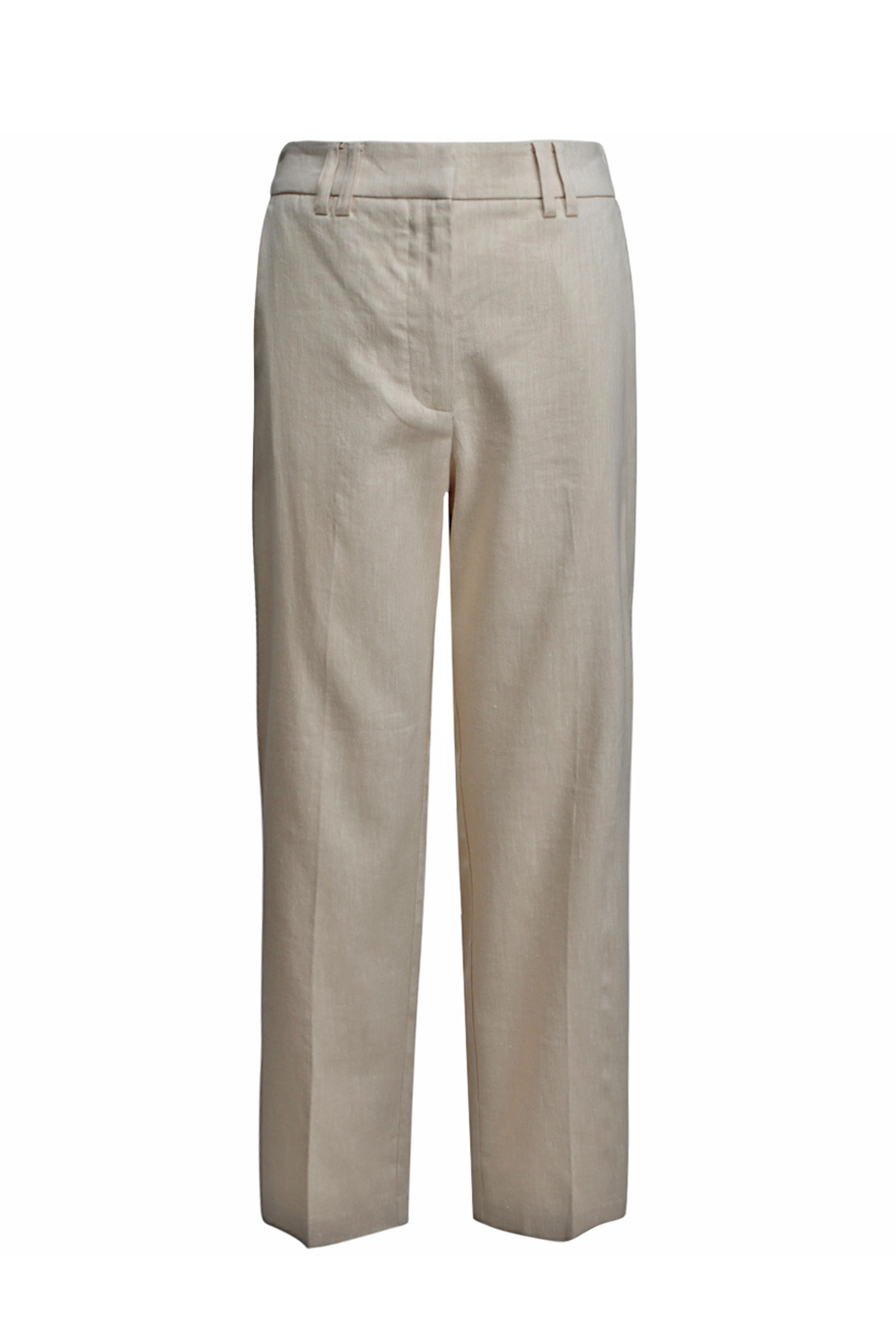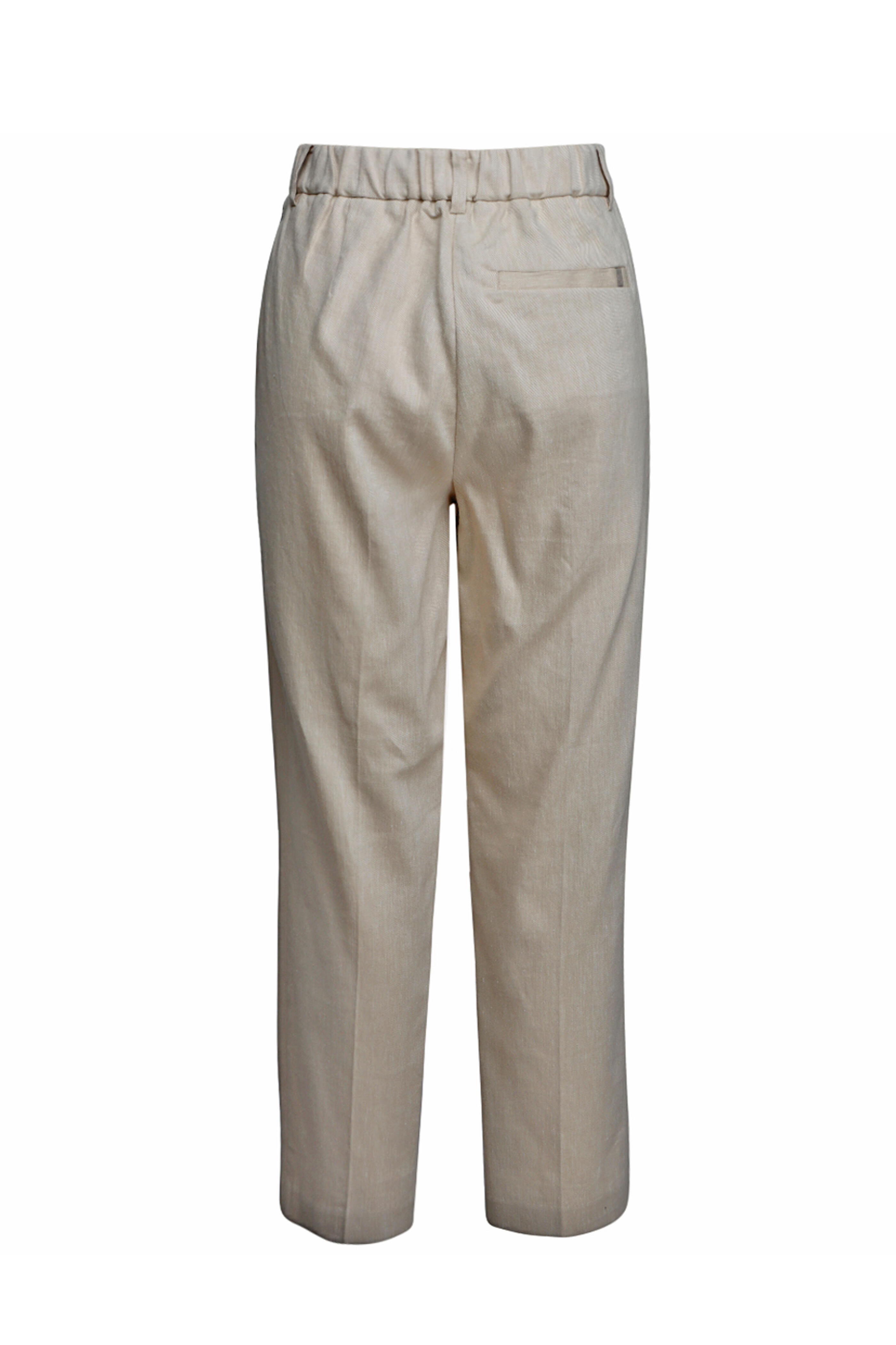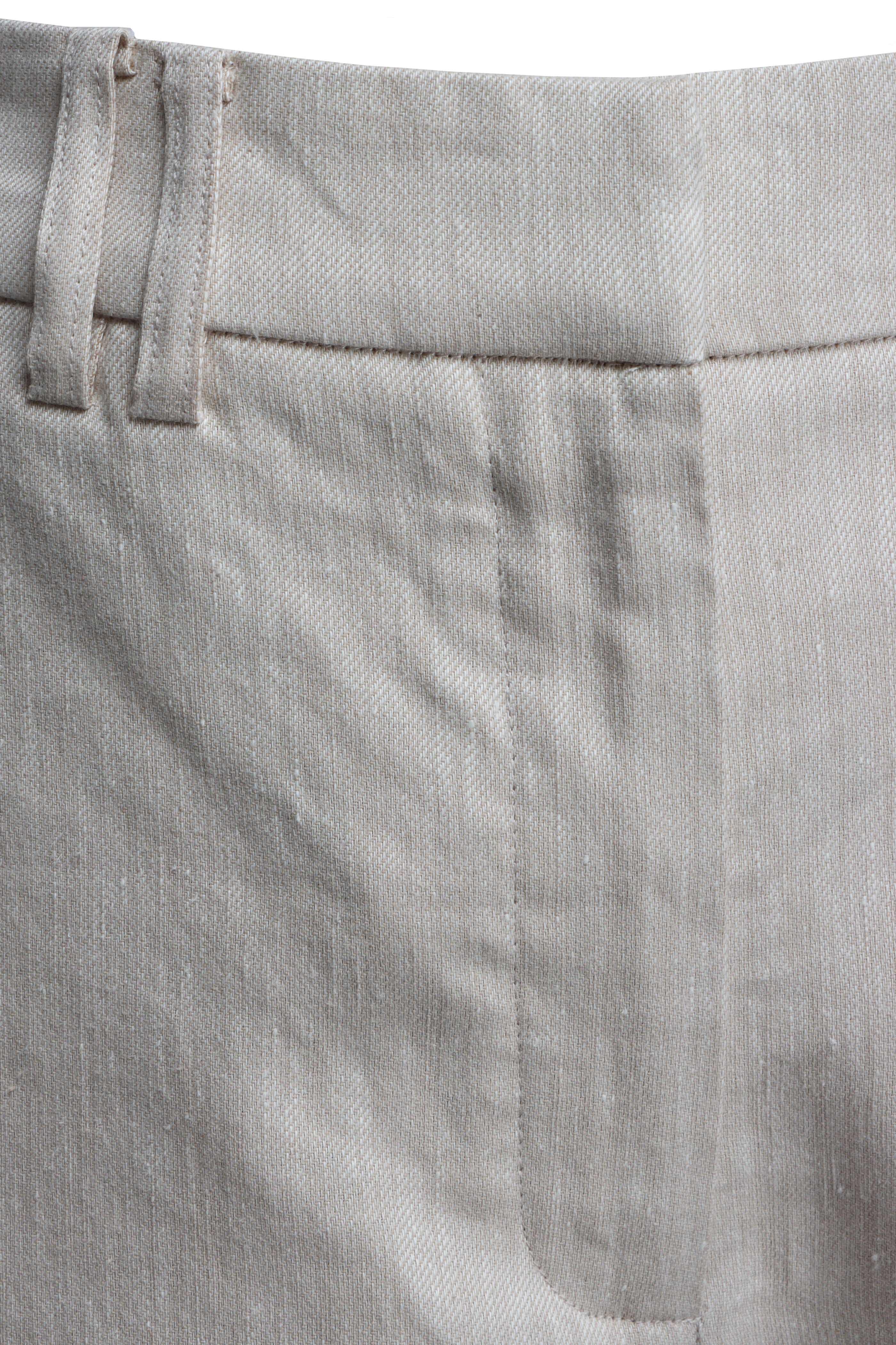 High rise. Elastic back waist. Hook and eye closure. Zip fly. Belt loops. Side slip pockets. Single back welt pocket. Straight silhouette. Cropped length. 50% cotton, 49% linen, 1% elastane.