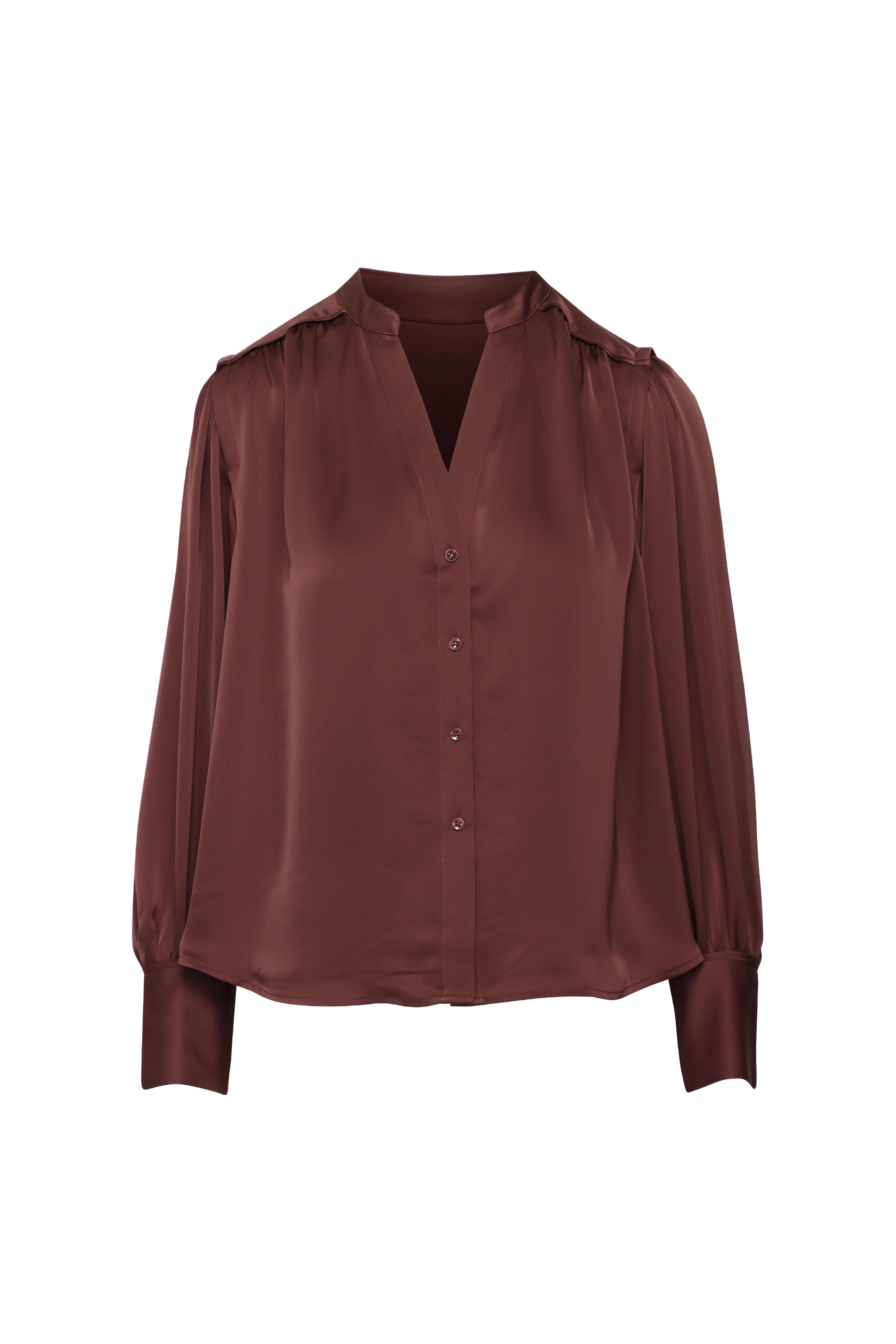Split v neck. Long sleeves; button cuffs. Button front closure. Shirred detail at shoulders and yoke. Relaxed fit. Imported. Bust 34” (Size S). Waist 26.5” (Size S). 100% polyester. Dry clean.