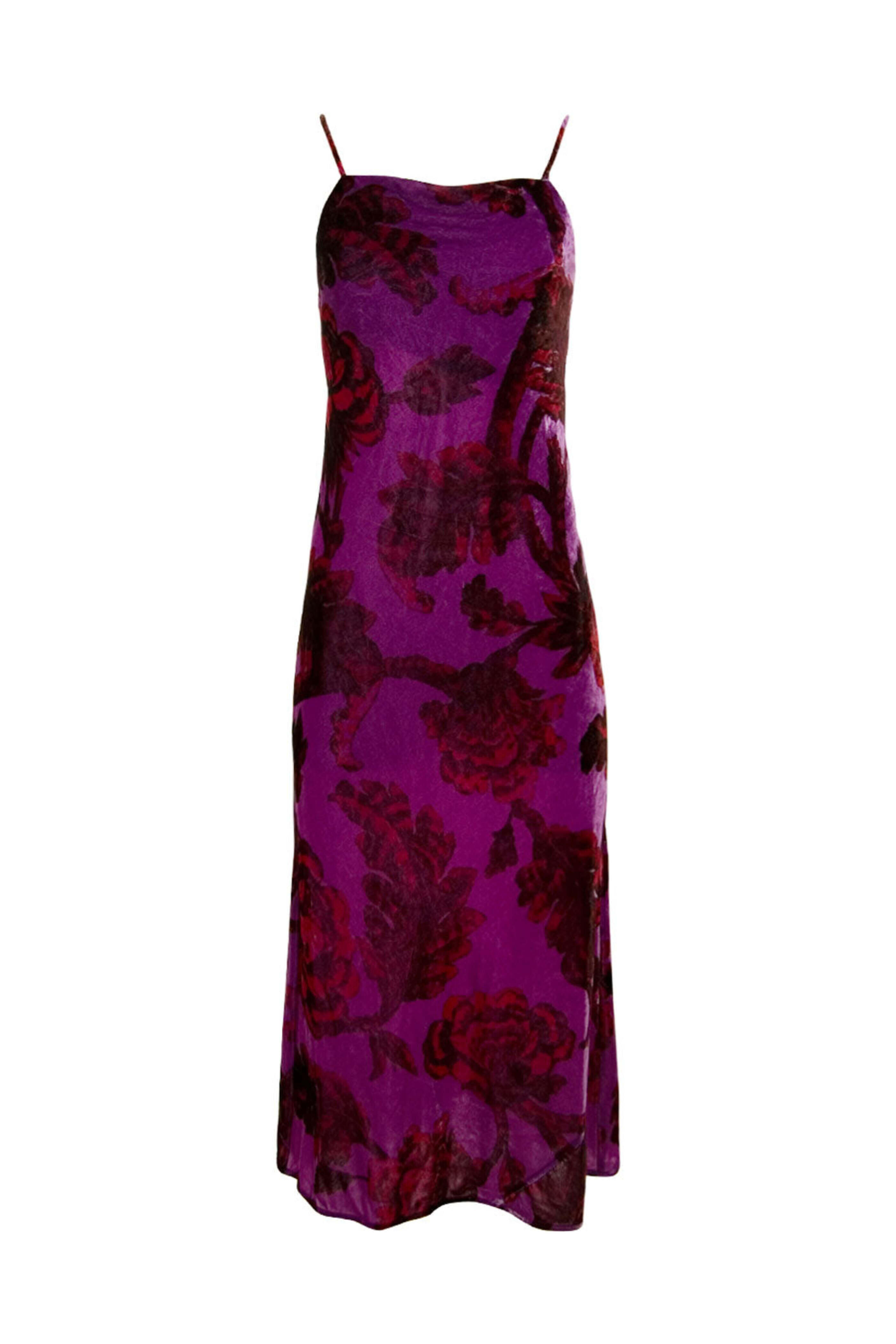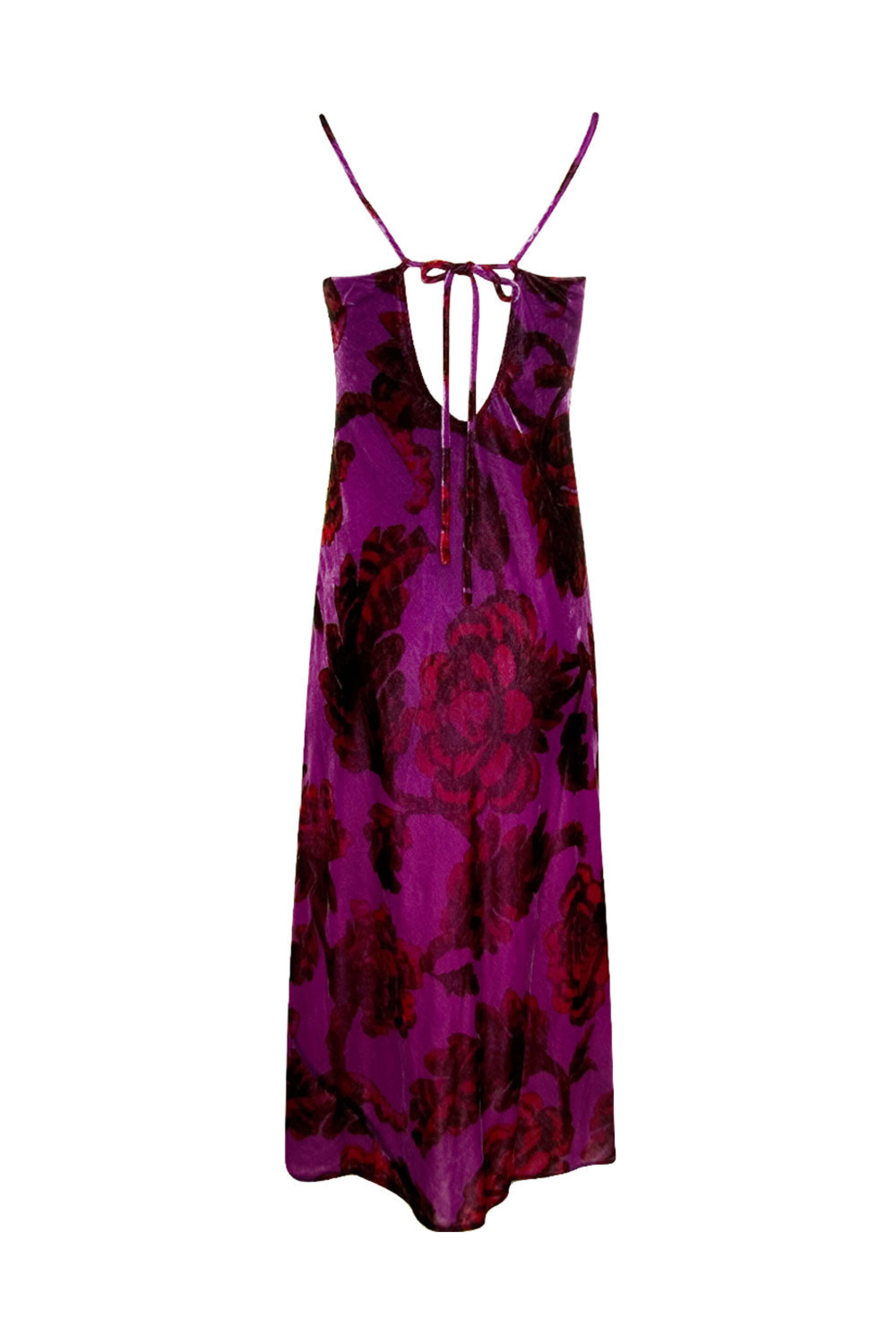 Rhode Camellia Vine Crocus Jemima Dress. Cowl neck. Spaghetti straps. Back cut out detail; self tie closure. Midi length. Slim fit. Velvet fabrication. 75% Rayon, 25% Nylon.
