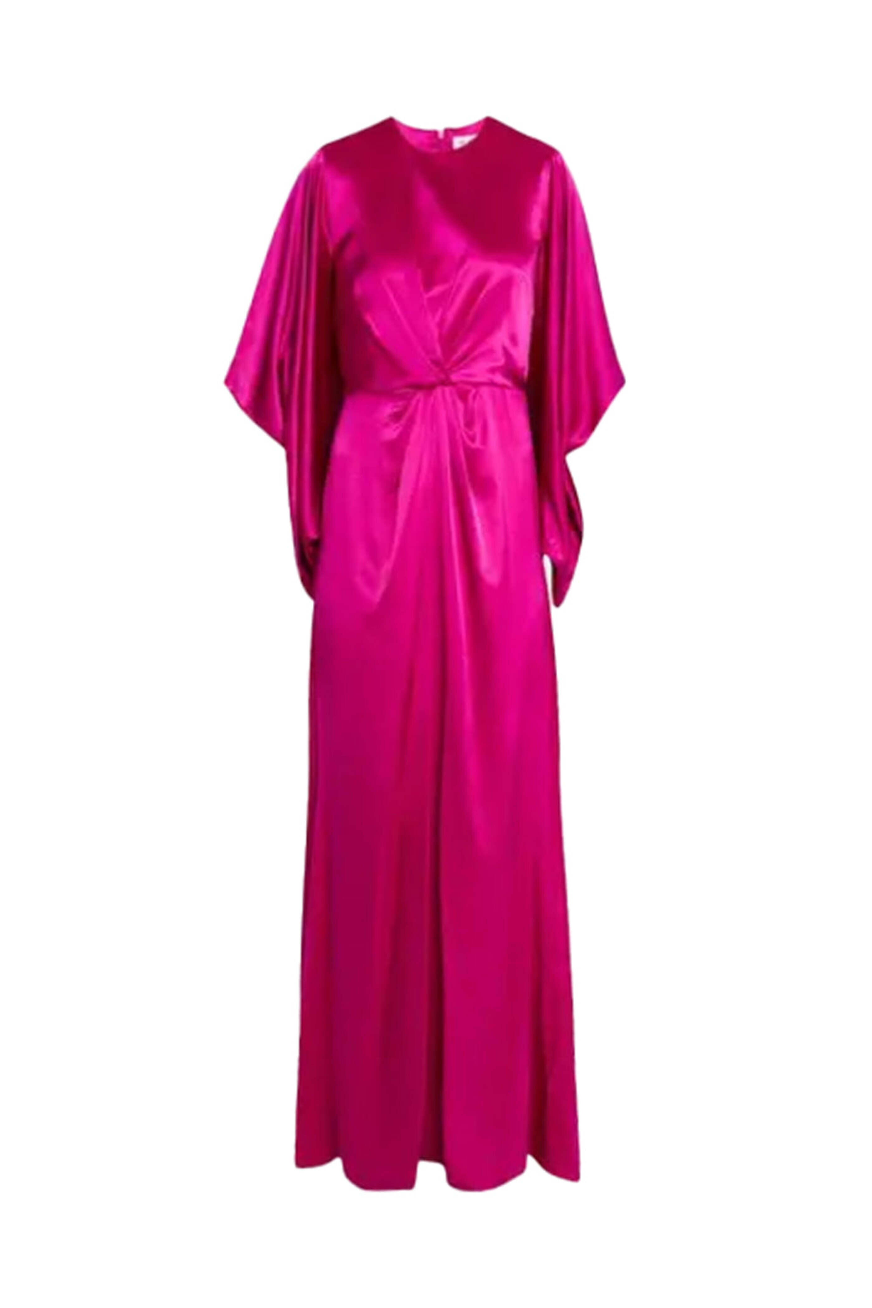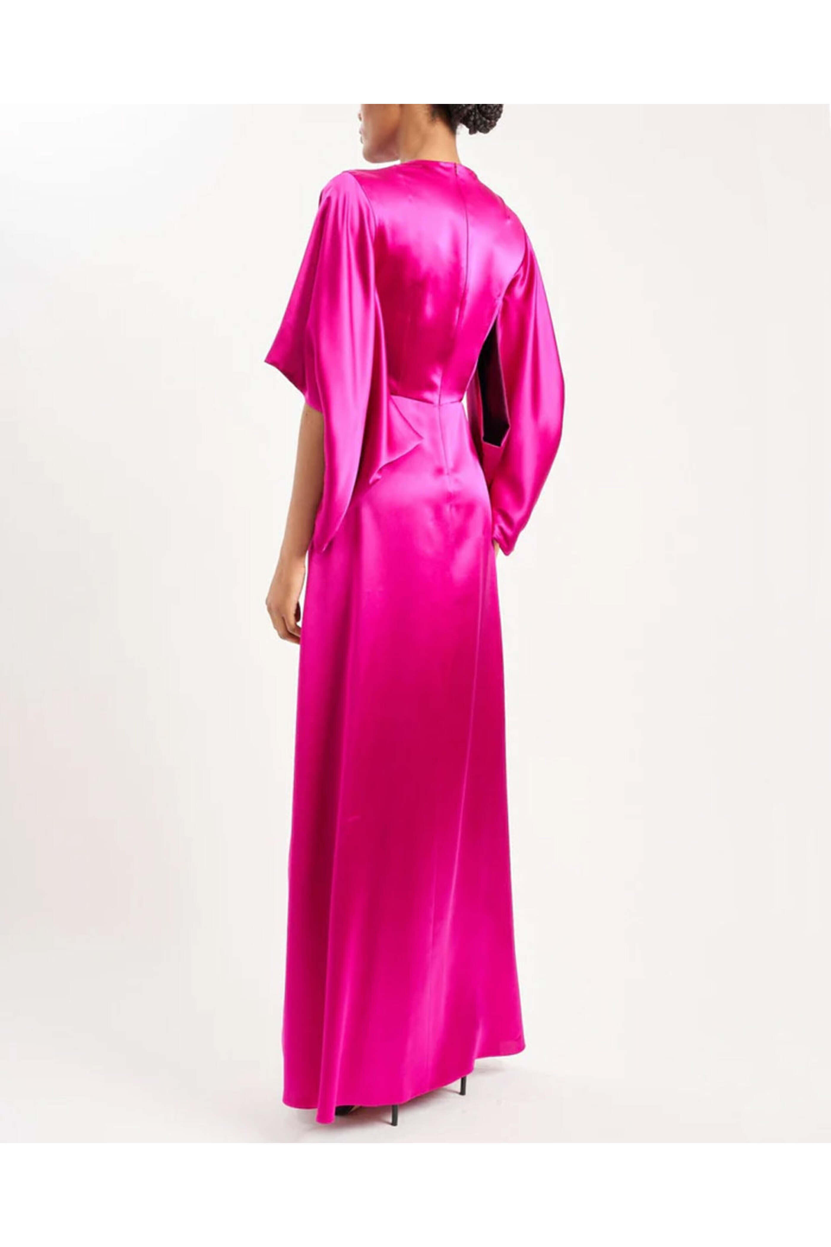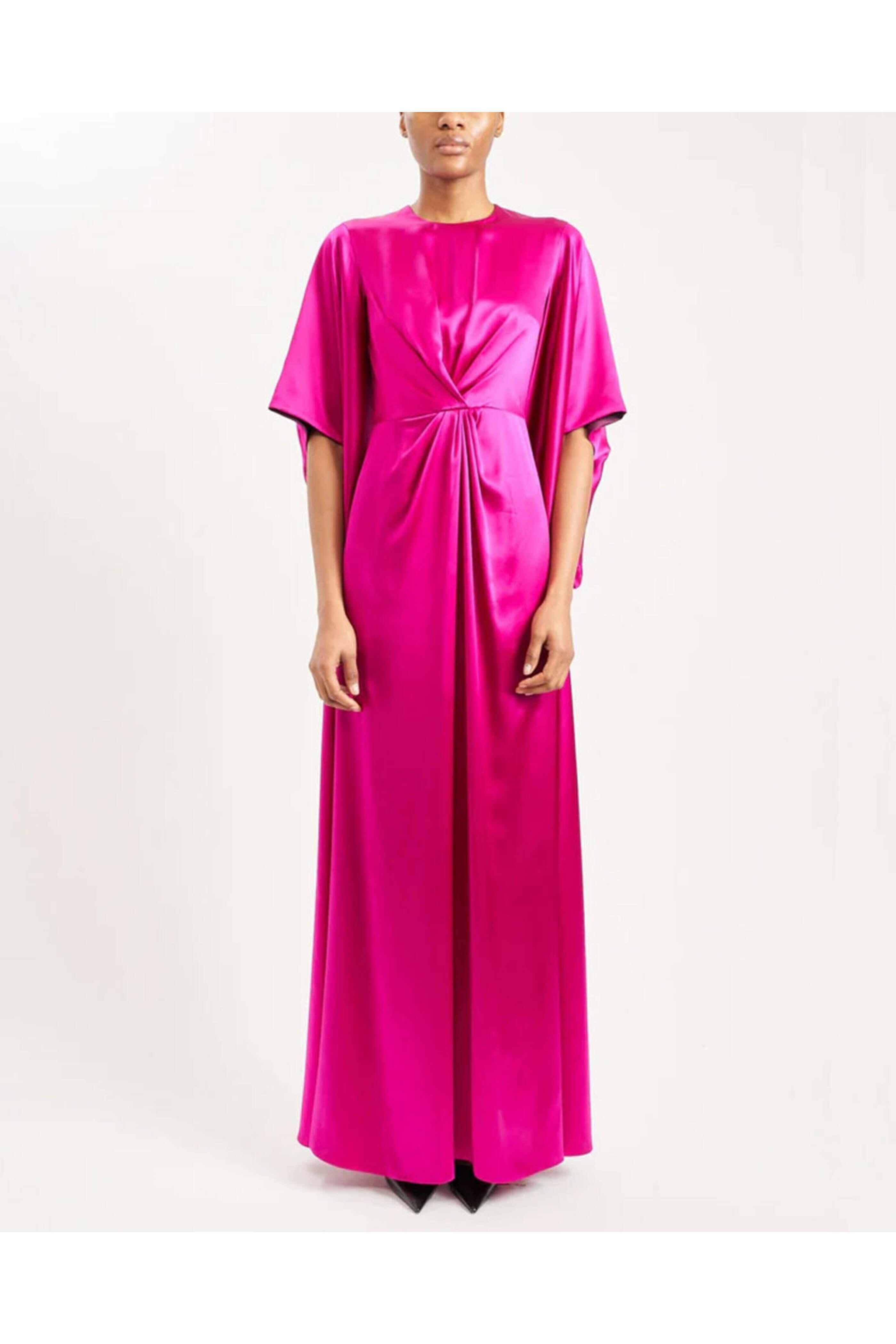 E. Stott Cerise Plum Alexandra Long Dress. Round neck. Elbow length drape sleeves. Concealed back zip closure. Cinch front detail. Natural waist seam detail. Maxi length. Front hem slit. 100% silk.
