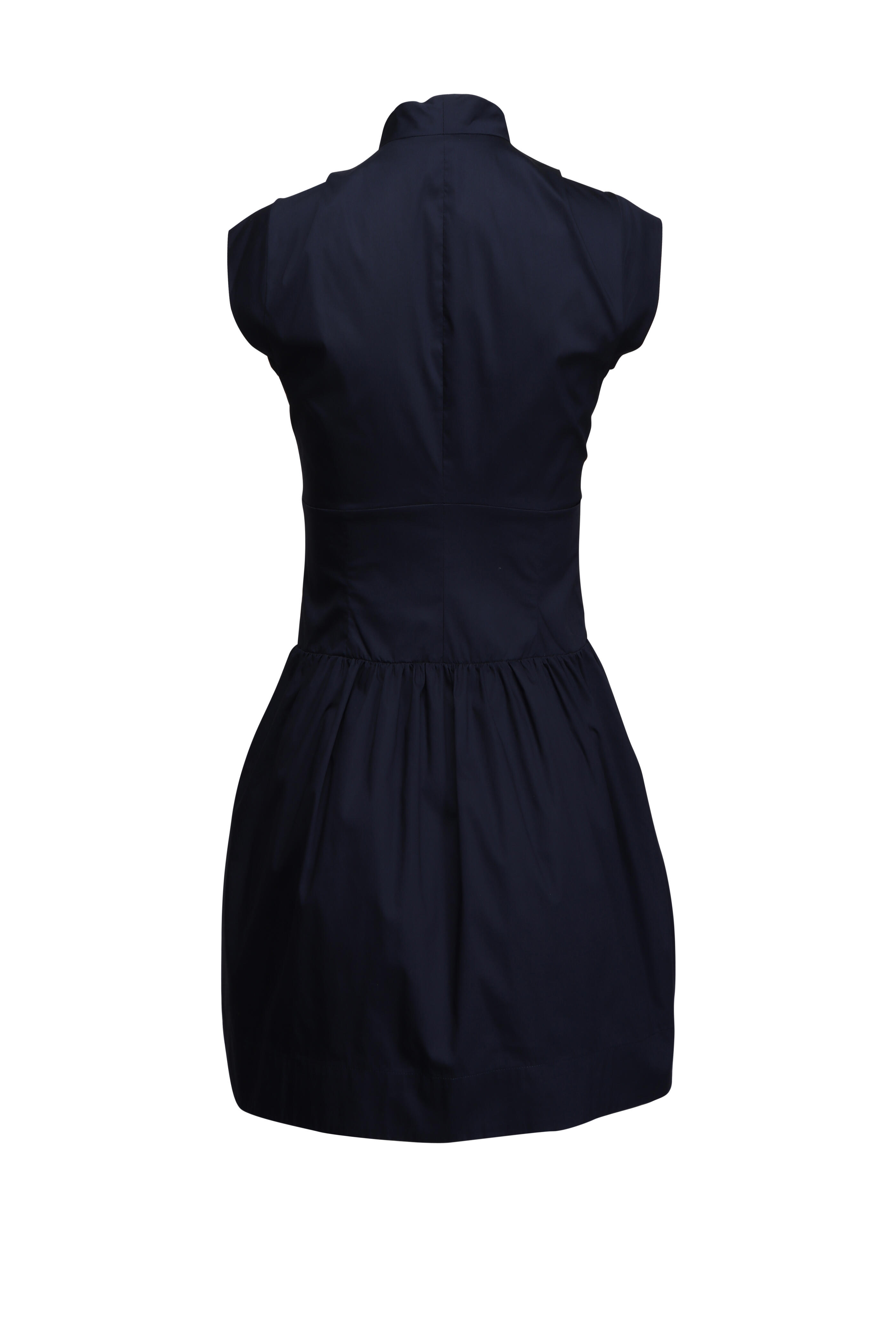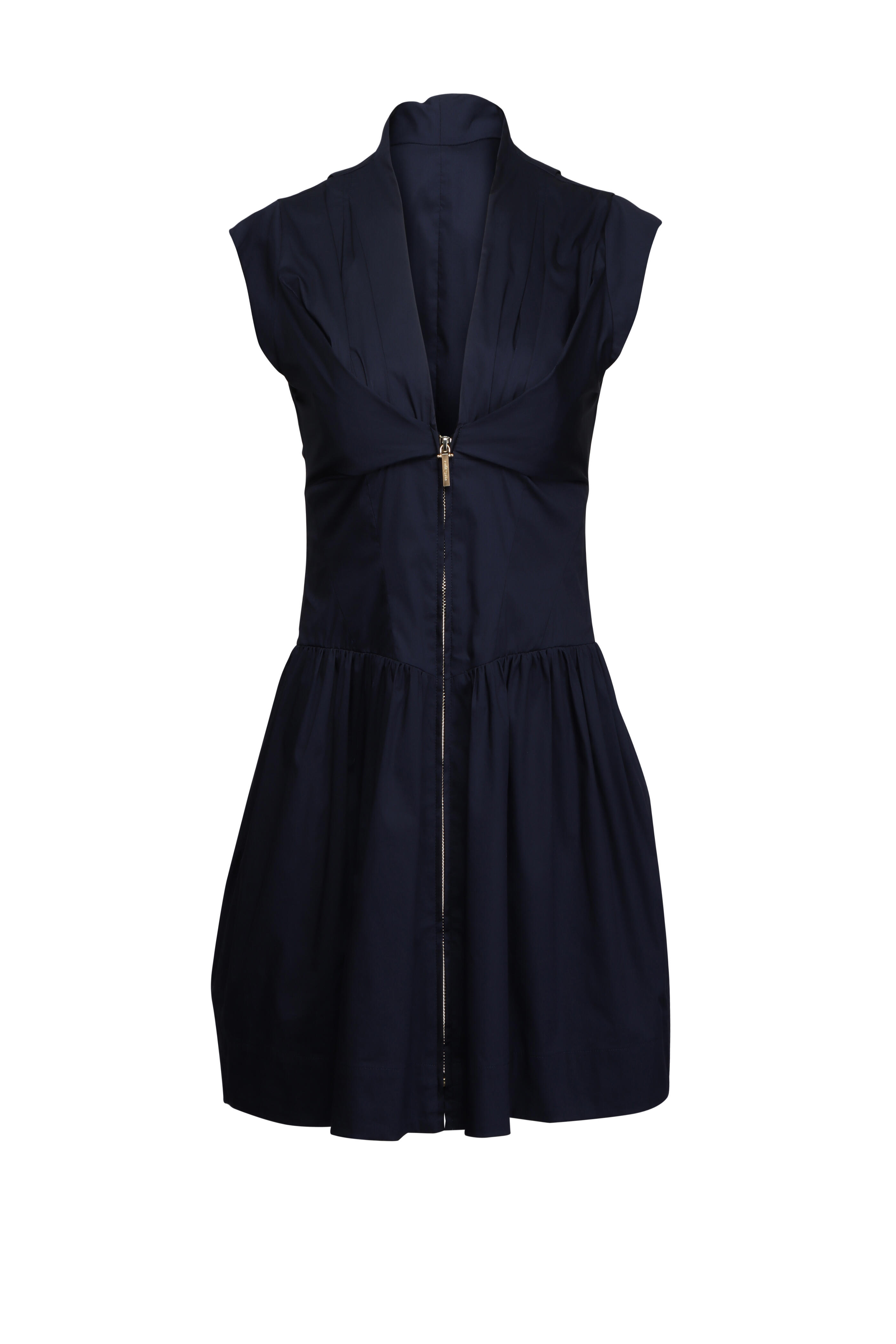 Deep v neck. Short cap sleeves. Front zip closure. Banded waist. Aline skirt. Imported. Bust 33.5-35” (Size S). Waist 25.5-27.5” (Size S). 65% cotton, 28% polyamide, 7% elastane. Dry clean.