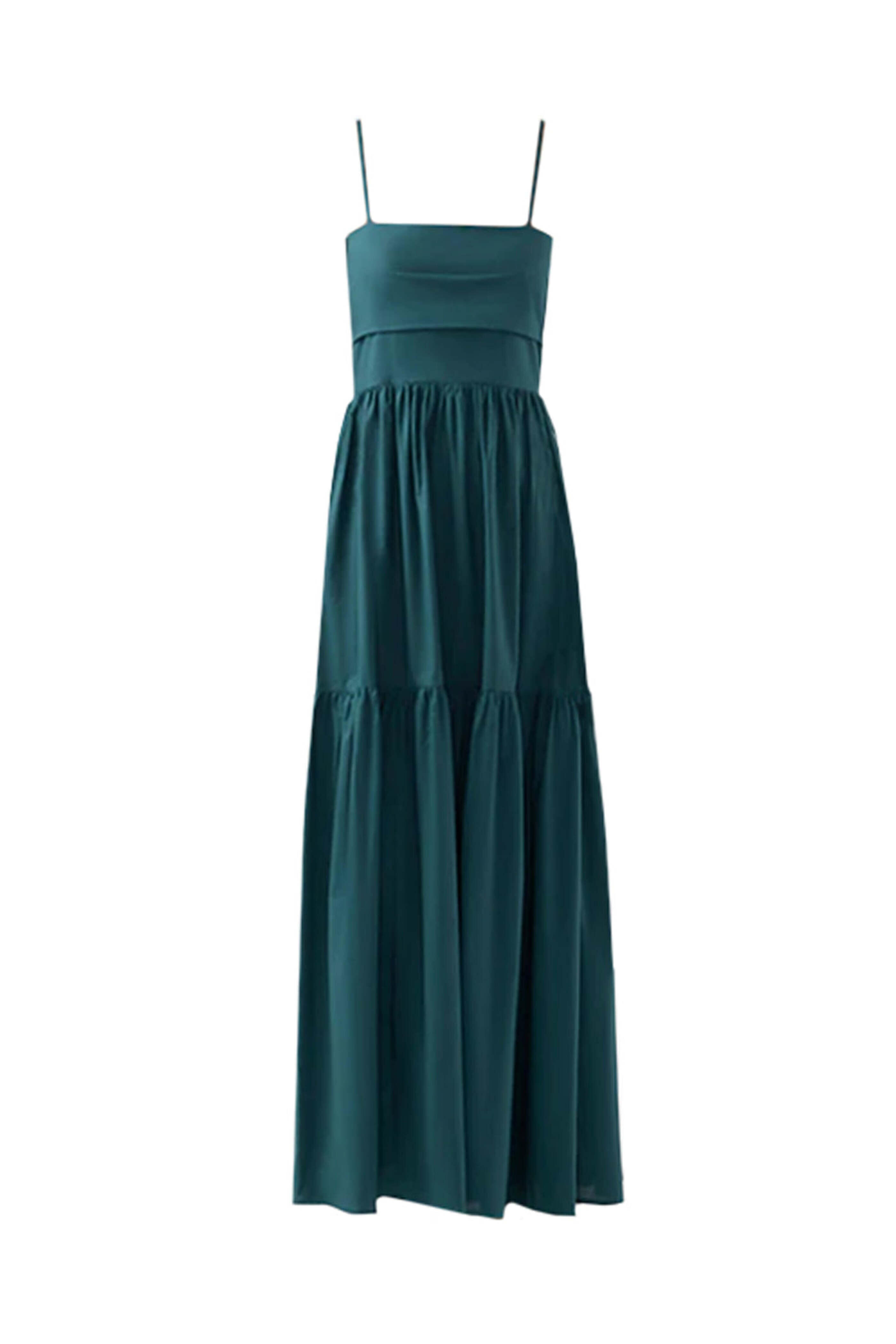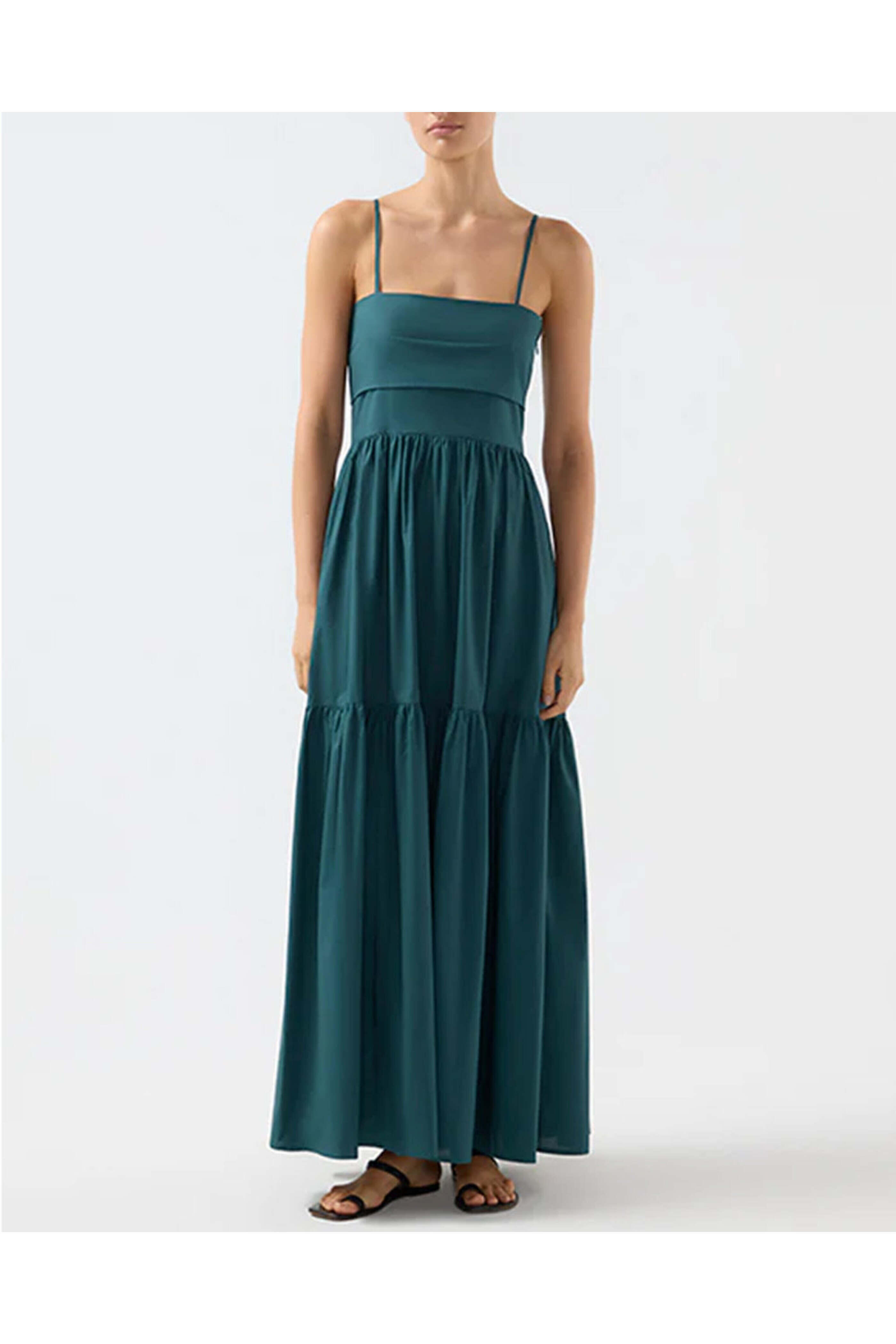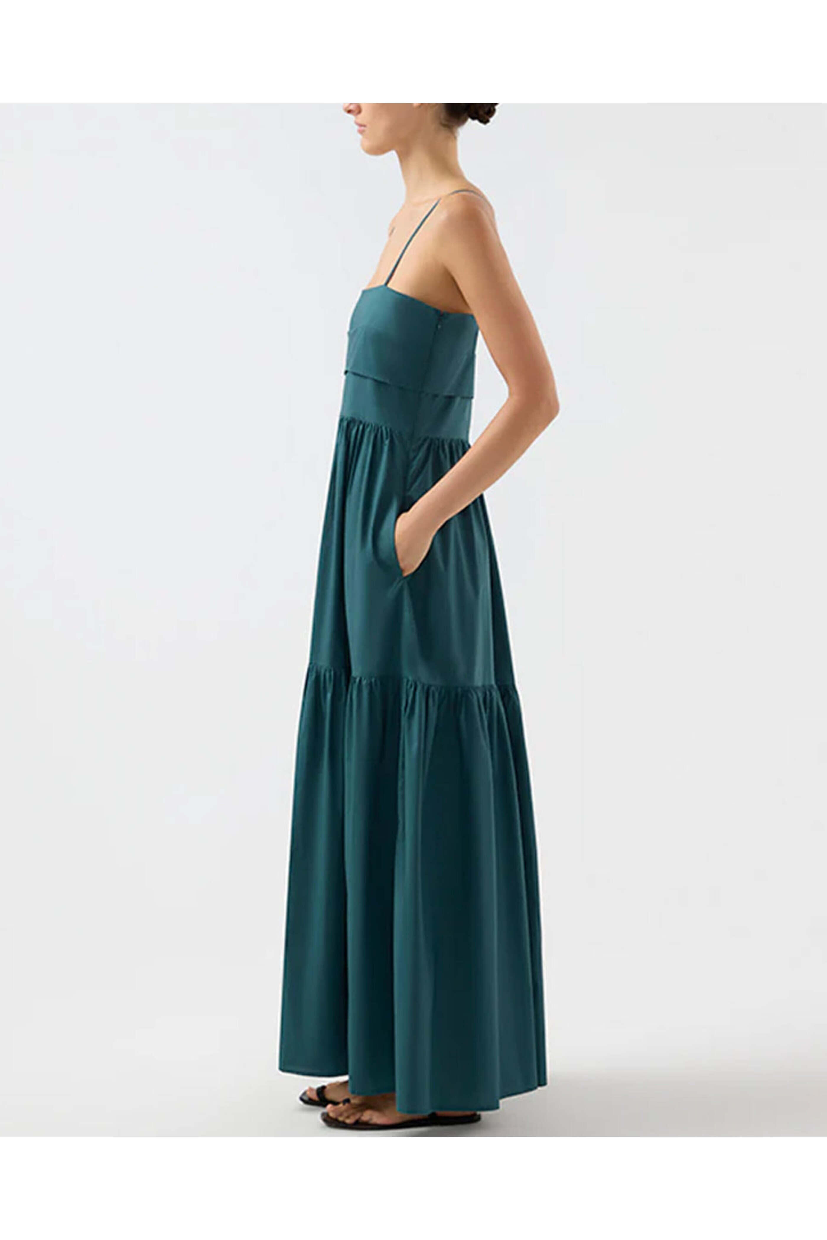 Bird & Knoll Green Paola Maxi Dress. Square neck. Square back. Sleeveless; thin adjustable shoulder straps. Concealed side zip cosure. Side slip pockets. Tiered silhouette. Maxi length. Lined. 100% cotton.