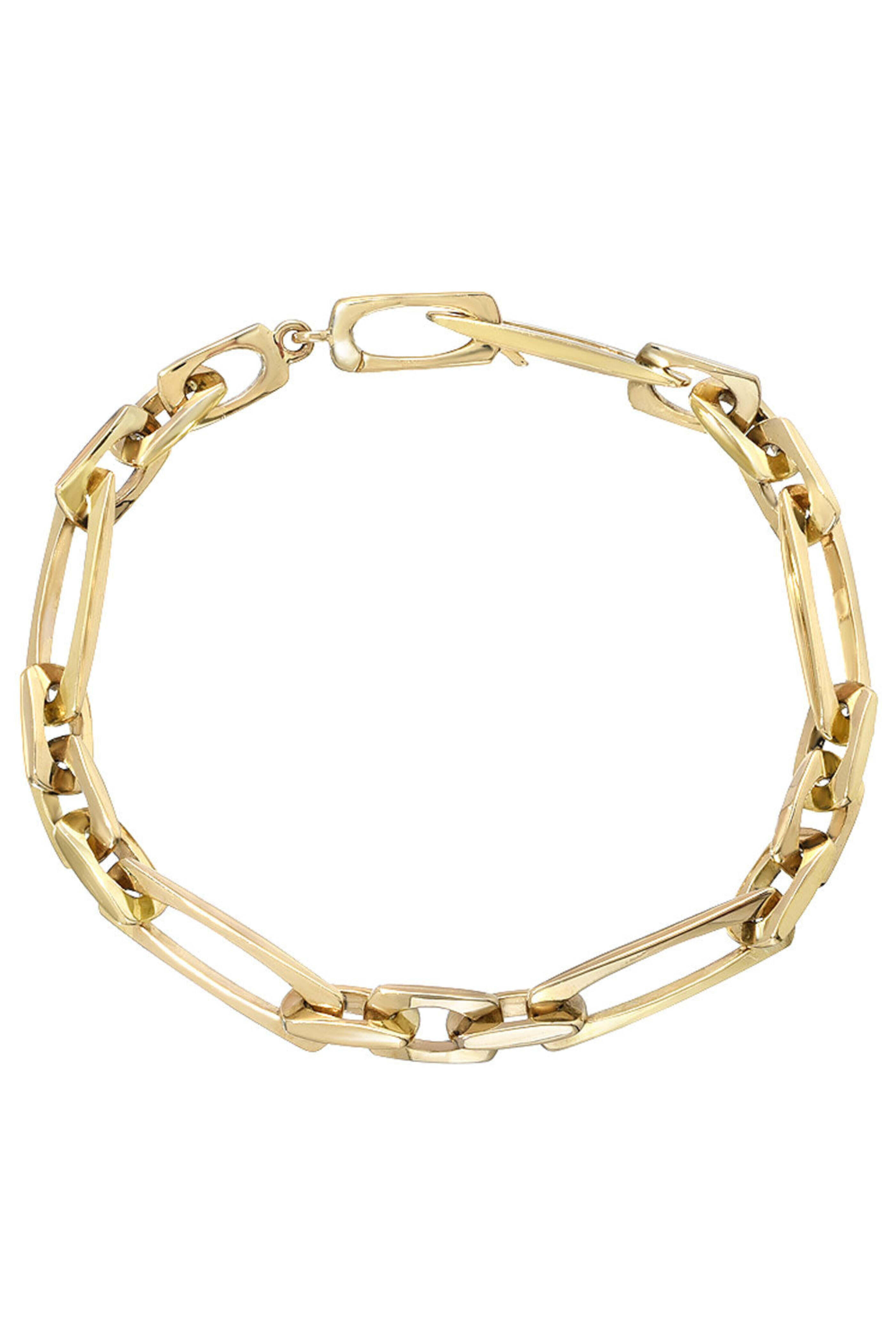 DRU. 14k Yellow Gold Godfather Bracelet. 14k yellow gold. Chain link. Handmade. Smaller links: 10 mm x 6 mm. Larger links: 21 mm x 6 mm. Total length: 7.5. Hinge clasp.