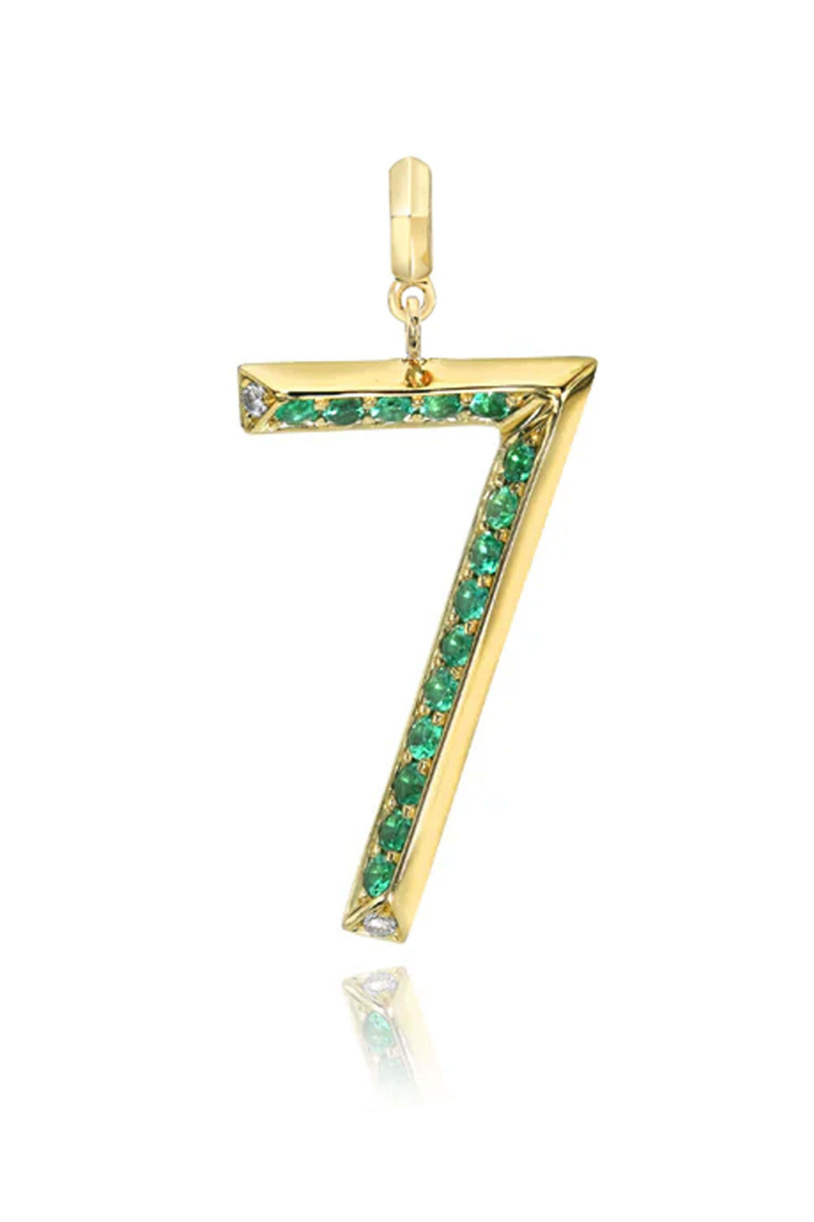 DRU. Emerald Lucky 7 Charm Pendant. 14k gold. Diamond 0.01 total carat weight. Emerald 0.20 total carat weight. White diamond. Beveled angles. Number 7 charm. Slip bail.