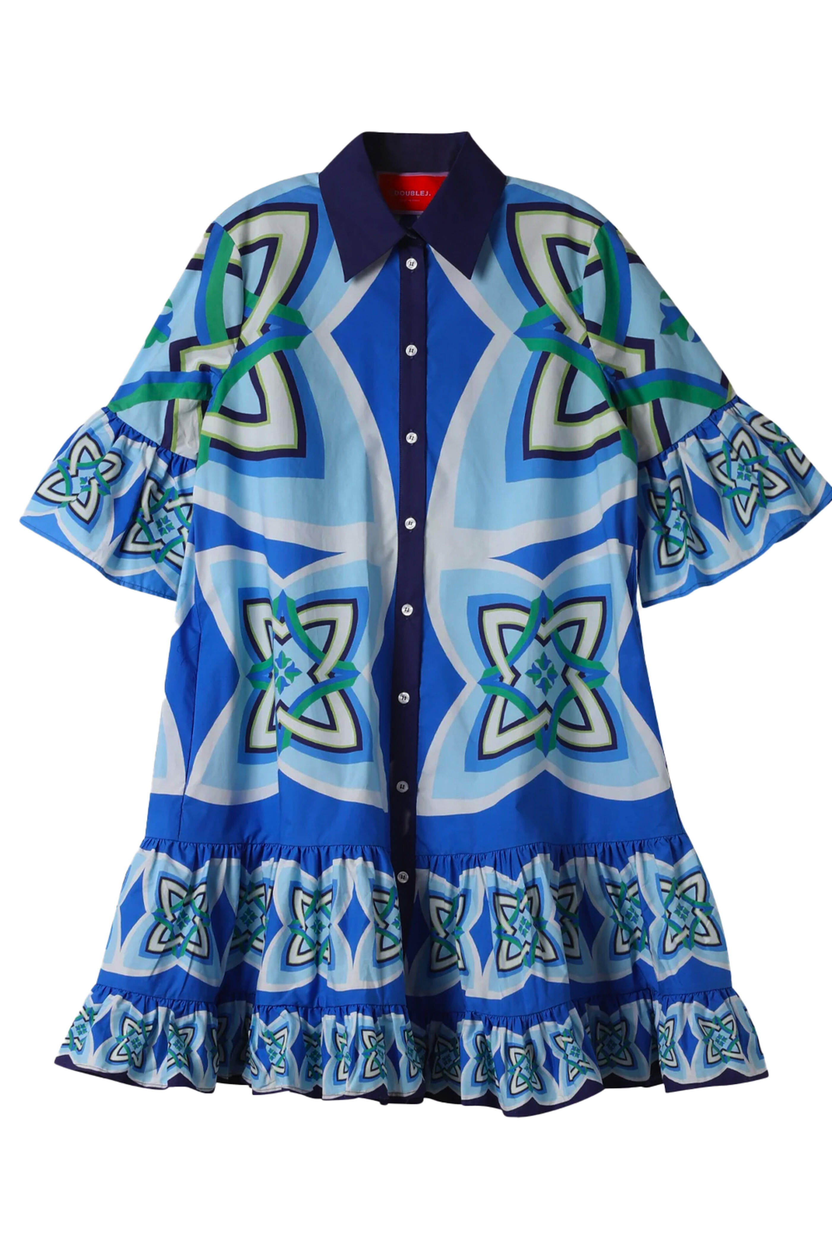 La DoubleJ LAKSHMI Placee Choux Dress. Collar. Elbow length sleeves; fluted cuffs. Button down front closure. Drop waist. Teired hem. Mini length. Made in Italy. 100% cotton.