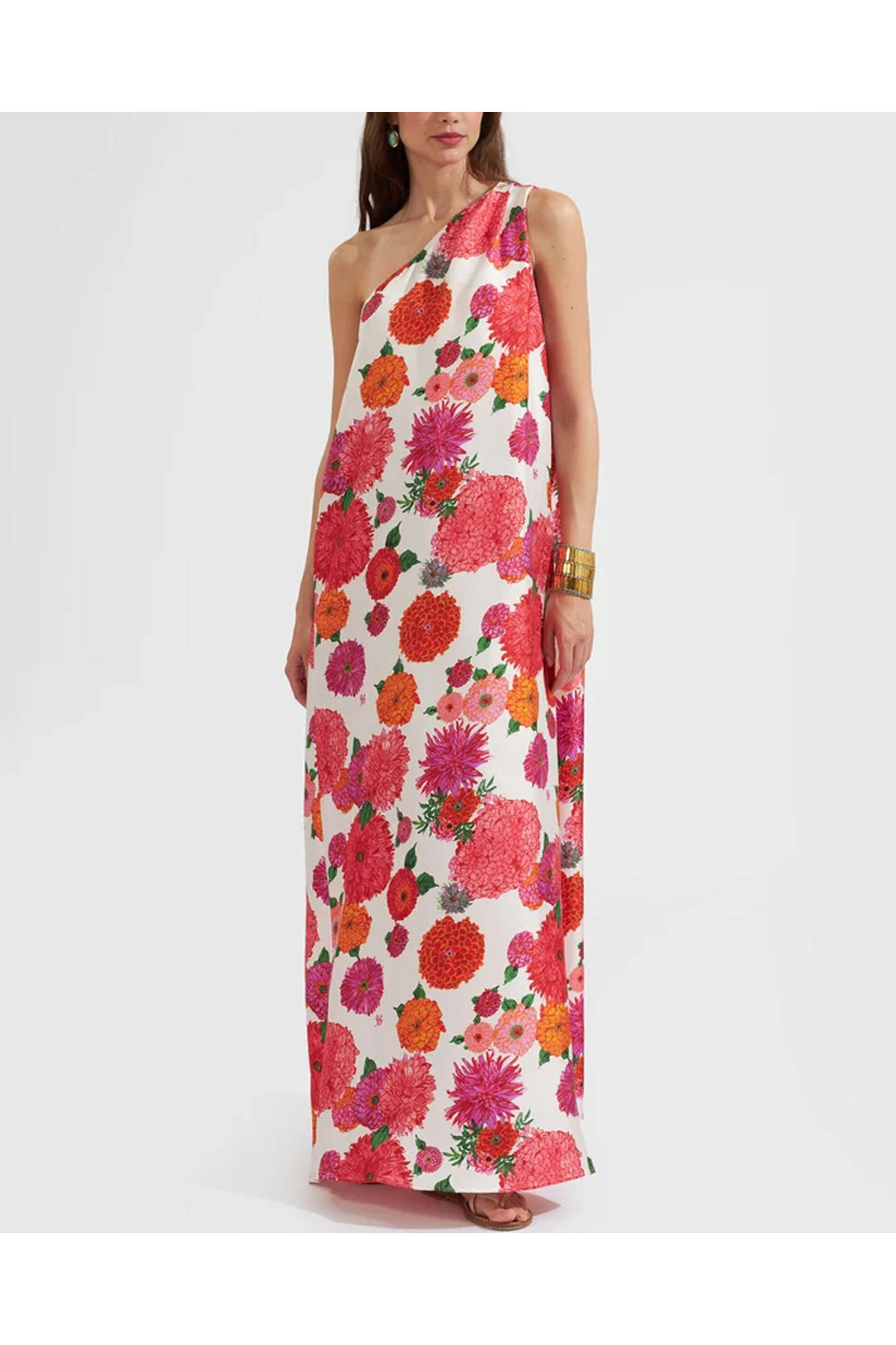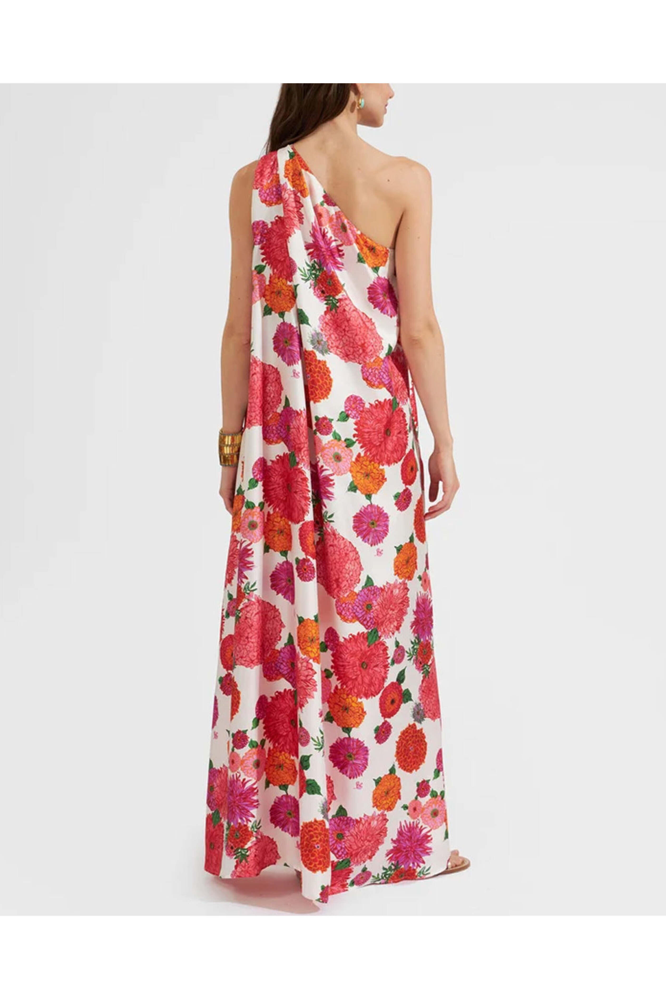 La DoubleJ Gin White Roy Maxi Dress. Single shoulder neckline. Sleeveless. Drape shoulder detail. Side slip pockets. Concealed side zip clousre. Relaxed fit. Maxi length. 100% silk.
