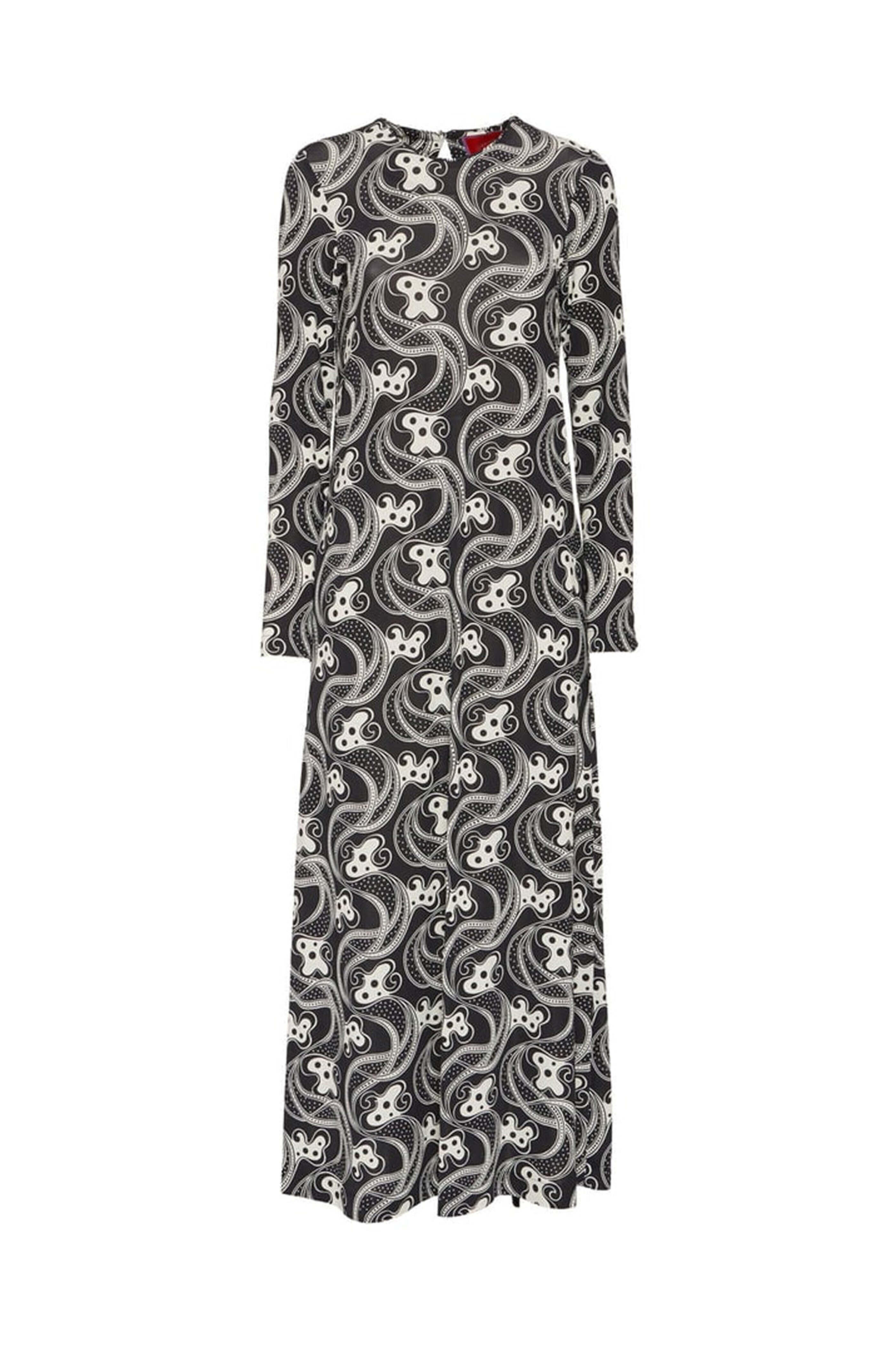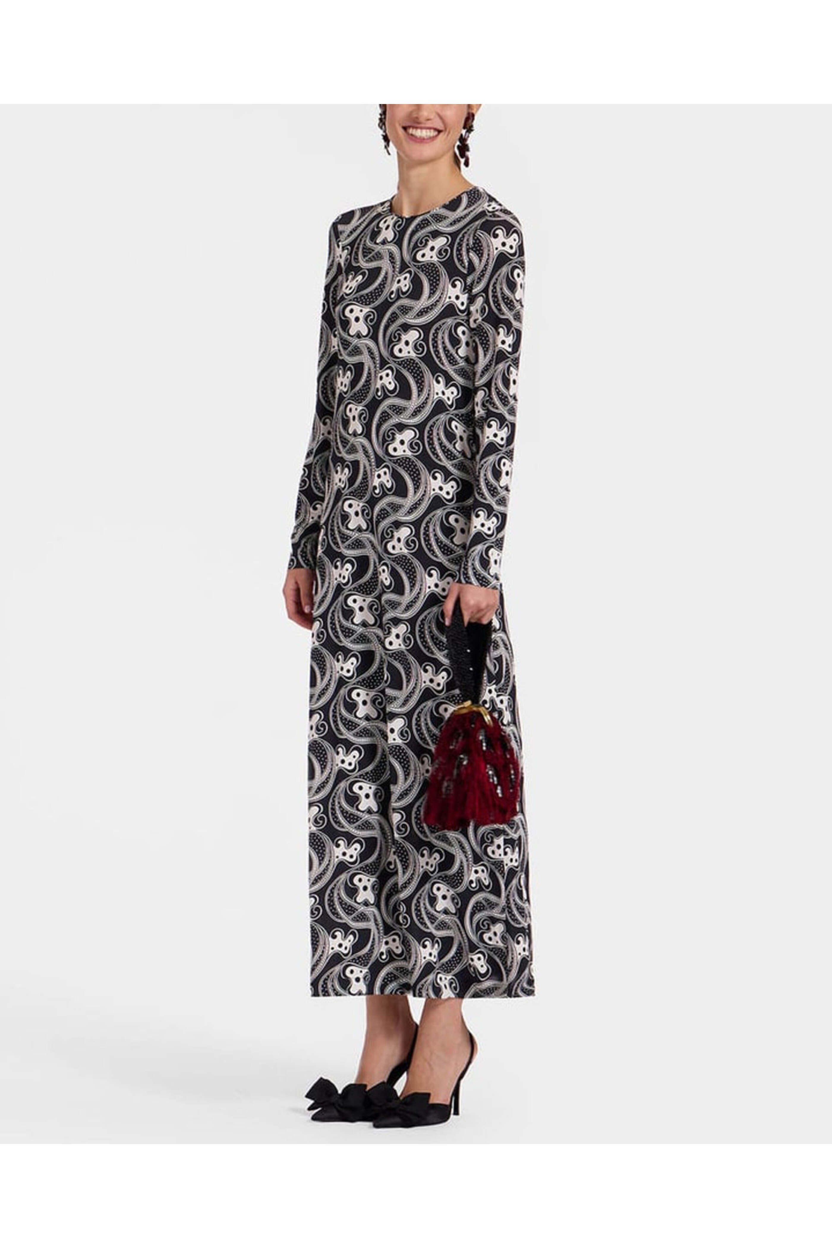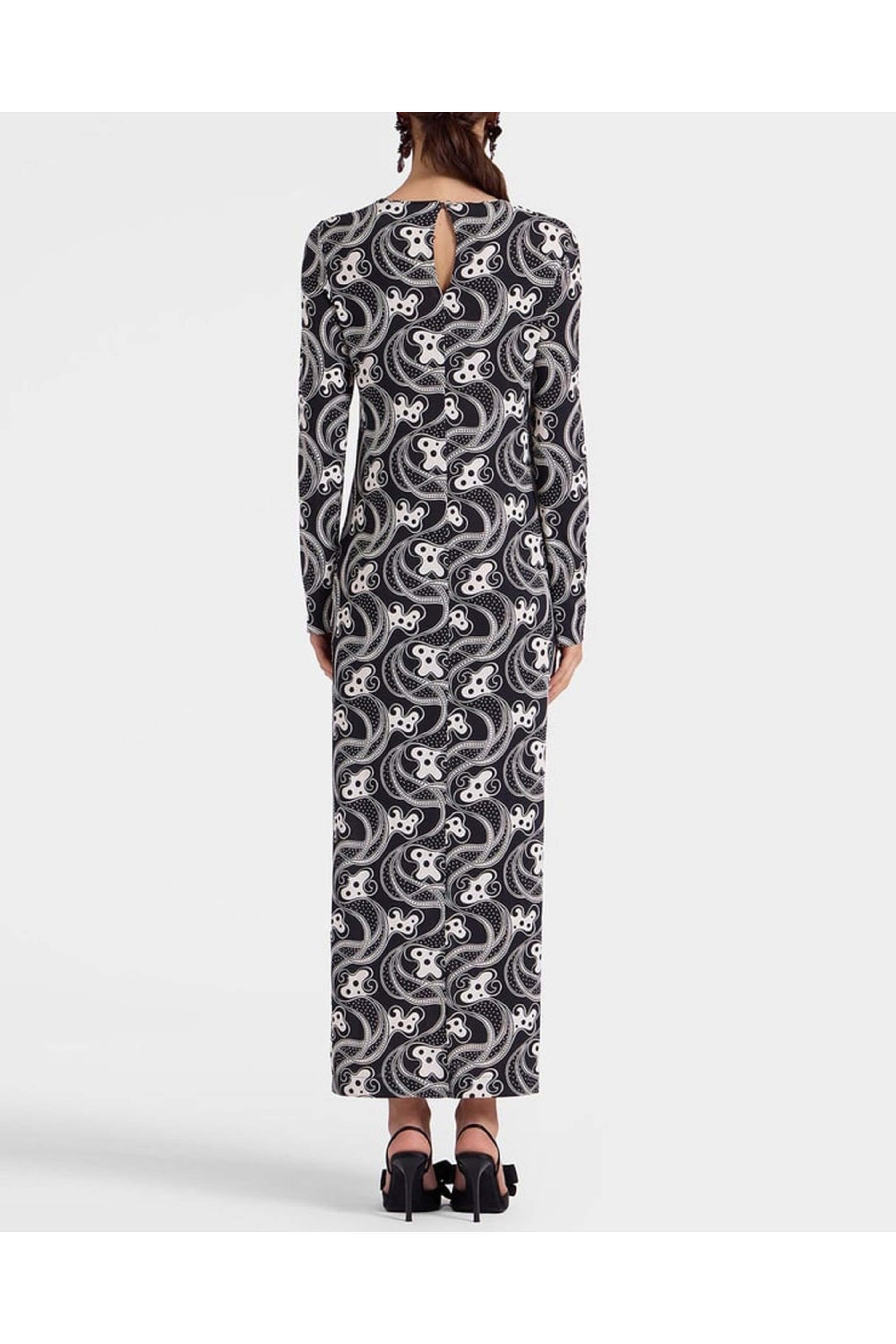 La DoubleJ Aperol Long Sleeve Swing Dress. Round neck. Back button closure; keyhole detail. Long sleeves. Side slip pockets. Relaxed fit. Straight silhouette. Midi length. Made in Italy. 92% viscose, 8% elastane.