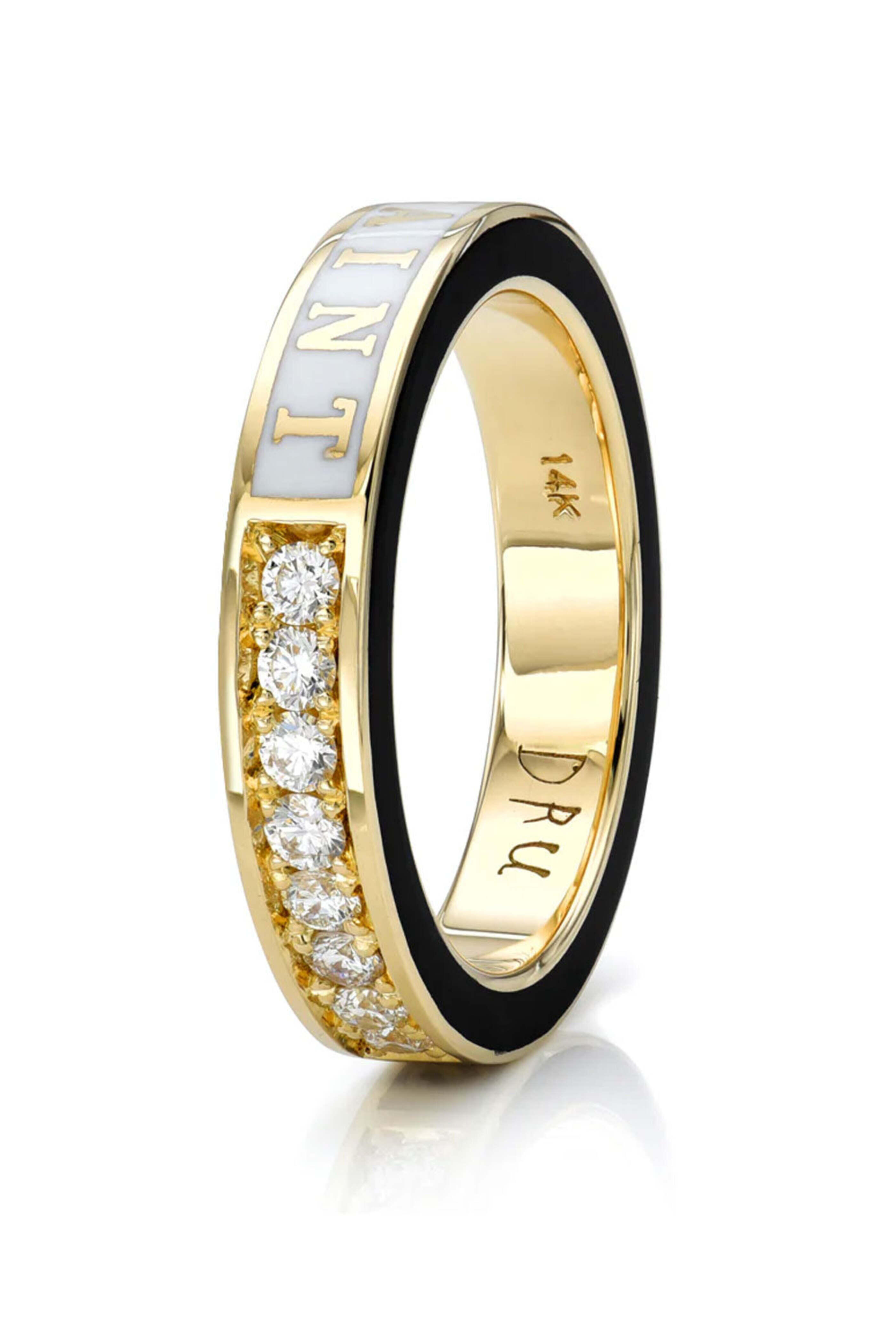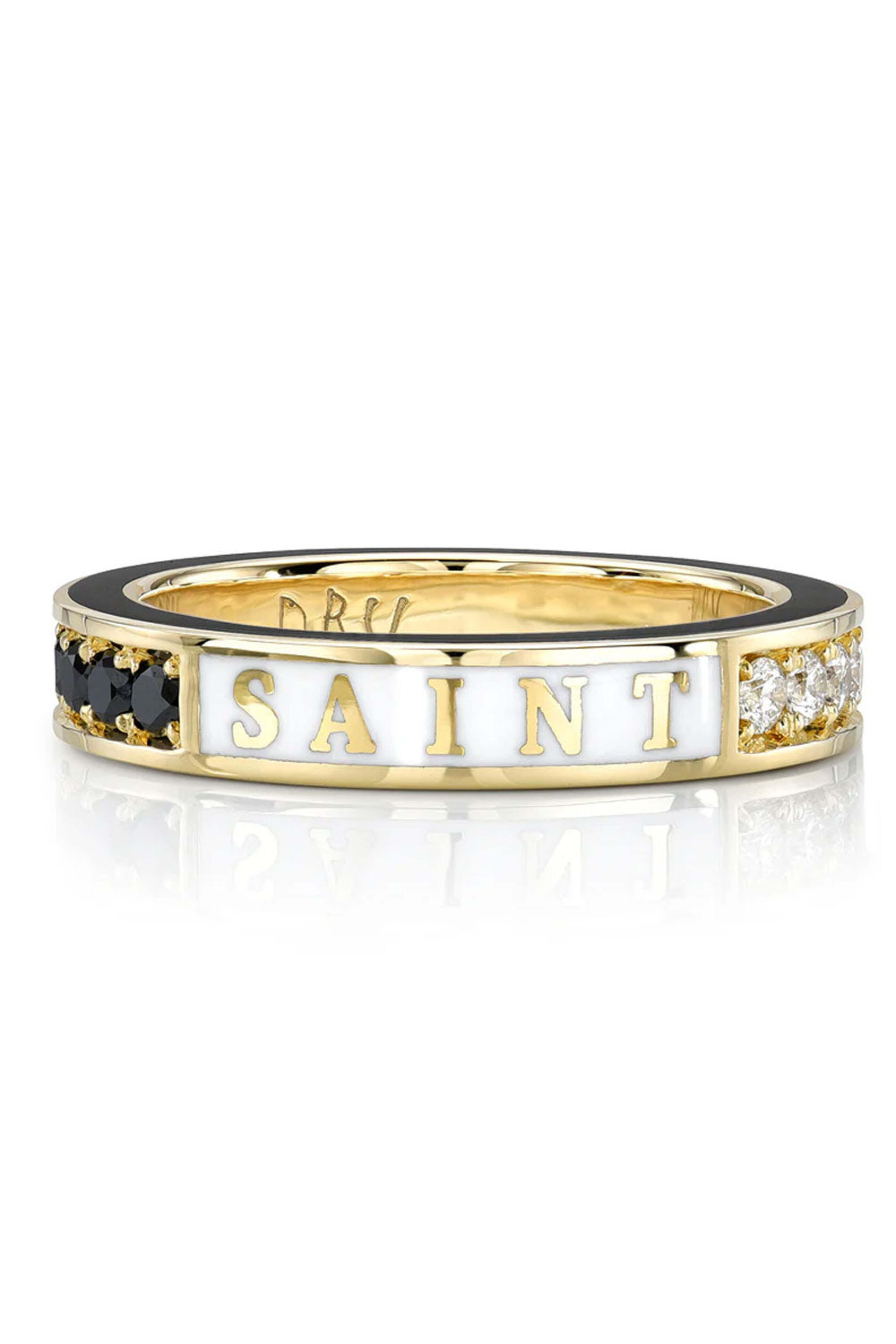 DRU. Saint & Sinner Ring. 14k gold. White diamond 0.29 total carat weight. Black diamond 0.35 total carat weight. White enamel. Black enamel. Saint and sinner are both written in gold enamel. Ring size 7.