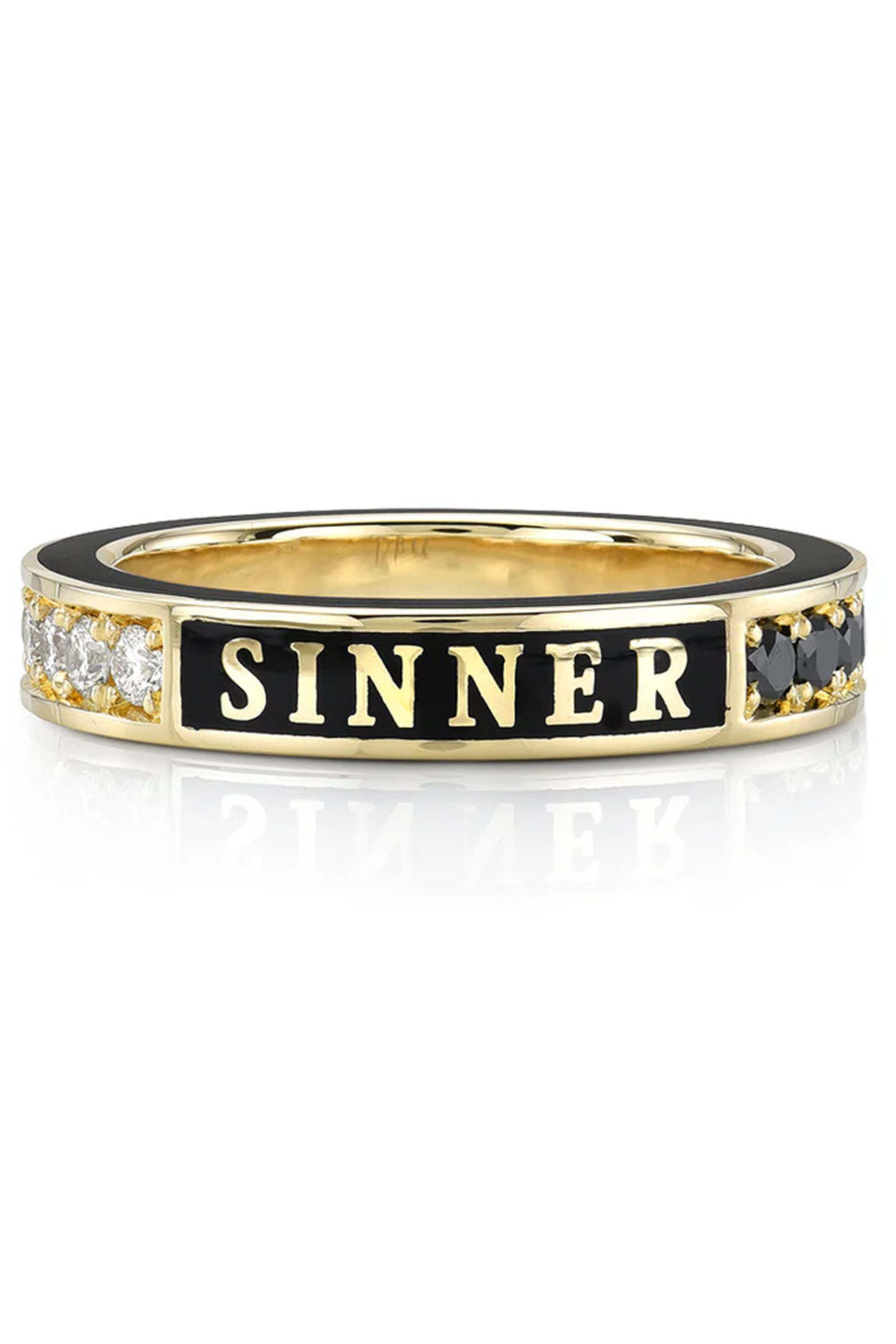 - Saint and sinner are both written in gold enamel