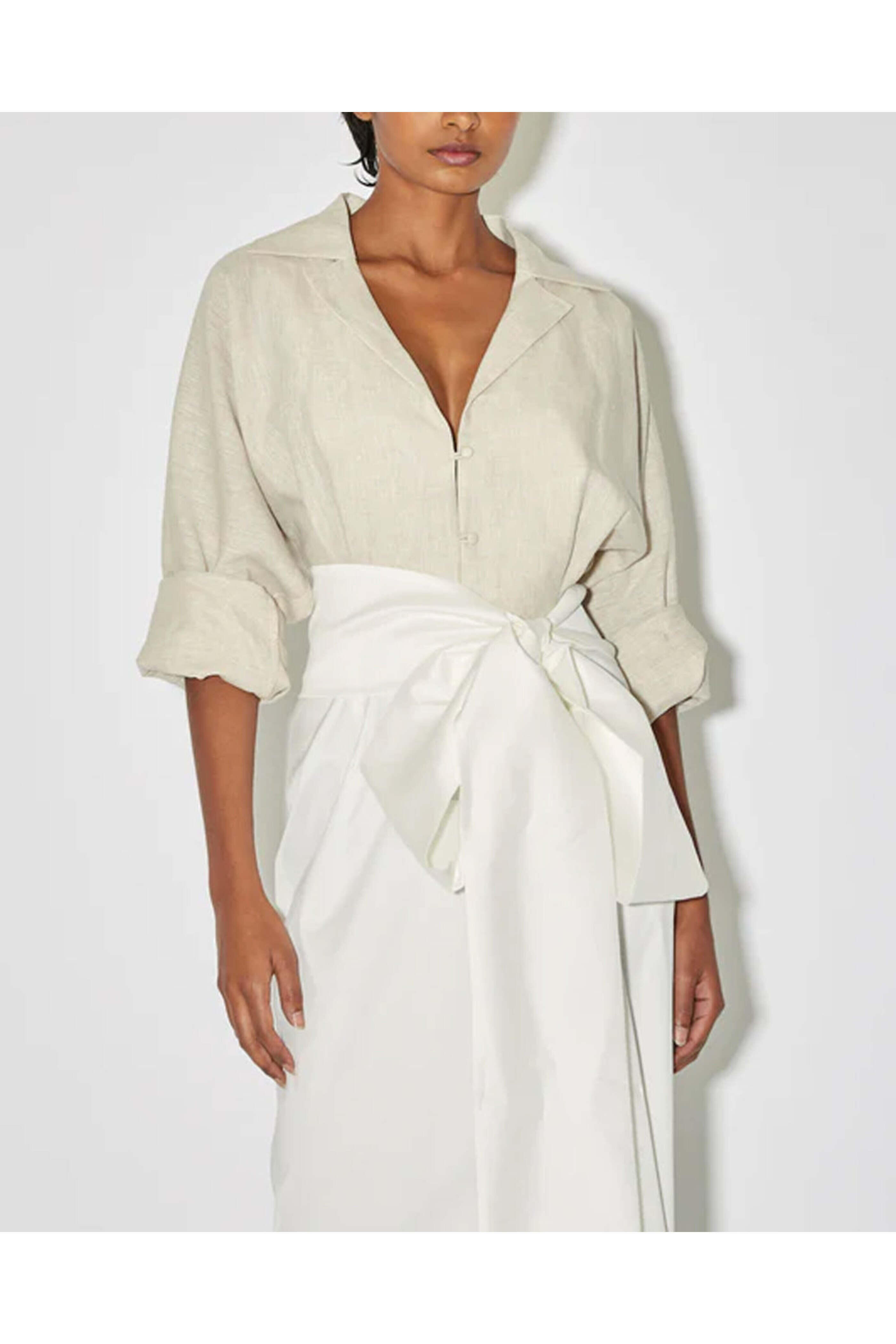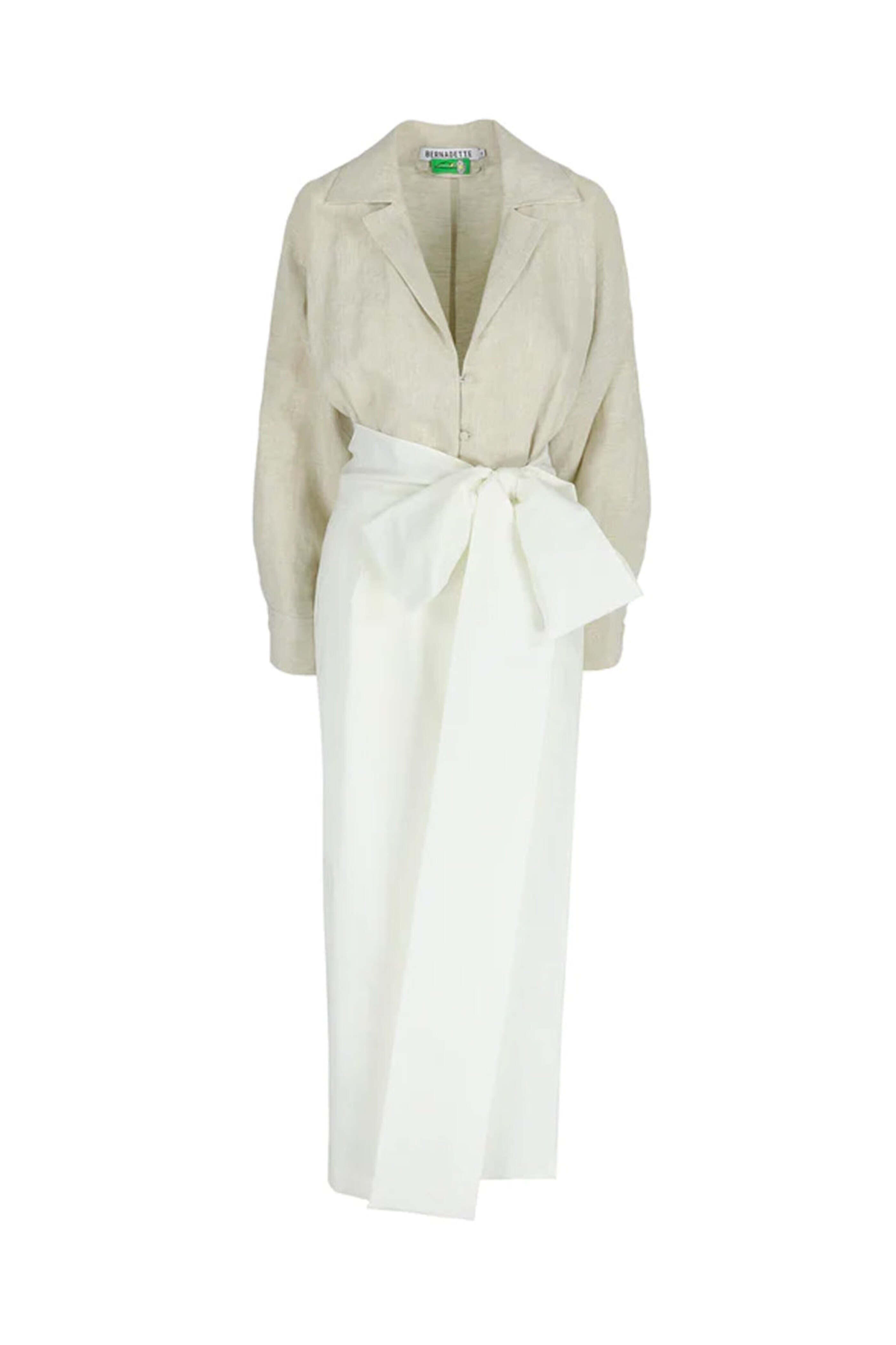 Bernadette Beige and Ivory Claire Dress. Notch lapel. V neck. Long sleeves; button cuffs. Front button placket. Self-tie detail at front. Maxi length. 100% linen outer 1, 78% polyester, 20% nylon, 2% elastane.