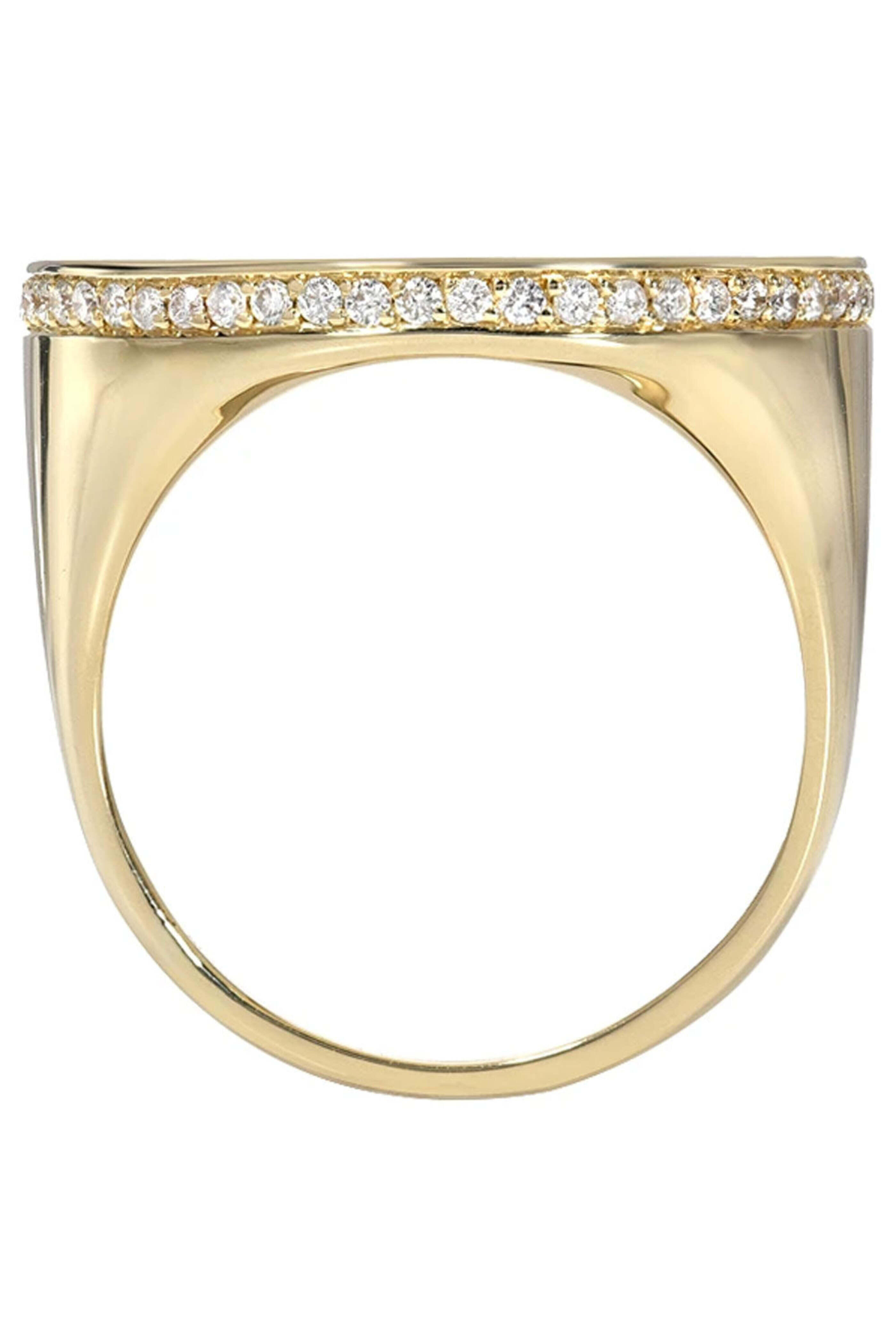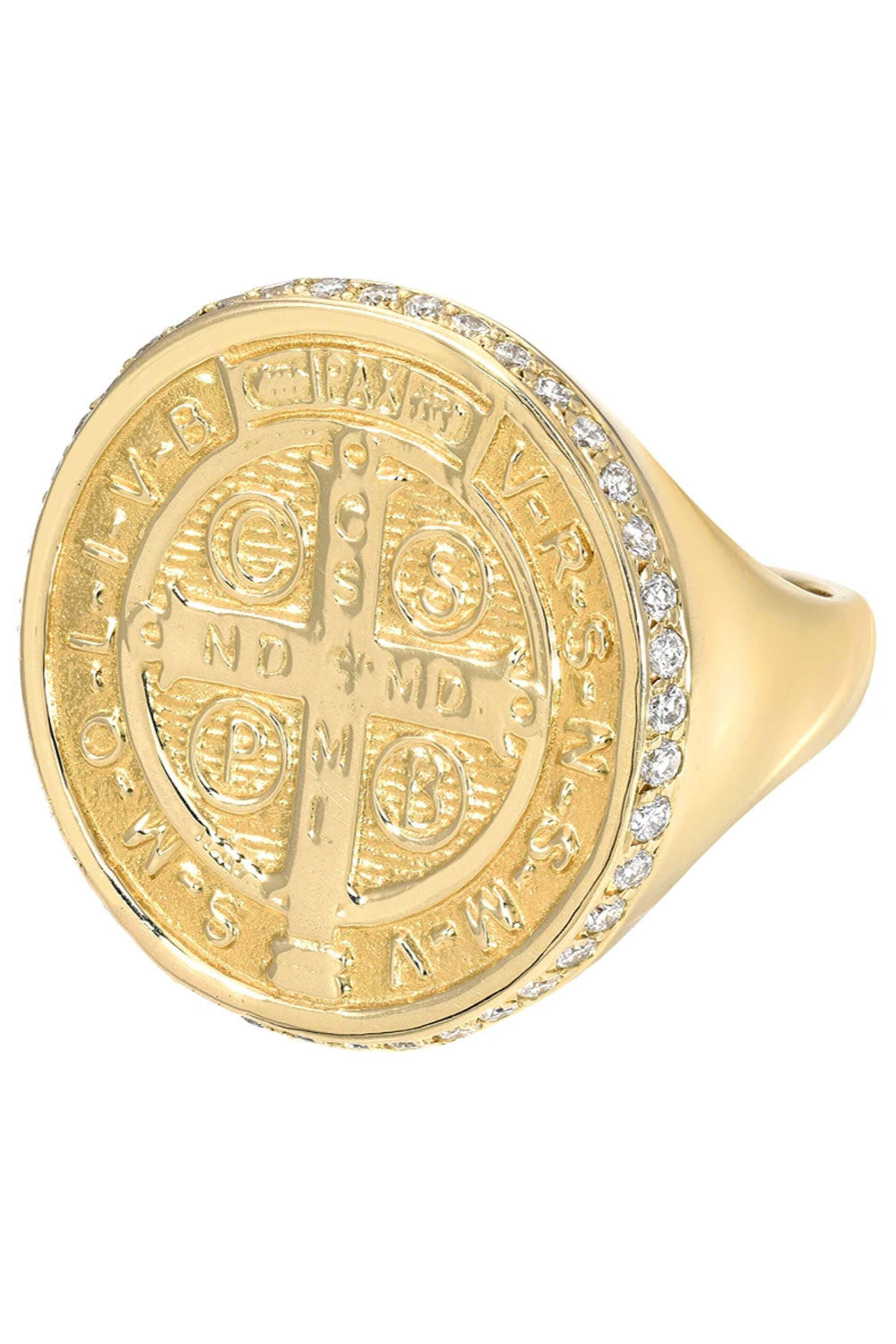 - DRU. Yellow Gold Pave Diamond St. Benedict Signet Ring 14k yellow gold 0.35 ct. white diamond halo Saint Benedict design cast from an original antique medallion Signet style Diameter of face: 21mm Width of band: graduates from approx. 10mm-3mm Size 7