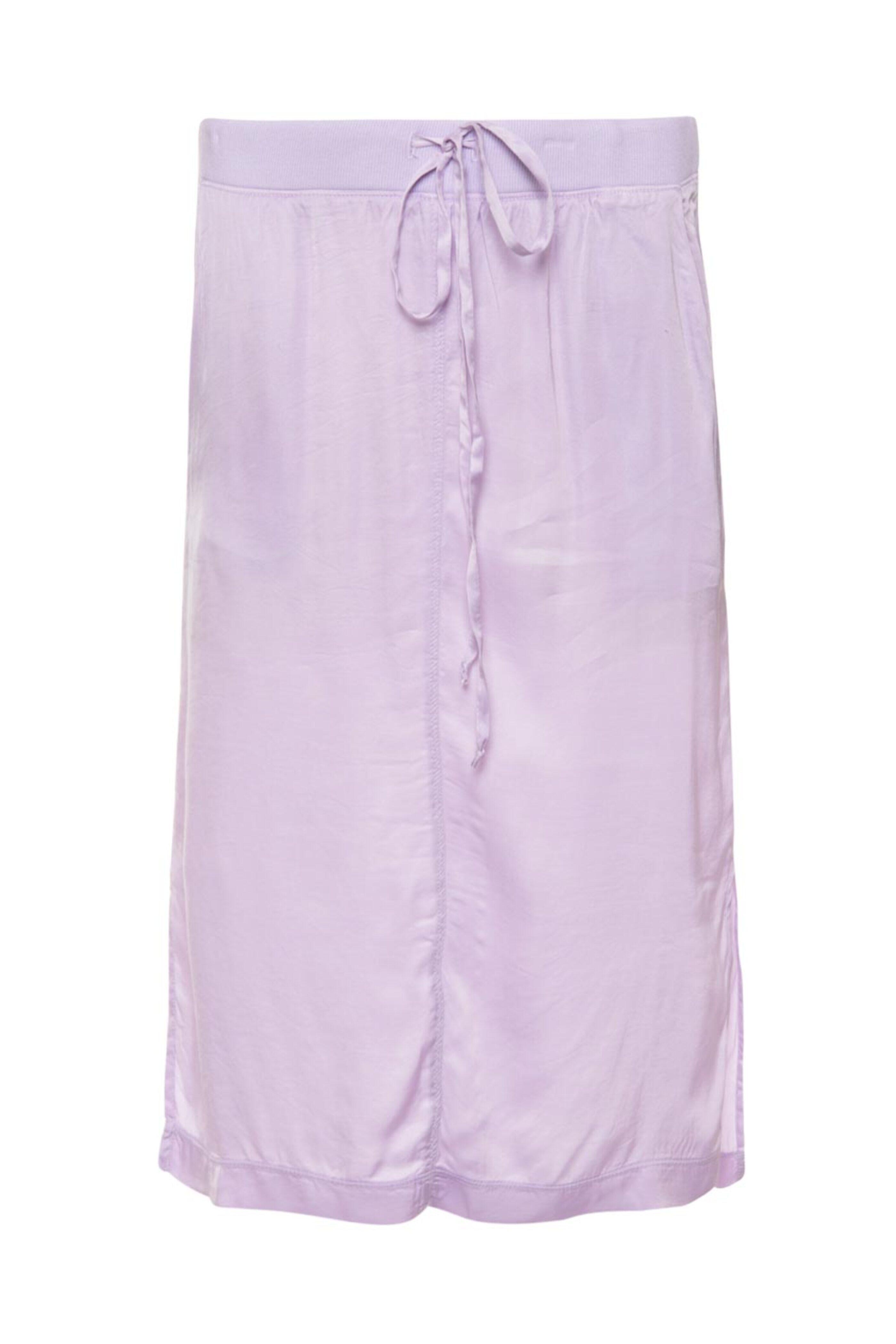 Michael Stars Pale Lilac Drawstring Waist Slip Skirt. Elastic drawstring waistband; ribbed. Side slip pockets. A line silhouette. Knee to midi length. Satin fabrication. Unlined. Made in USA. 59% viscose, 41% rayon.