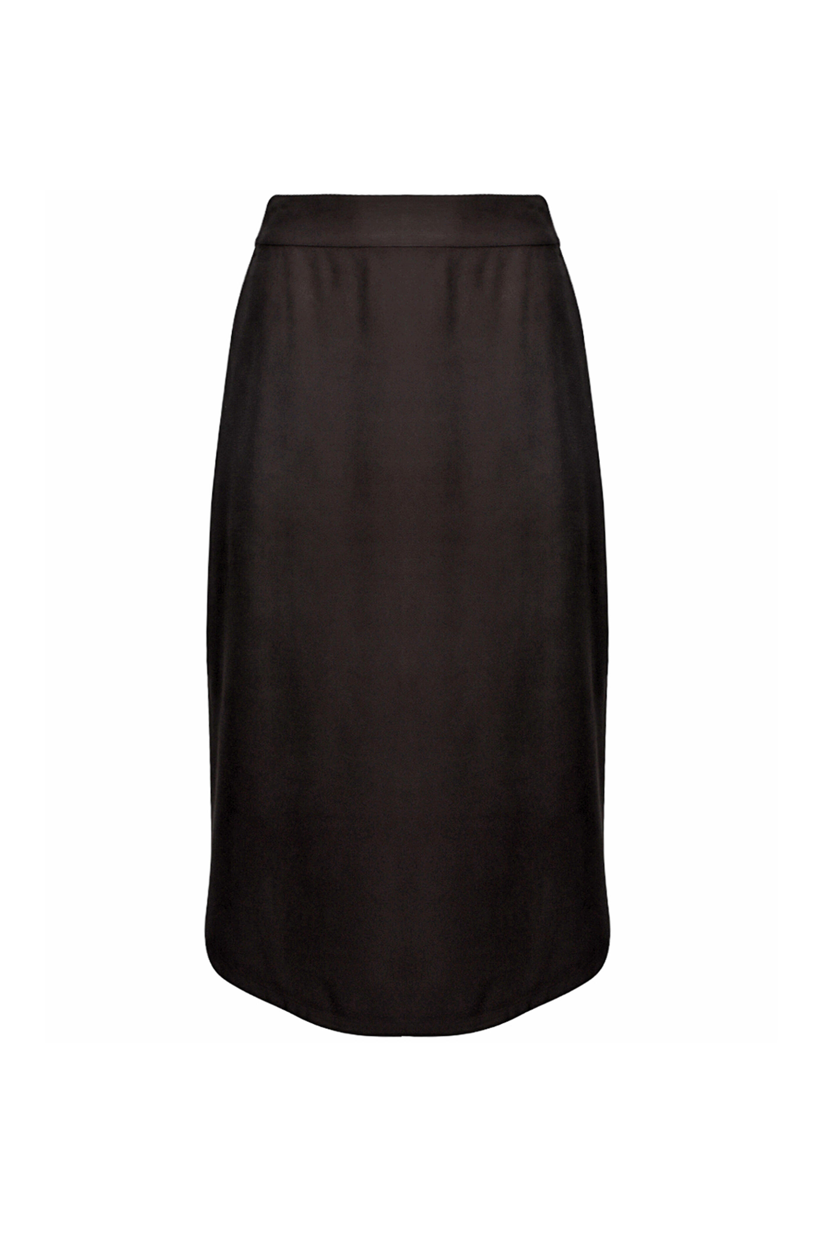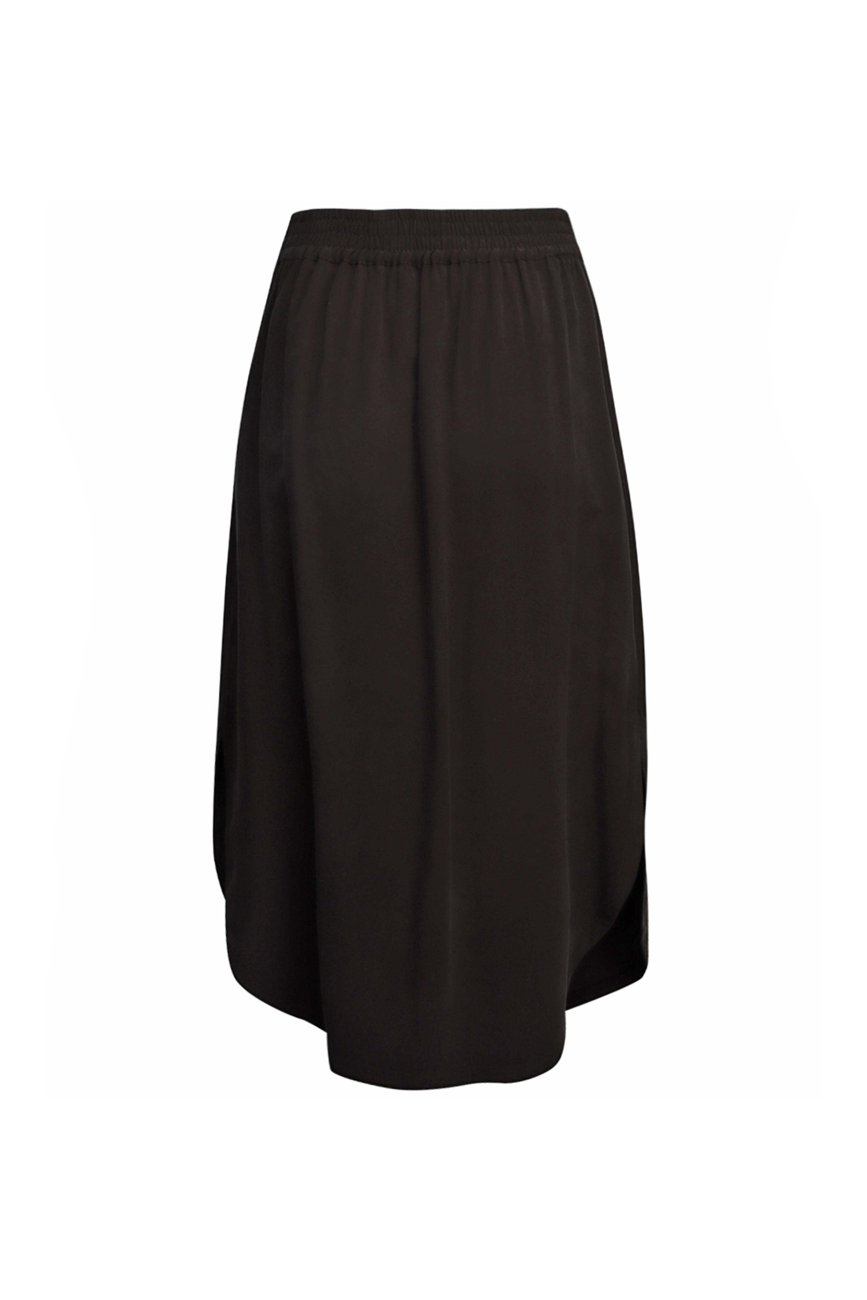 High rise. Flat waistband. Aline silhouette. Rounded hem. Side hem slits. Midi length. 93% rayon, 7% polyester.