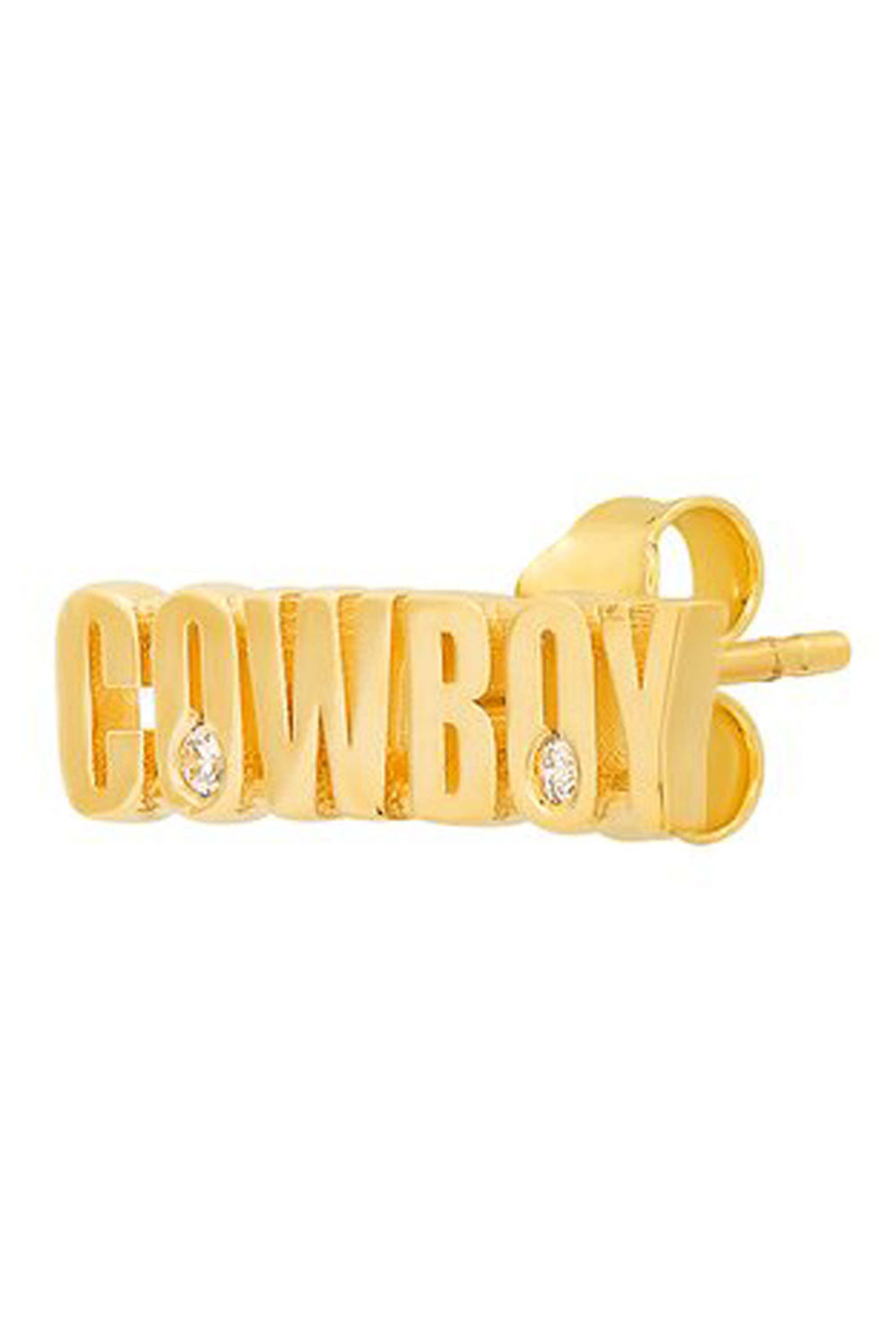 18k yellow gold. Diamond. "Cowboy" catchphrase. Butterfly post back. Length: 0.625".