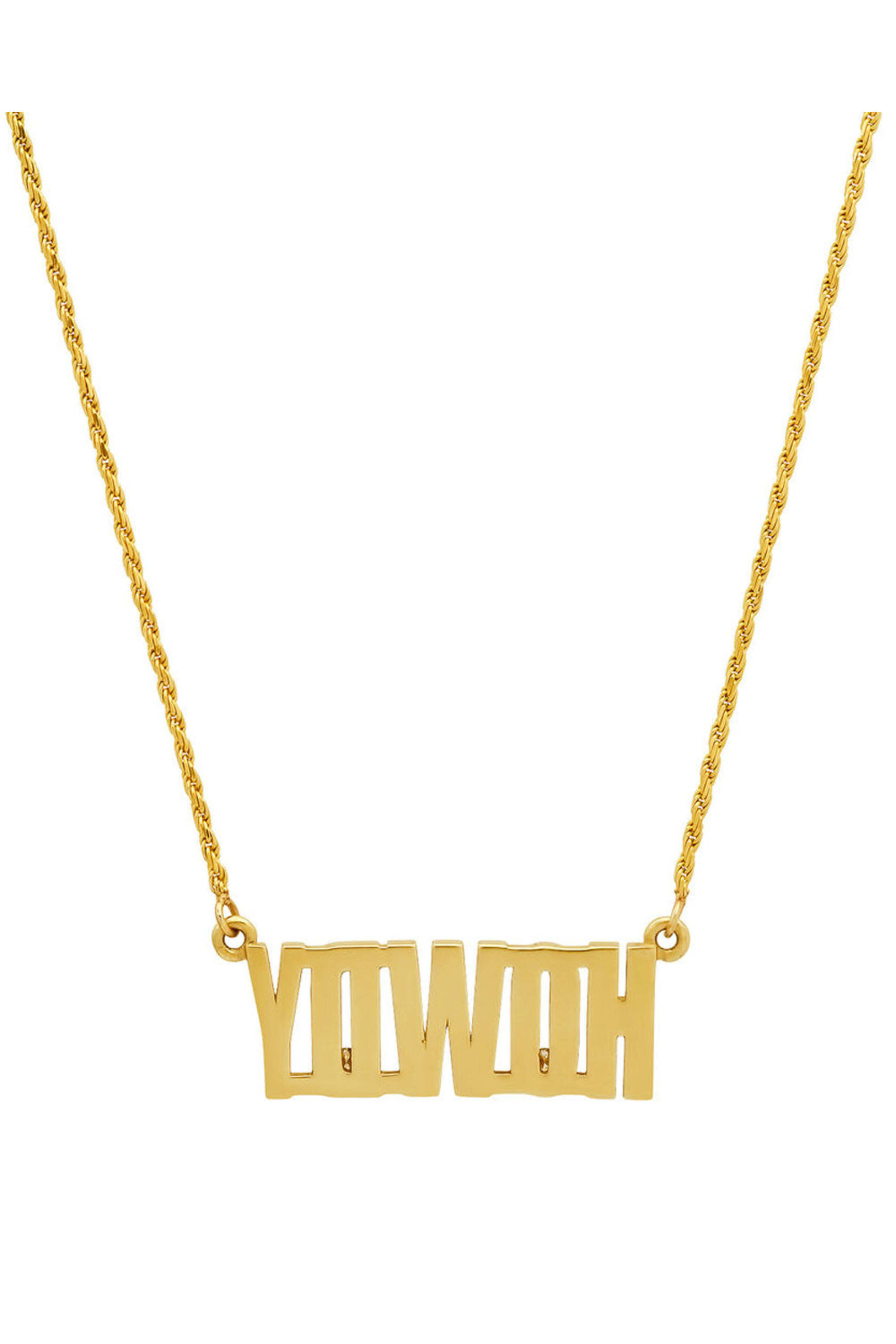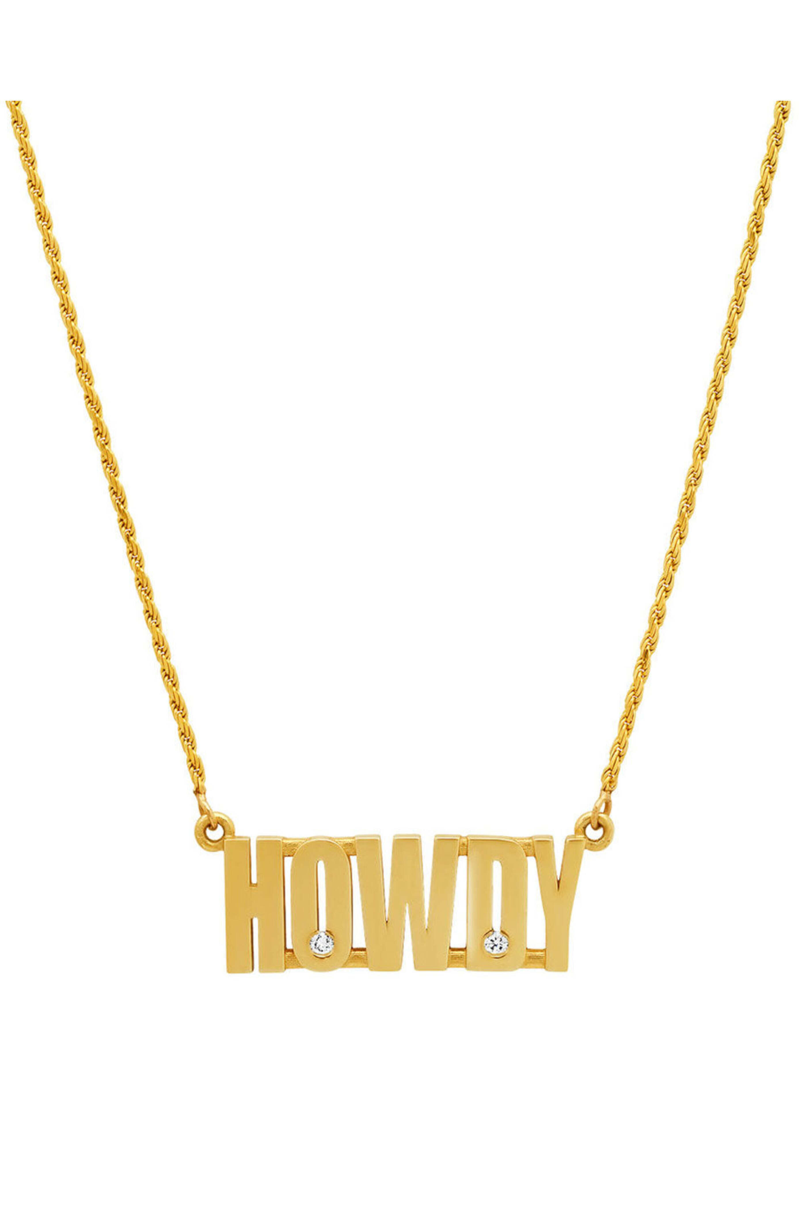 Established Howdy Pendant Necklace. 18k yellow gold. Single diamond accent stone. "HOWDY" word pendant. 18" rope chain. Lobster claw clasp.