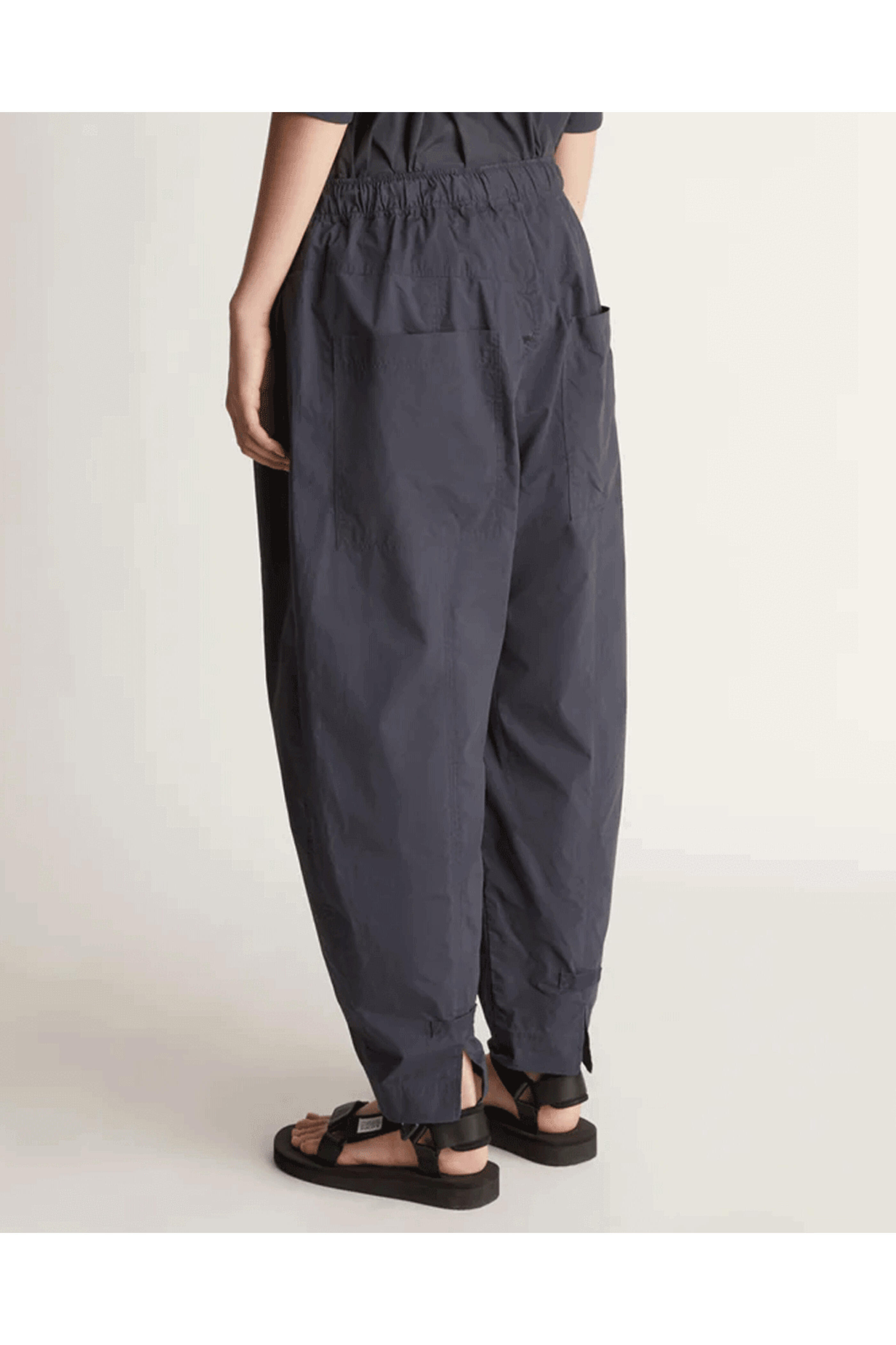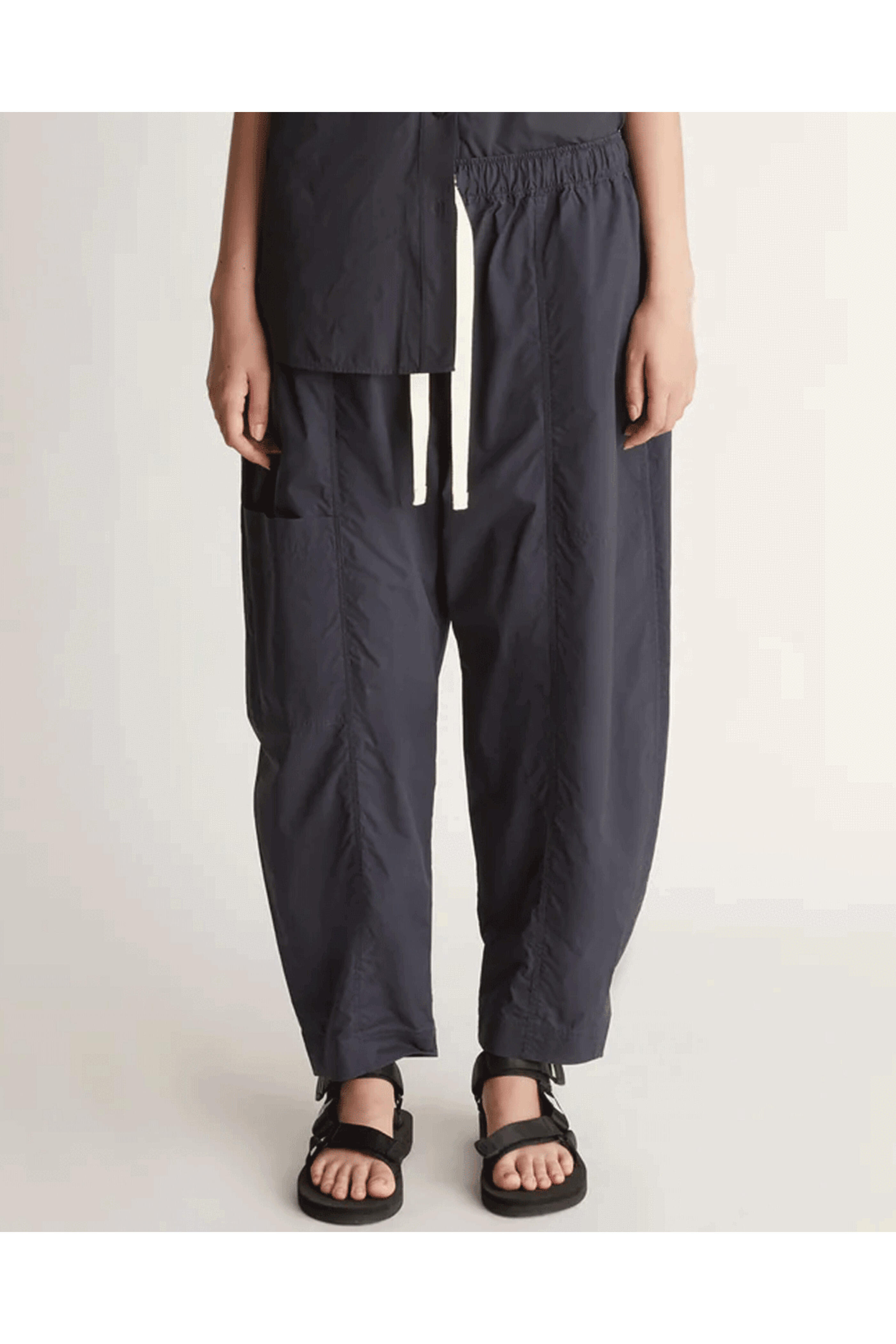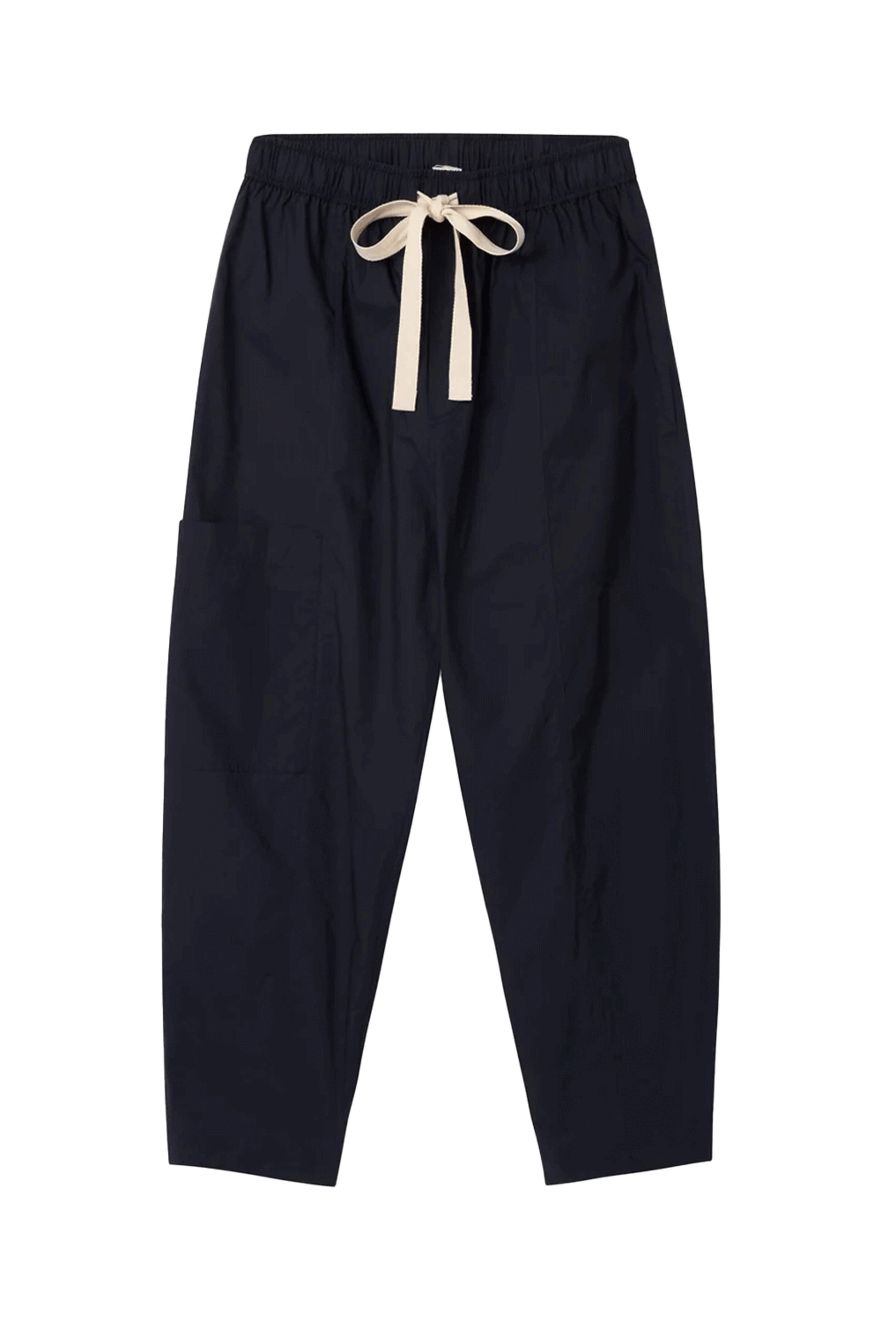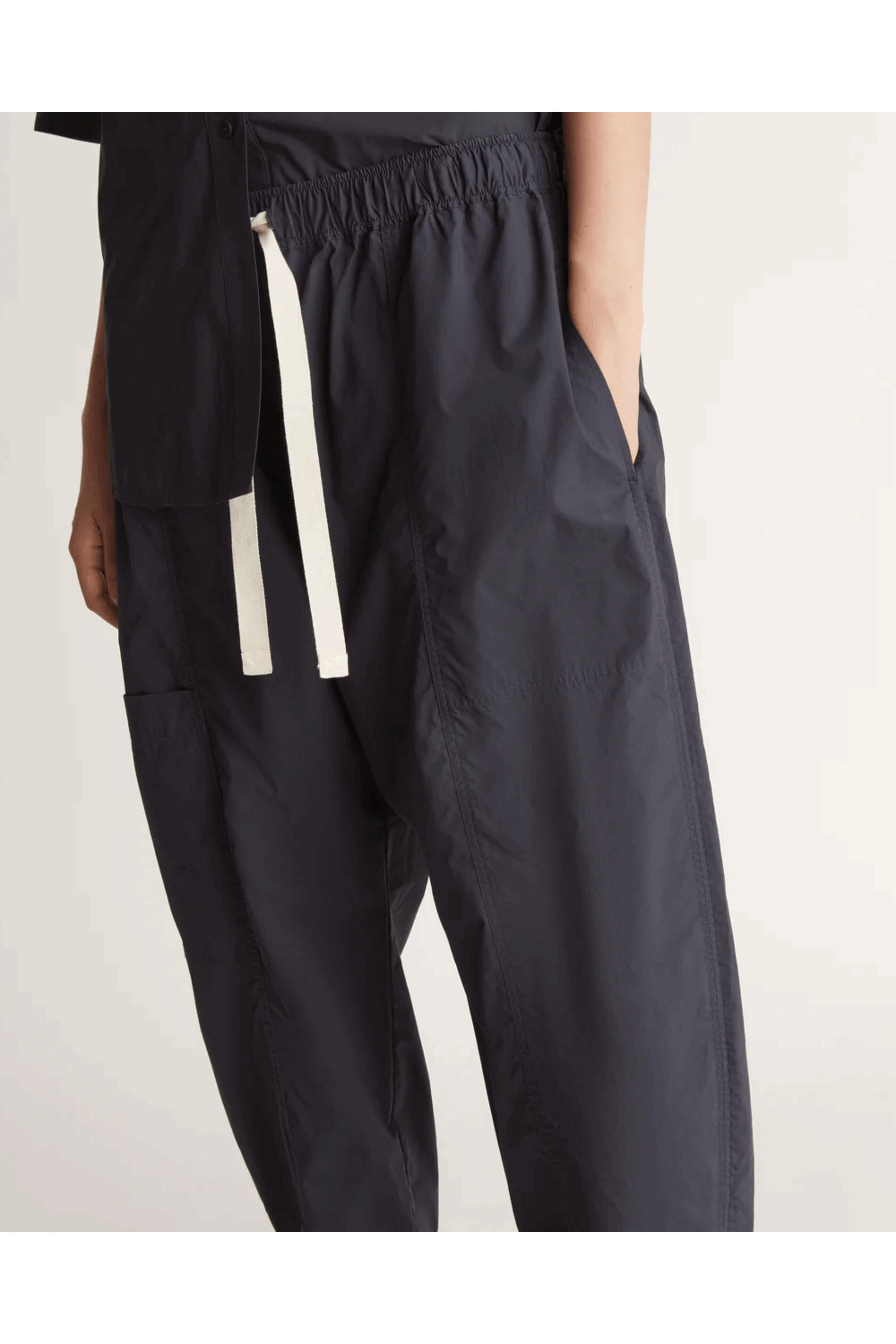 Lee Mathews Navy LM Poplin Pant . Elastic waistband . Herringbone drawcord . Side pockets . Curved leg . Cropped length . Fabrication: 100% BCI Cotton Poplin . Dry cleanable .