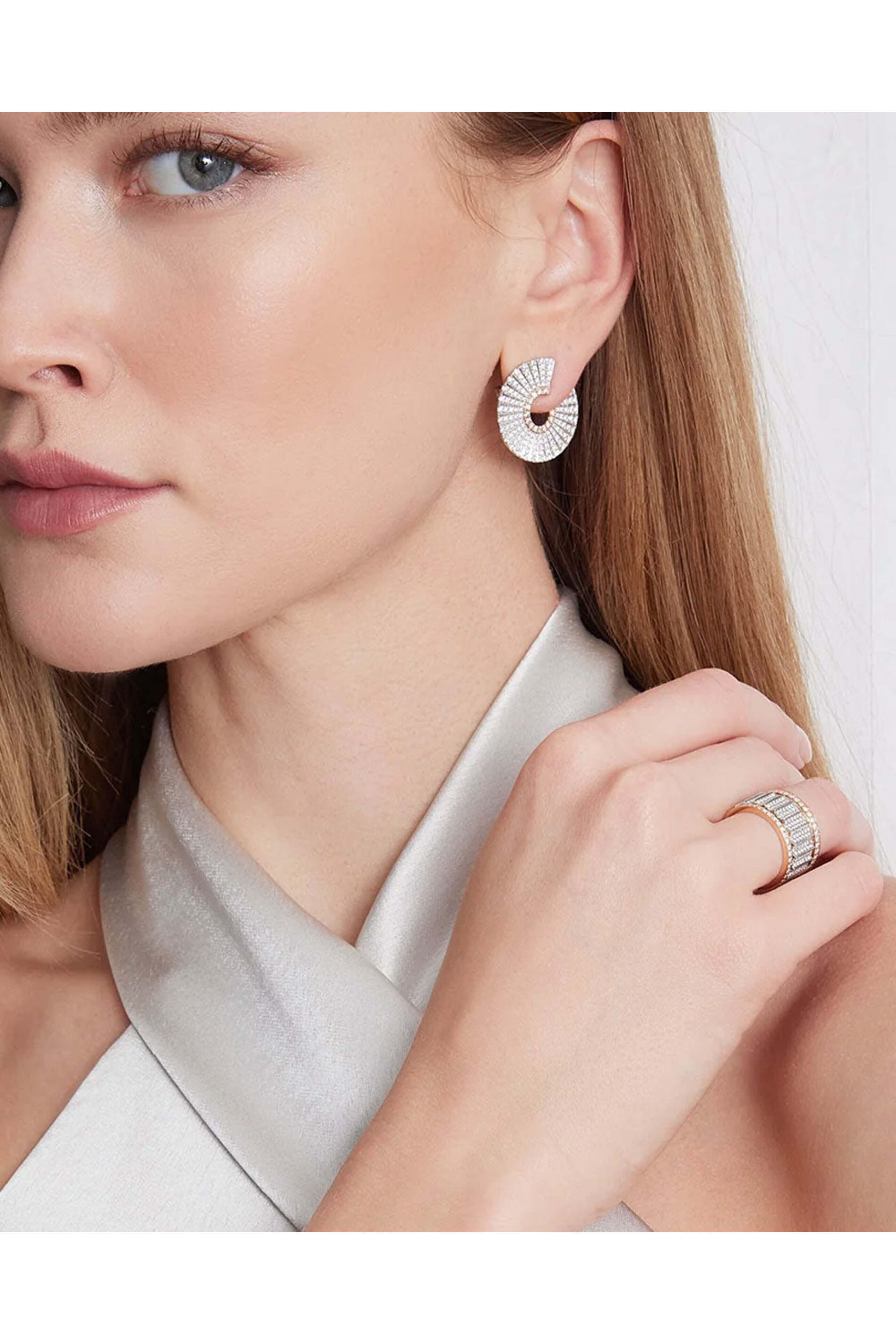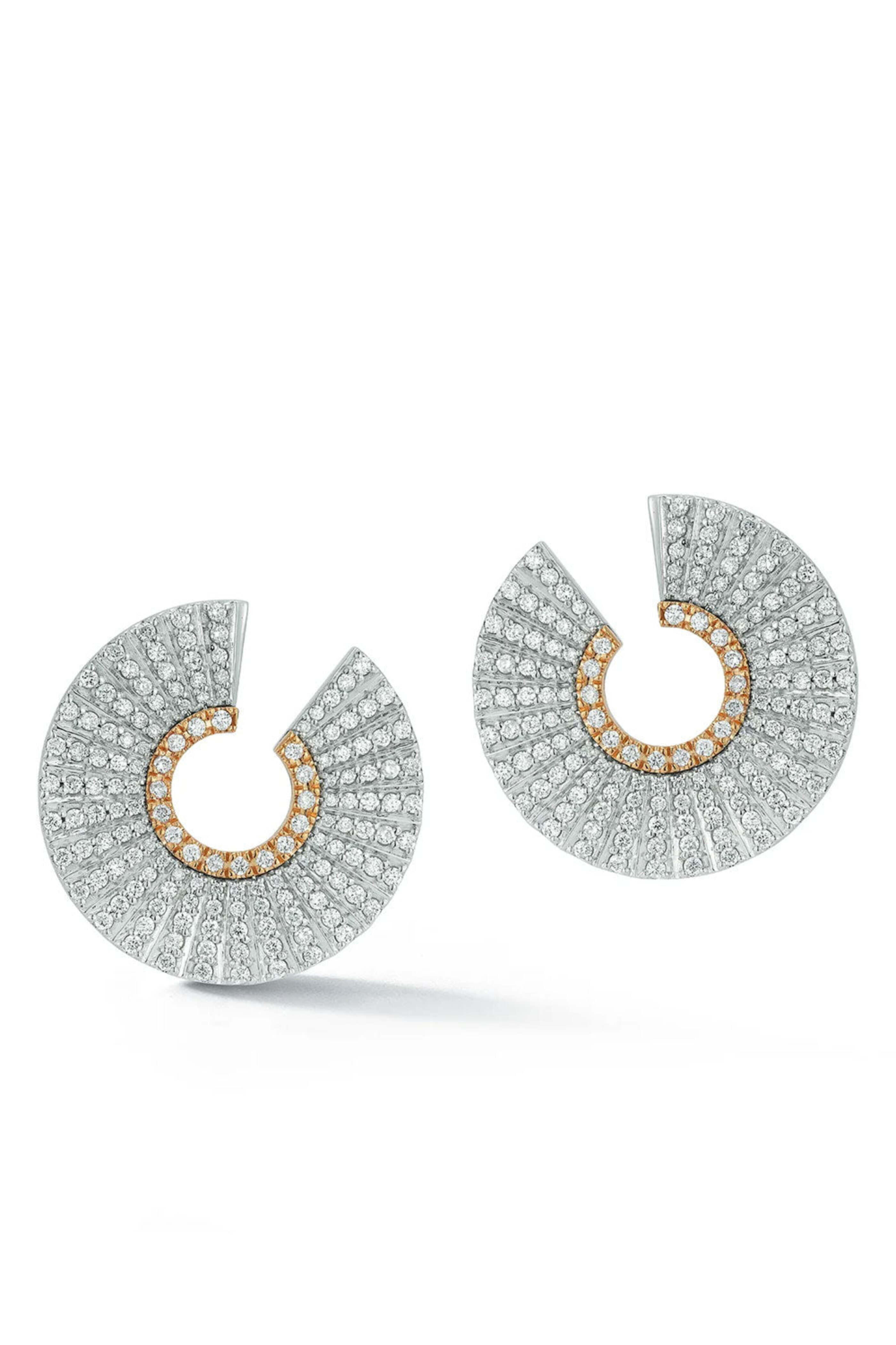 Walters Faith Clive All Diamond Front Facing Hoop Earrings. 18k white gold. 18k rose gold. Diamond 1.83 total carat weight. Front facing hoop design. 1 W. Post back with omega clip backing.