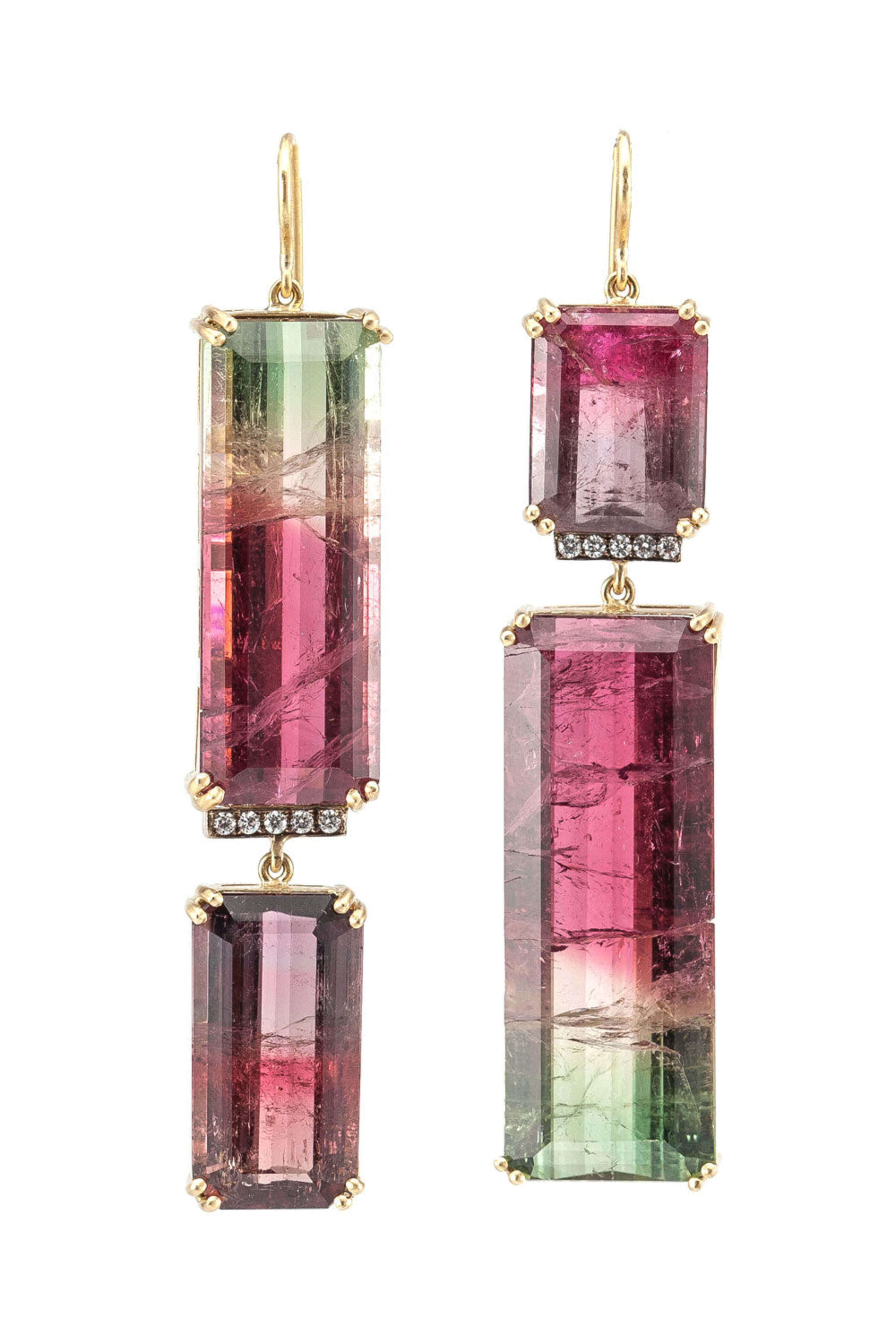 Sylva & Cie Tourmaline Double Drop Mismatch Earrings. 18k yellow gold. 62.24 ct. tourmaline. Diamonds. Mismatch design. Double drop style. Wire back. Made in USA.