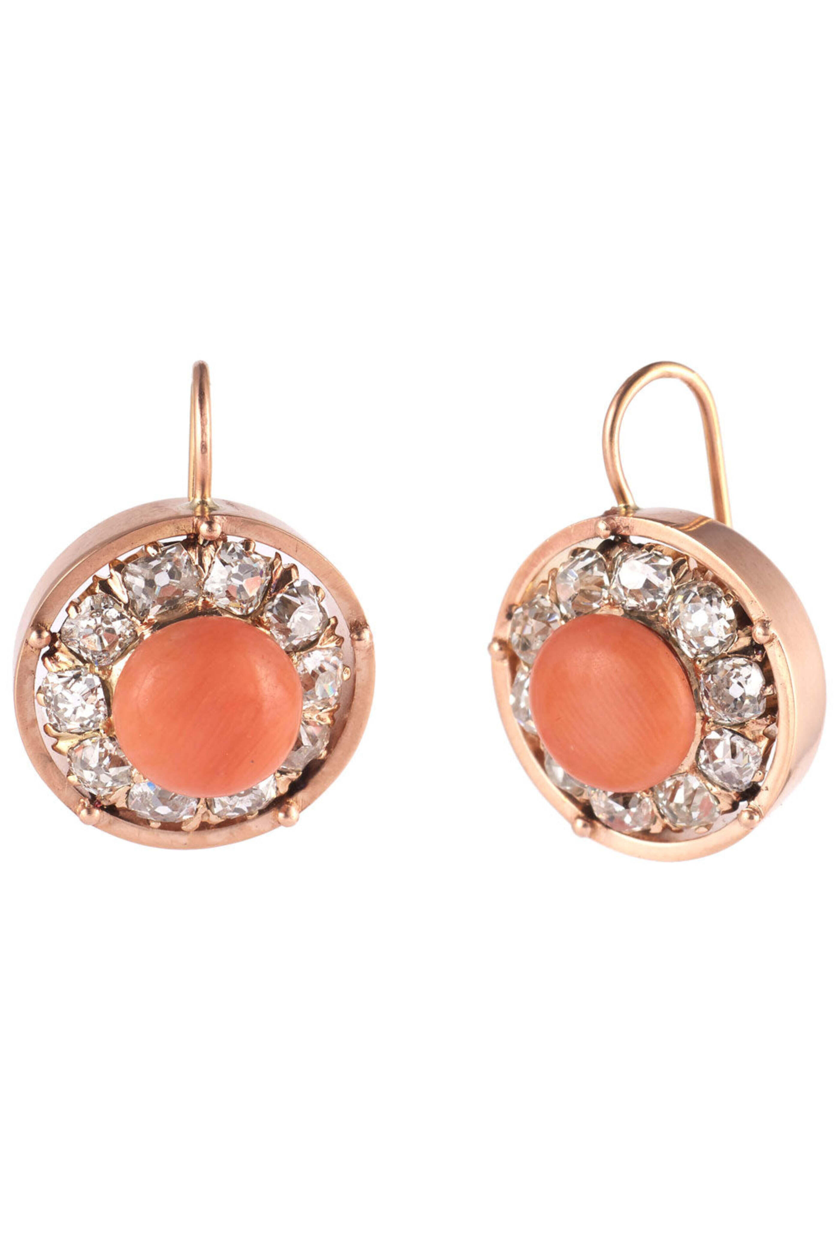 Sylva & Cie 18k Rose Gold Fame & Fortune Earrings. 18k rose gold. 2.5 ct. old European cut diamonds. Coral. Wire back. Made in USA.