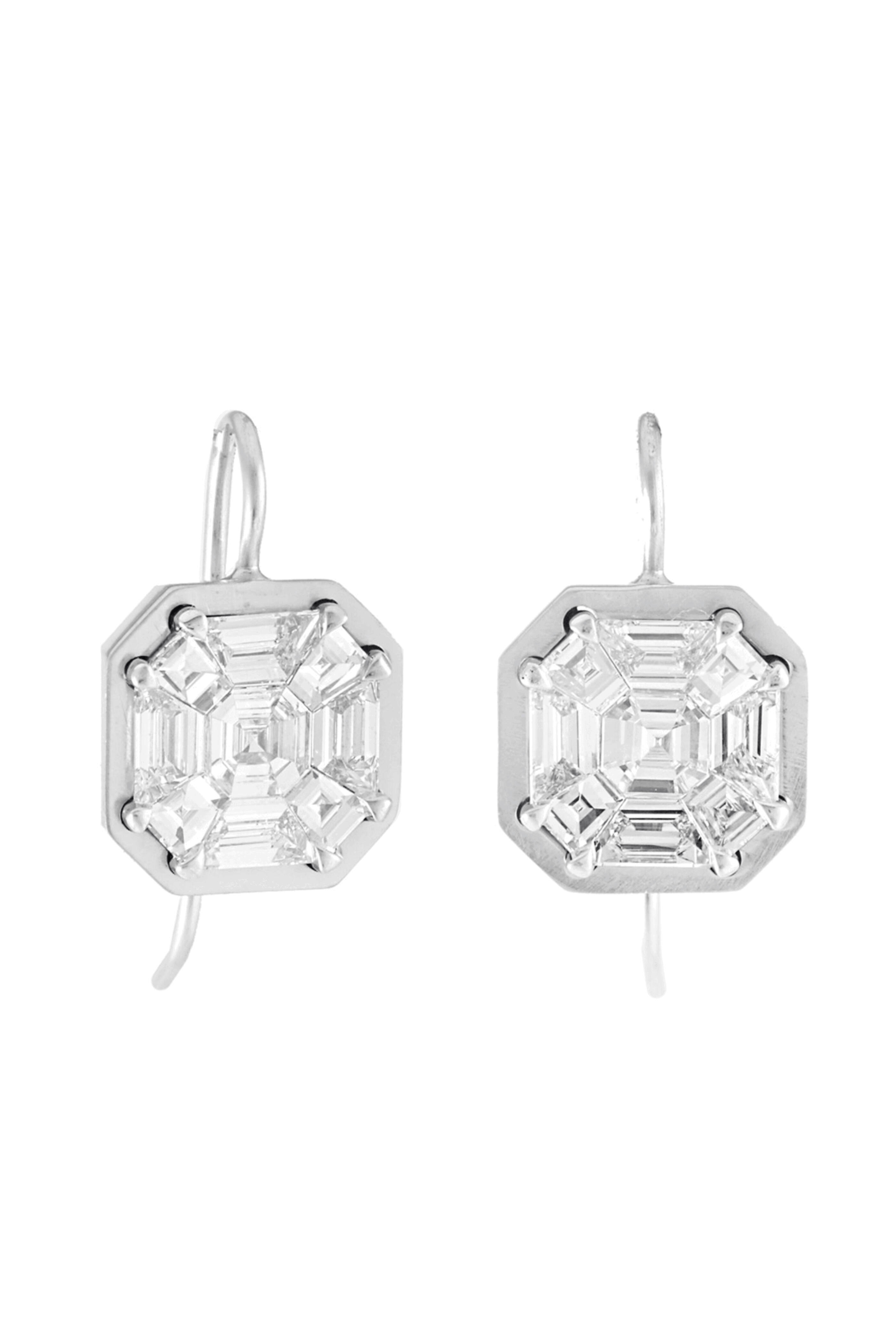 Sylva & Cie Mosaic Diamond Earrings. 18k white gold. Diamond 0.30 total carat weight. Mosaic design. Prong setting. Drop style. Wire back. Made in the USA.