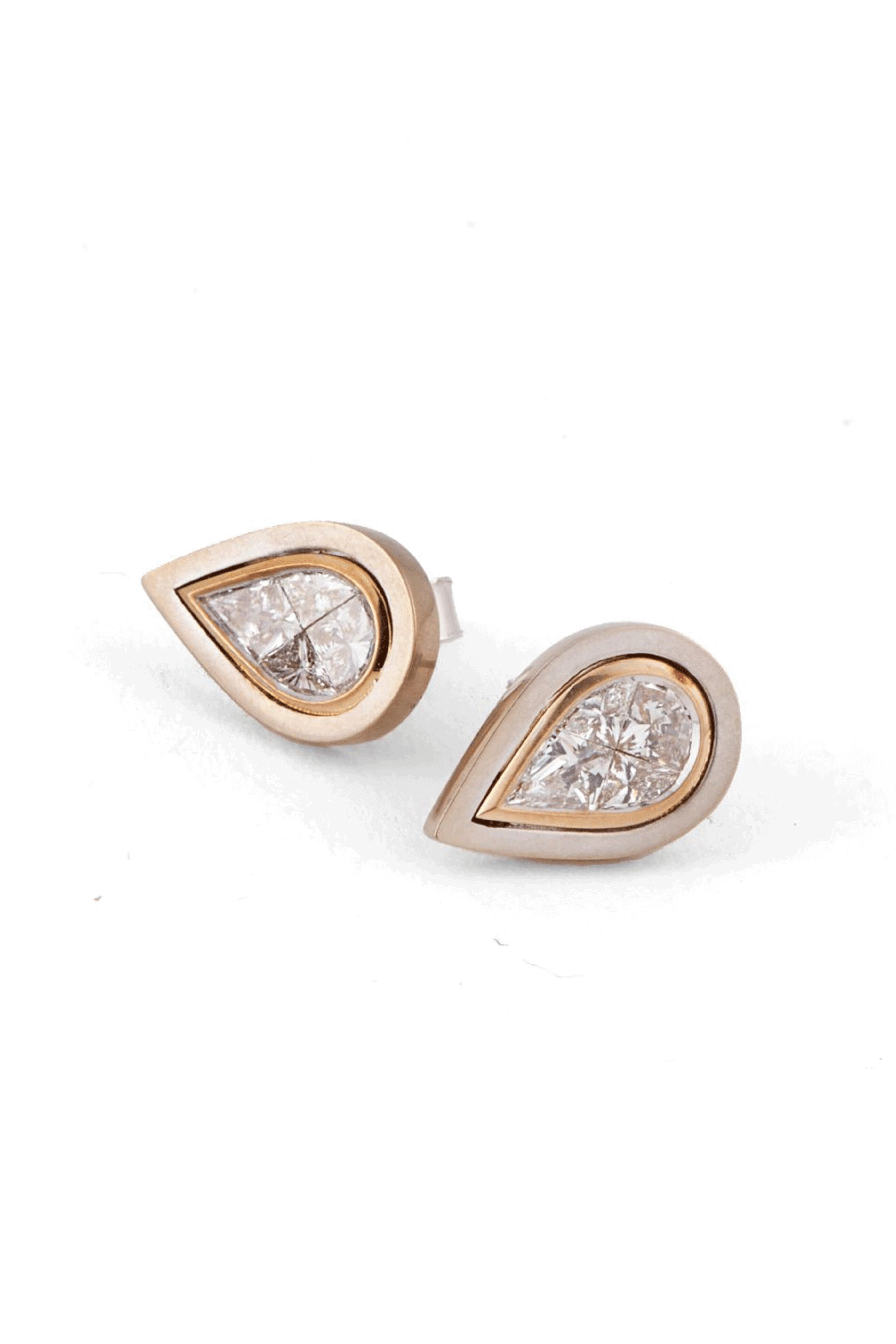 Sylva & Cie Diamond Pear Stud Earrings. 18k gold. 18k white gold. Diamond 0.88 total carat weight. Mosaic diamond. Pear cut. Two rows of bezels; one gold and one white gold. Stud style. Push back post. Made in the USA.