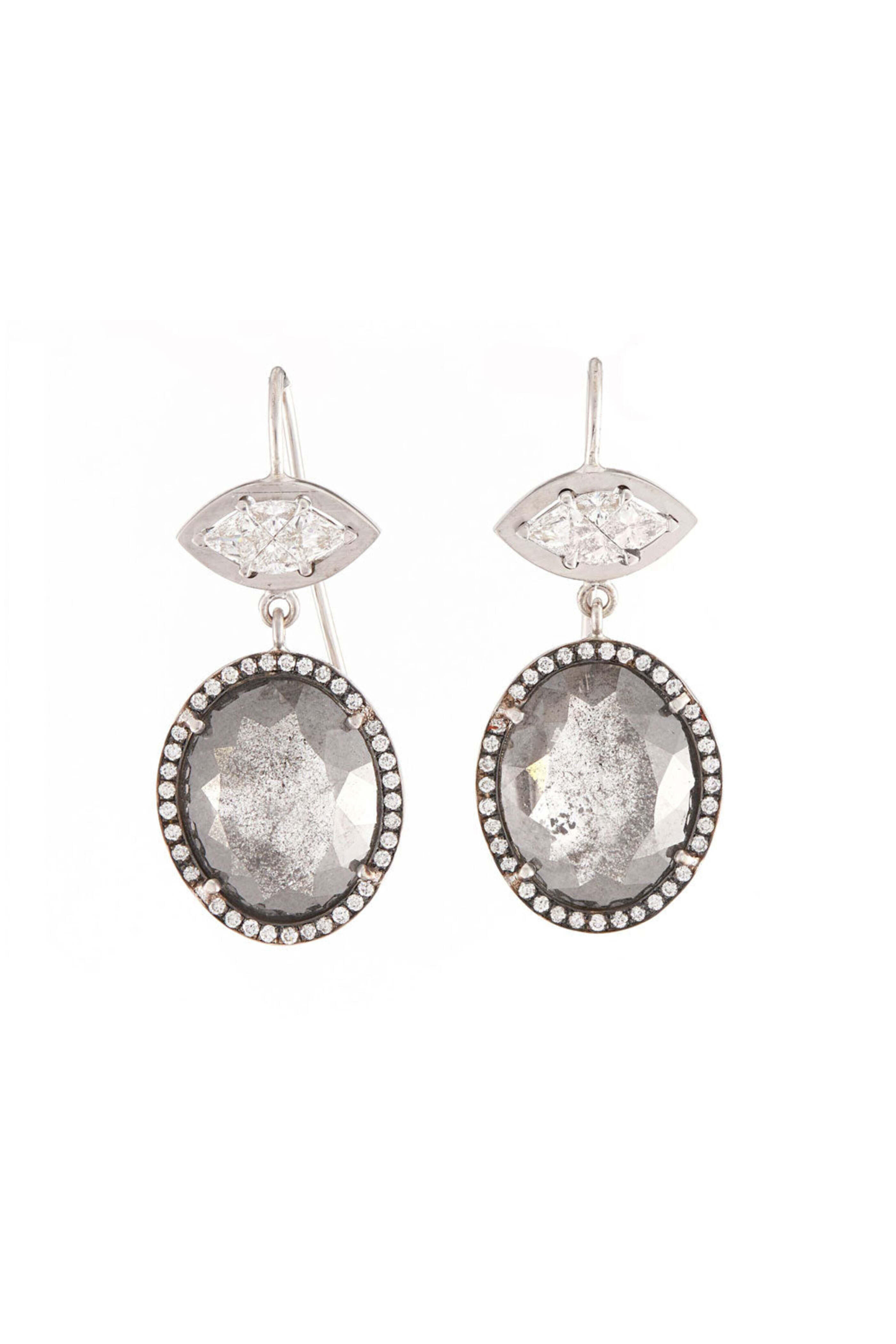 18k white gold. Gray rough cut diamond 10.77 total carat weight. Mosaic marquis diamond 0.58 total carat weight. Round brilliant cut diamond 0.32 total carat weight. Drop style. Wire back. Made in the USA.