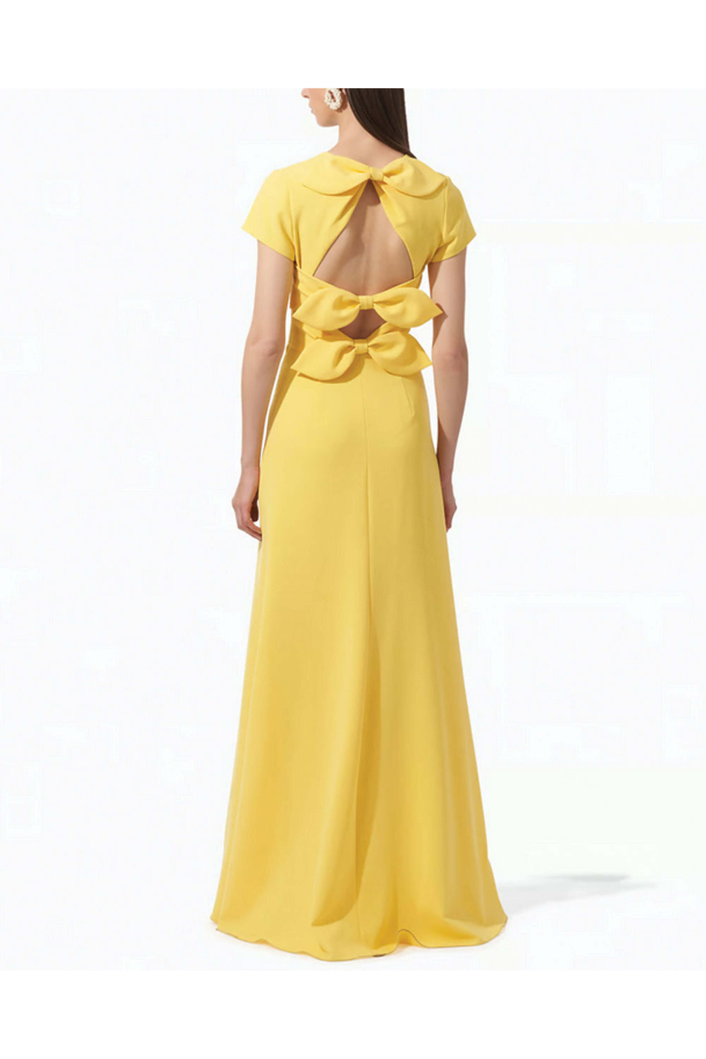 Carolina Herrera Sunshine Lily Valley Embellished Short Sleeve Gown. Round neck. Short sleeves. Self-fabricated bow detail at back; cutout detail. Natural waist seam detail. Aline skirt. Full length. Lily of the Valley embellishment. 92% polyester, 8% polyurethane.