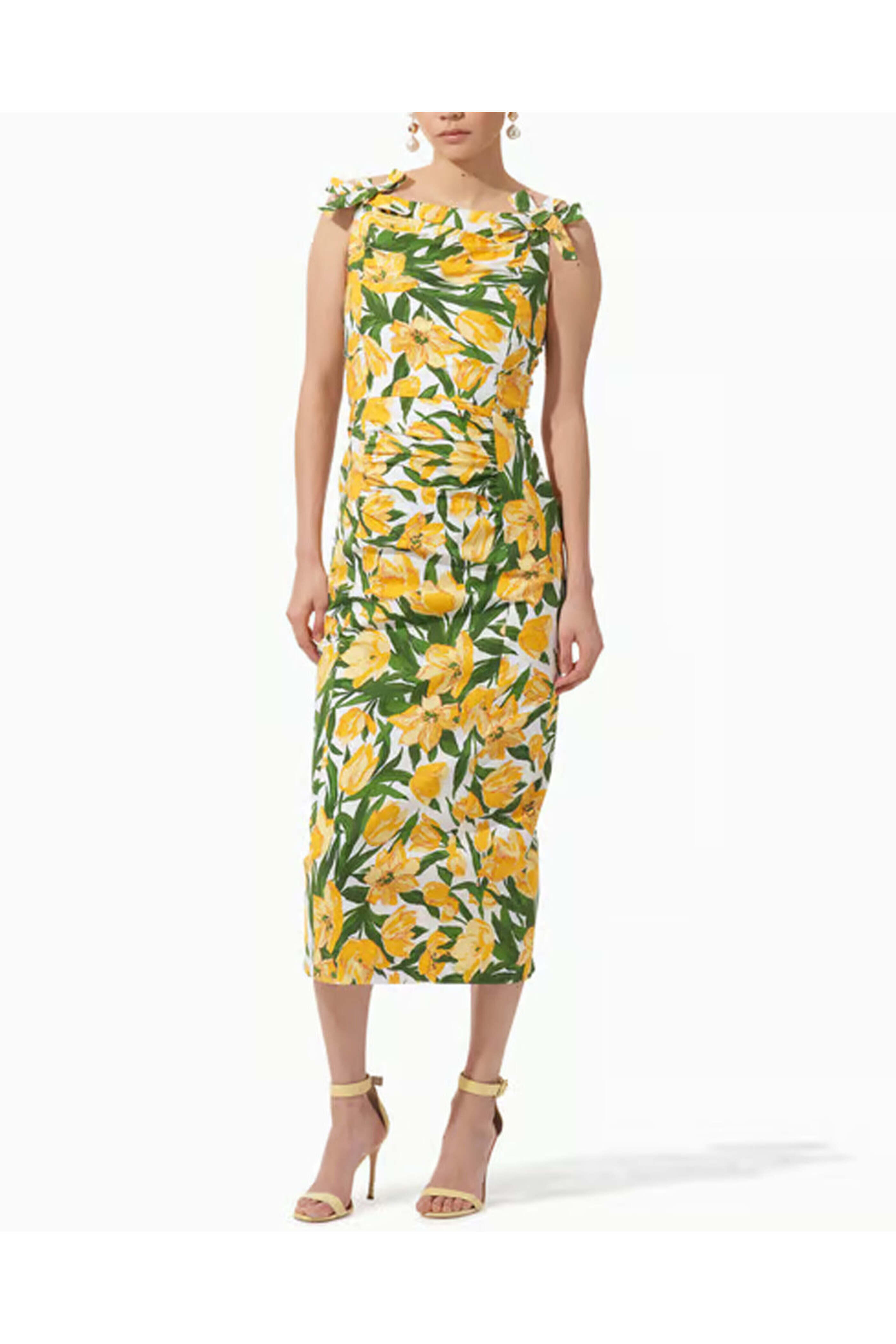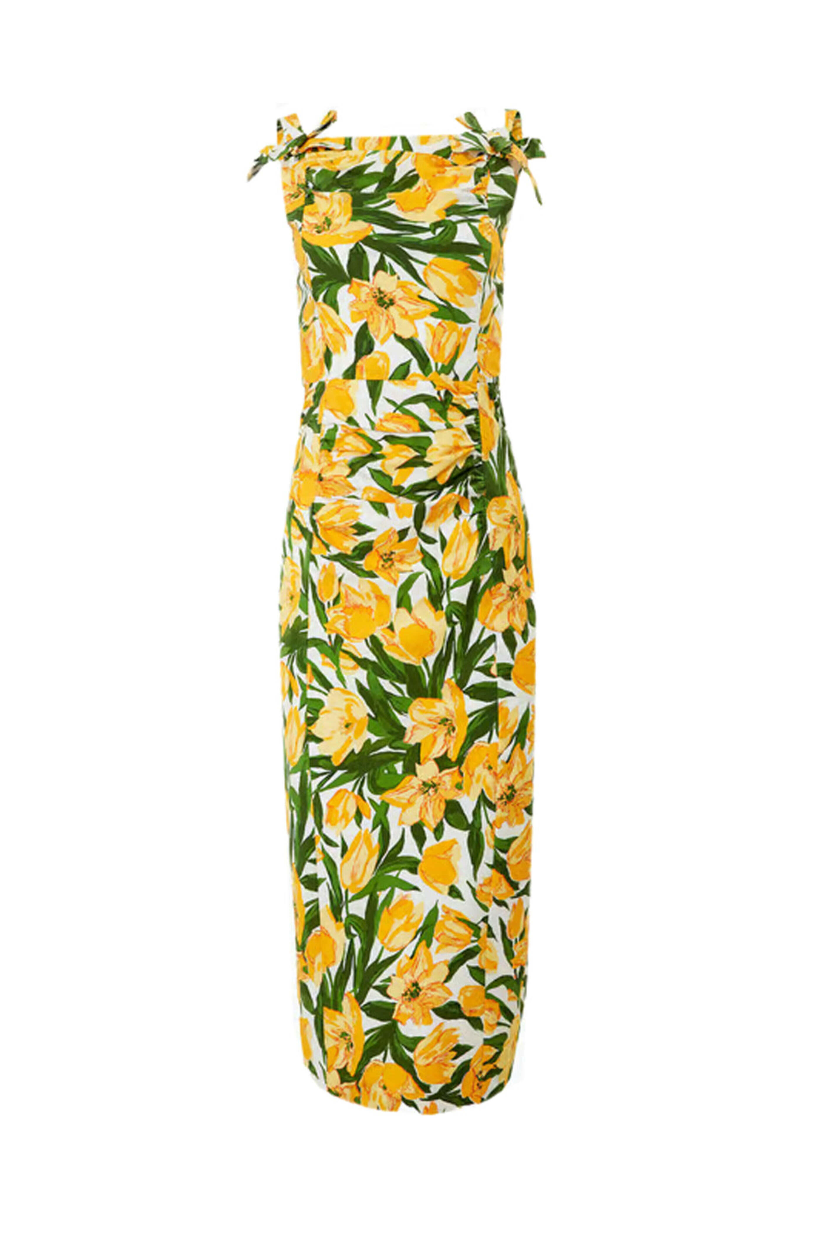 Carolina Herrera White Tulip Print Bow Strap Midi Dress. Straight neck. Square back. Sleeveless; bow detail at shoulder straps. Ruched front panel. Slim silhouette. Midi length. Made in Italy. 97% cotton, 3% elastane.