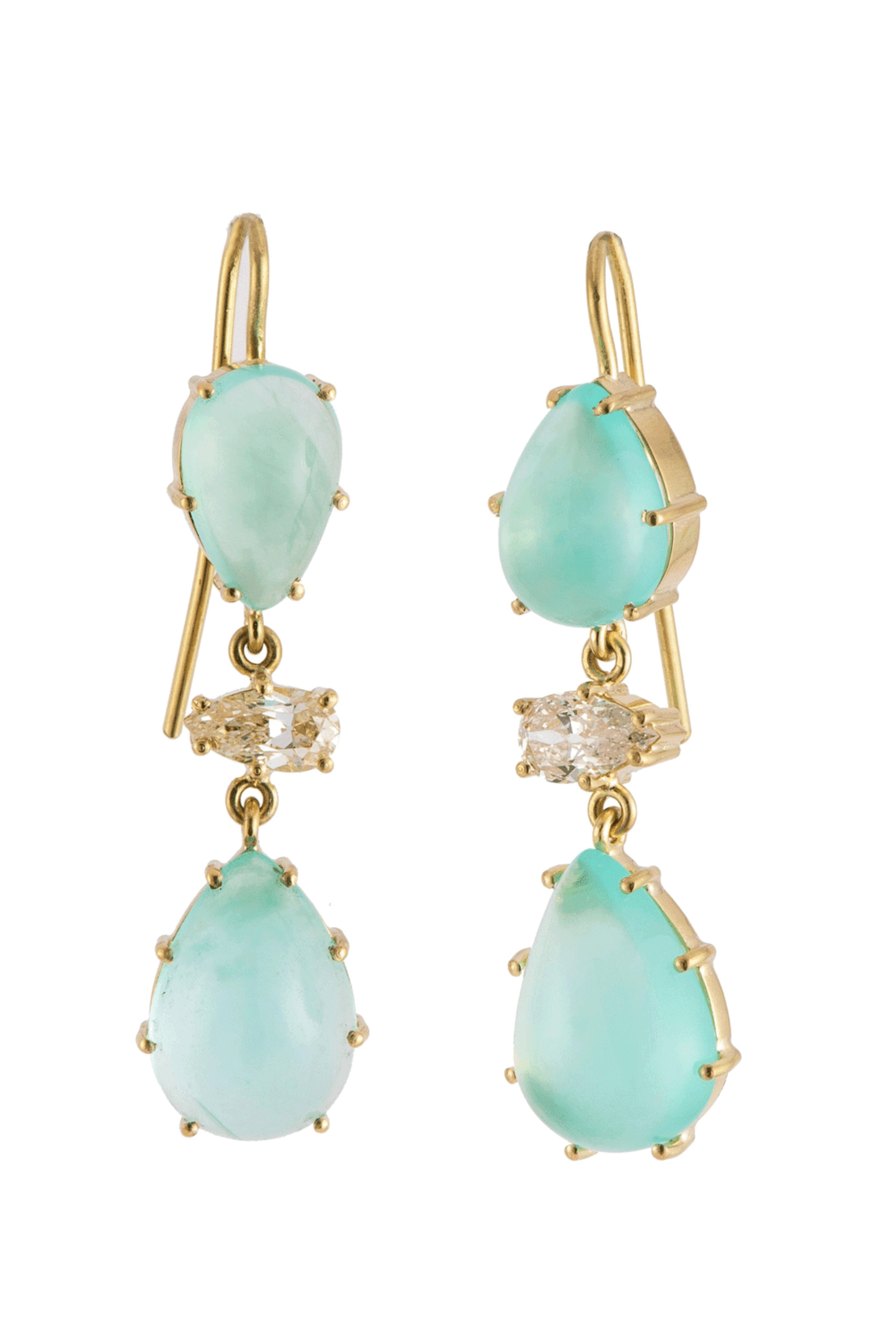 18k gold. Peru opal 9.84 total carat weight. Diamond 0.86 total carat weight. Pear cut design. Three tier design. Prong settings. Drop style. Wire back. Made in the USA.