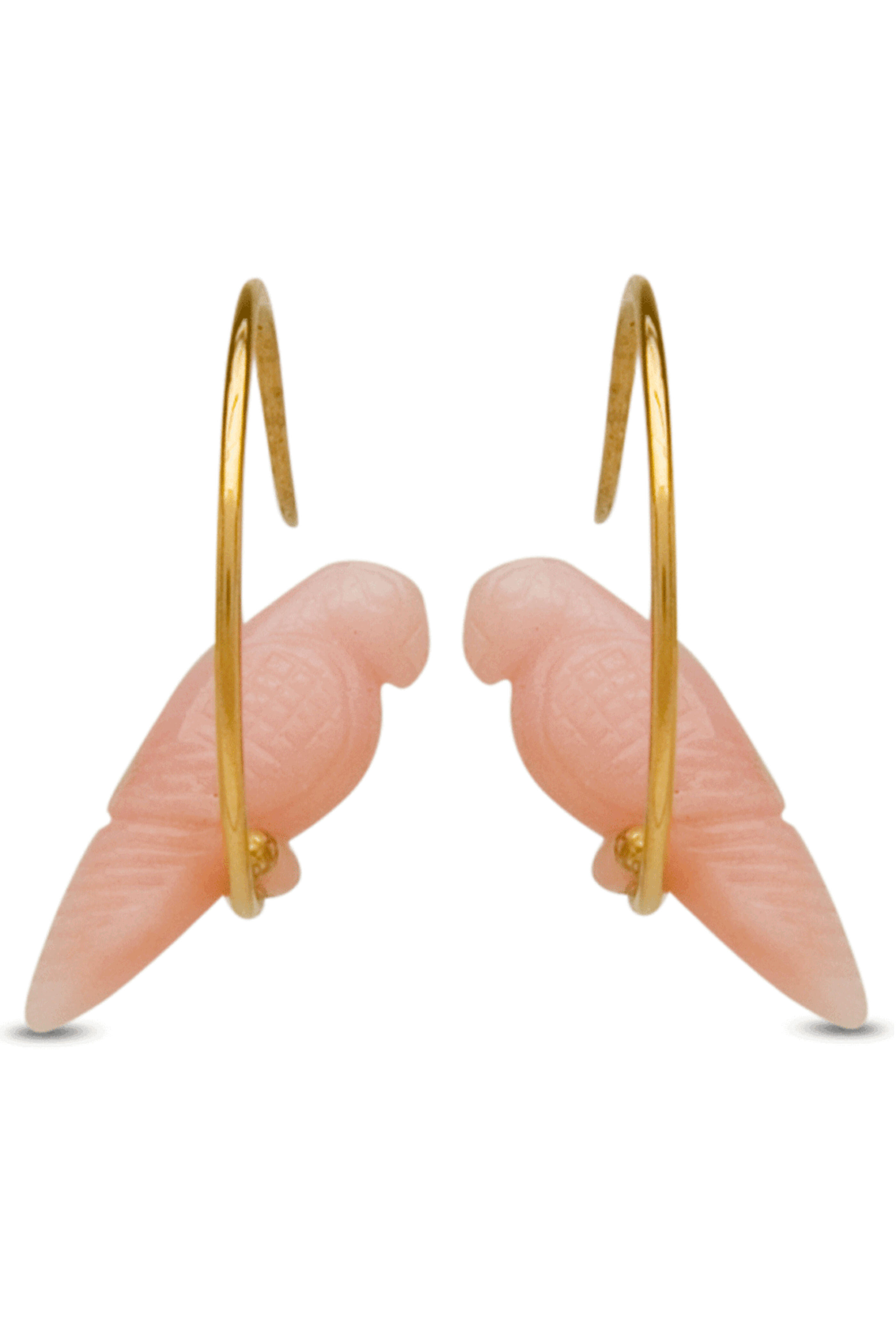 Carla Rockmore 18k Yellow Gold Pink Opal Tallulah Birdie Earrings. 18k yellow gold. Pink opal. Carved bird detail. 1 H x .75 W. Flat wire back.