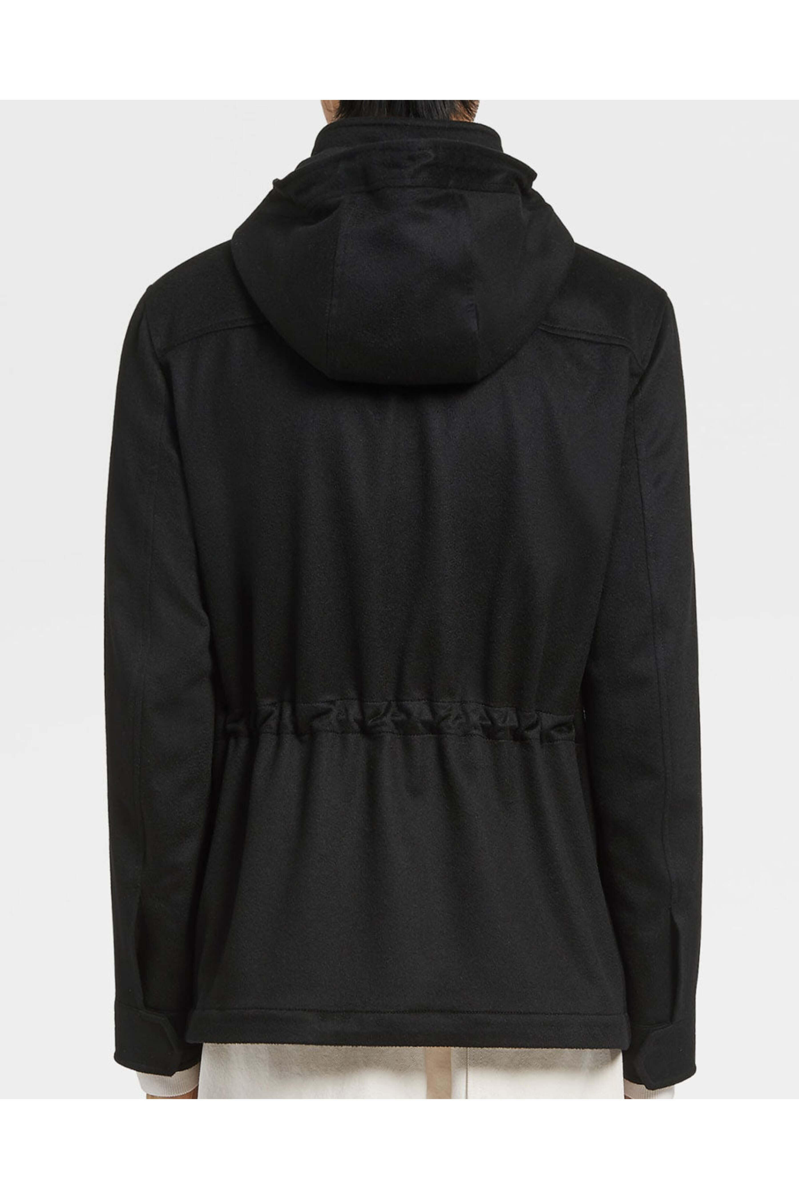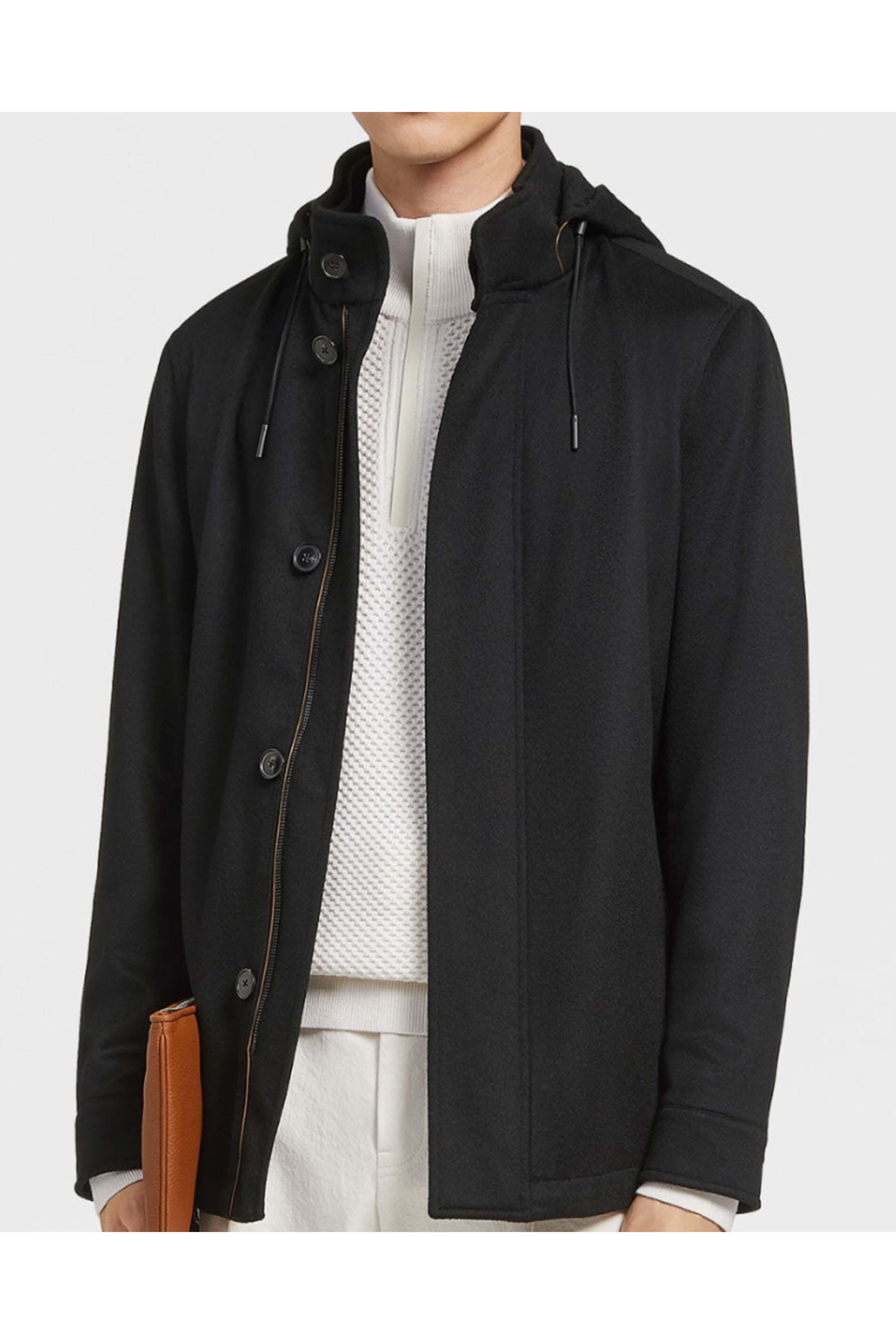 Zegna Dark Navy Oasi Cashmere Hooded Jacket. Stand collar. Detachable drawstring hood. Two-way zip closure. Button closure. Long sleeve. Single button cuffs. Side pockets with snap button closure. Inside pockets with snap button closure. Drawstring waist. Leather details. Made in Italy. 100% cashmere outer. 100% polyester lining.