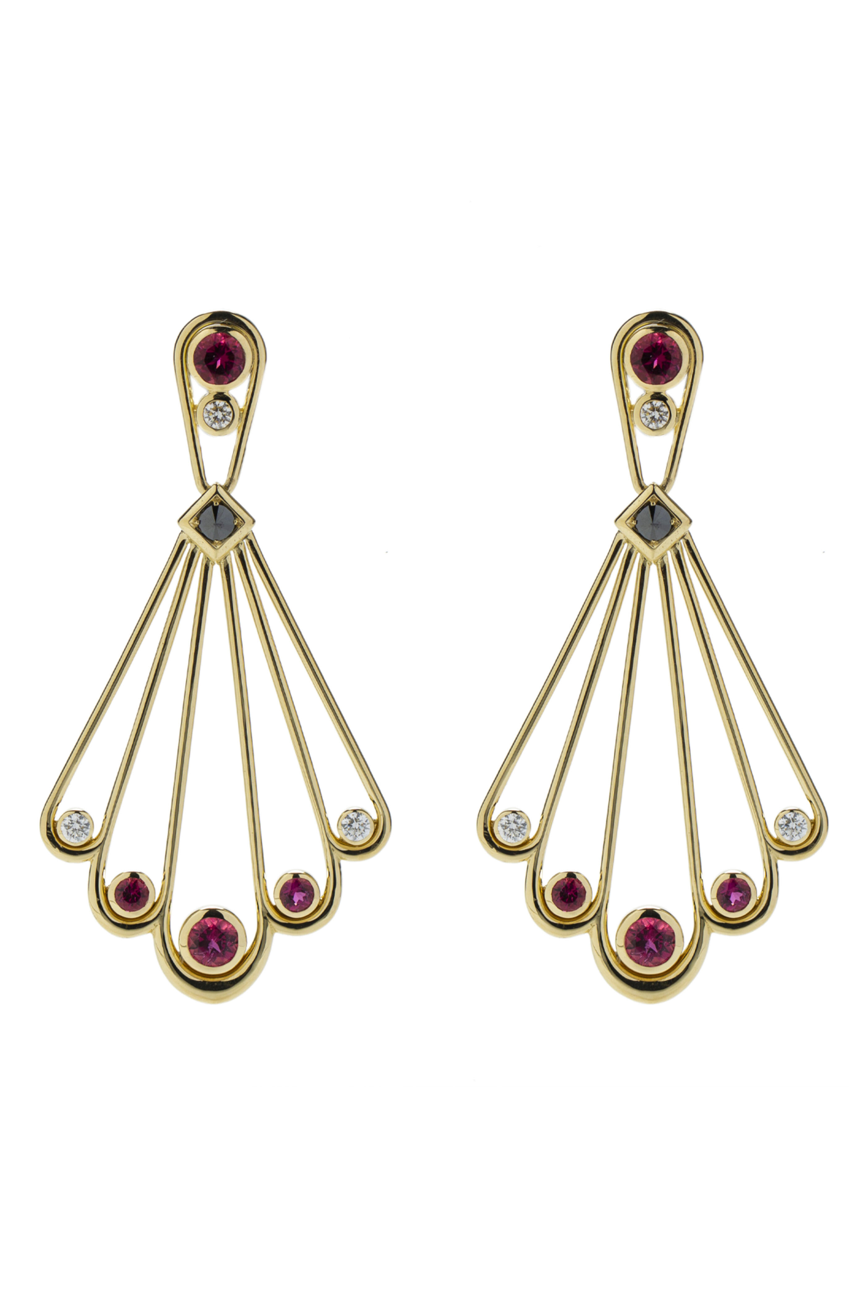 - Ara Vartanian Biela Earrings with Rubellite, White Diamonds, and inverted Black Diamonds in 18k Yellow Gold