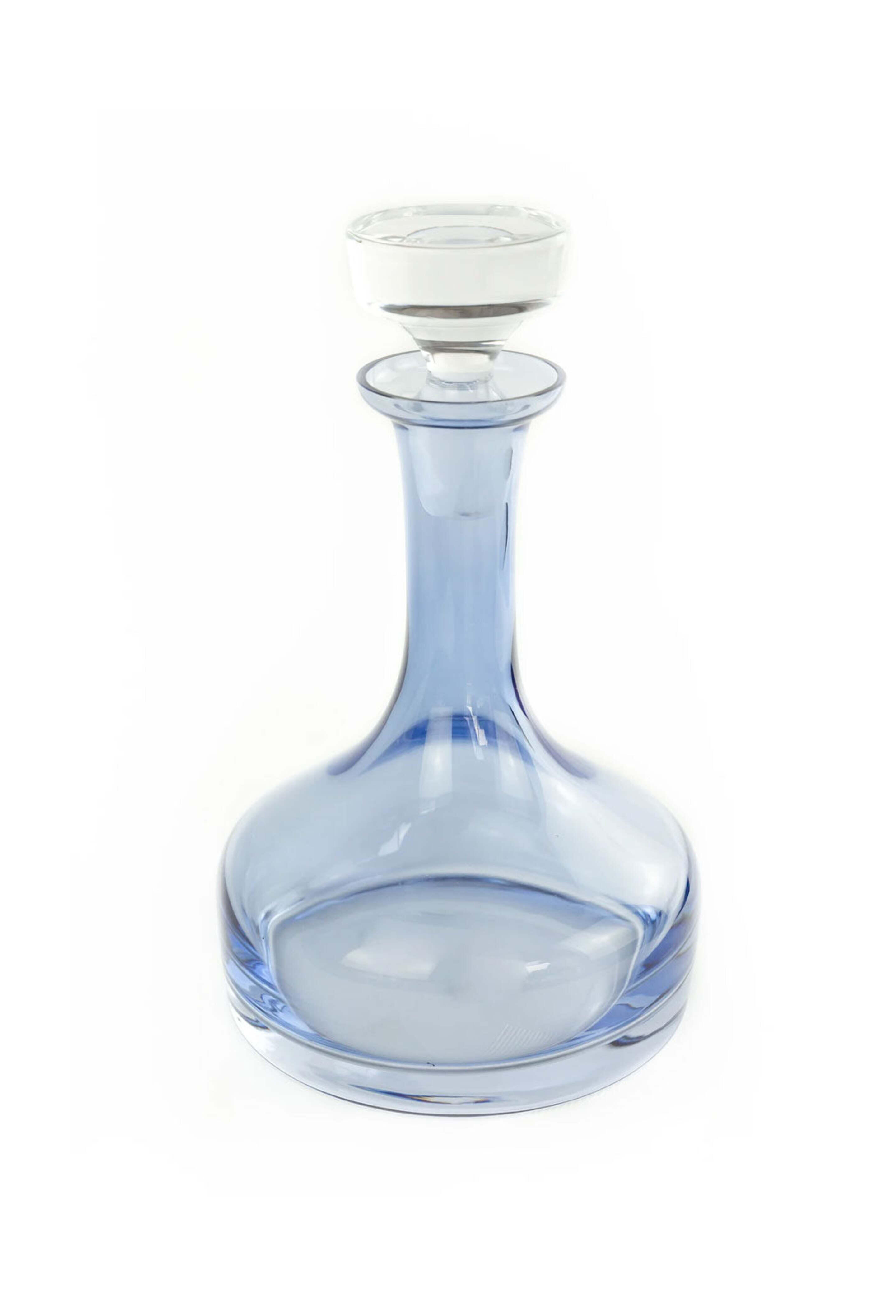 Estelle Blue Vogue Decanter. One piece. Dimensions: 8.5 inches tall x 6.5 inches wide. Capacity: 26 ounces. Care Instructions: Hand wash only.