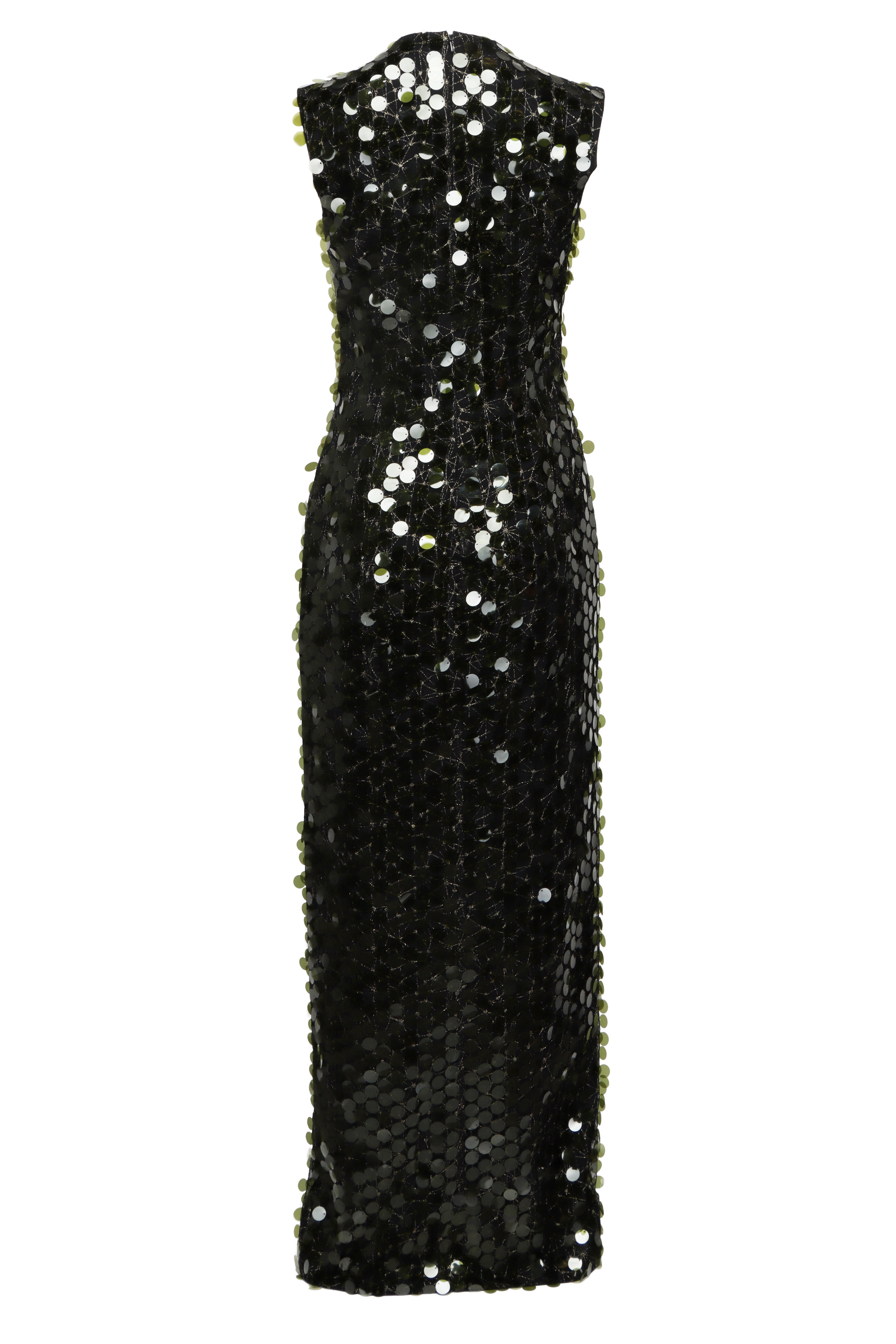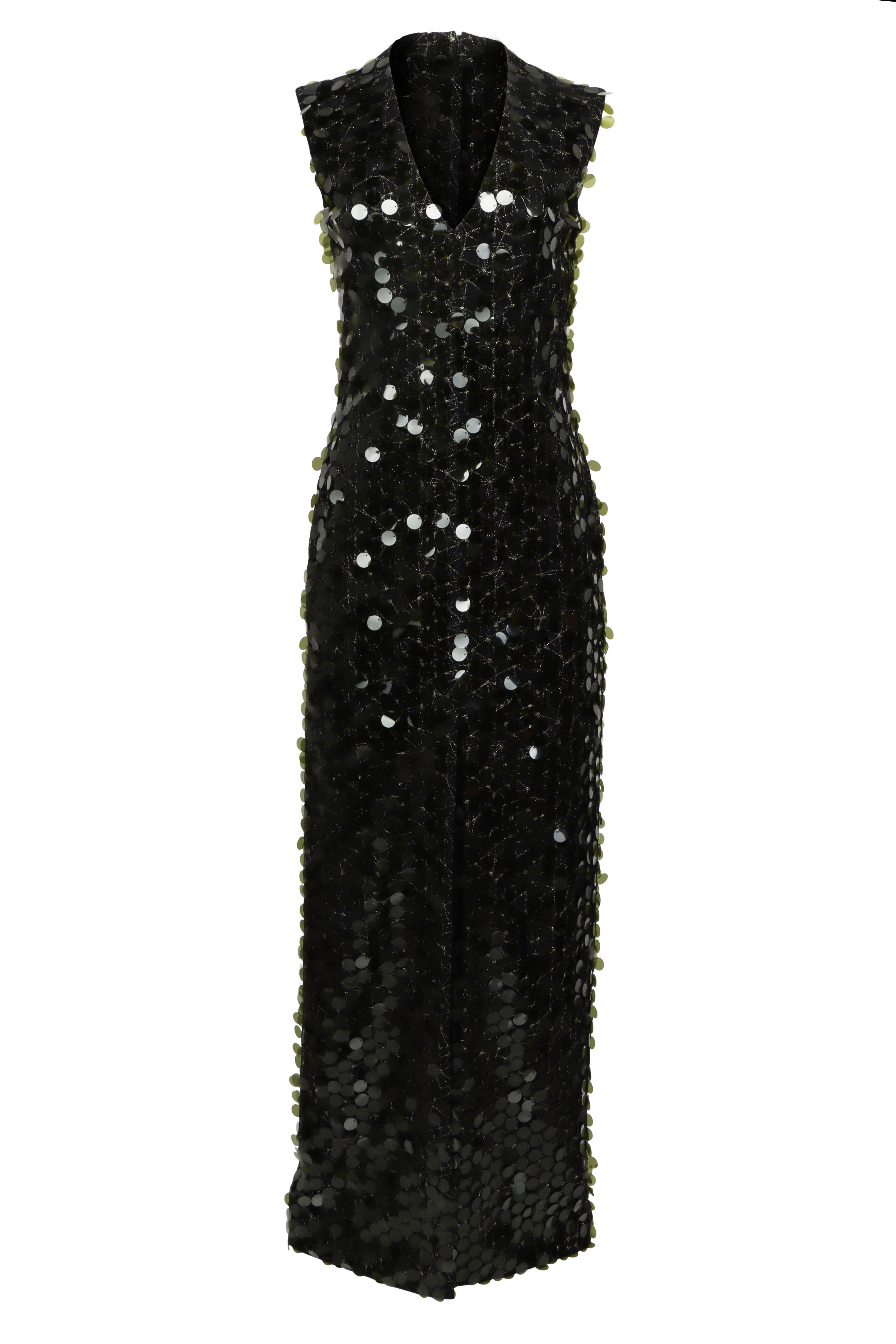 V neck. Sleeveless. Concealed back zip closure. Slim silhouette. Aline silhouette. V hem slit. Sequin detail throughout. Imported. Full length. 92% polyester, 8% polyurethane outer, 100% nylon detail, 100% polyester lining. Dry clean.