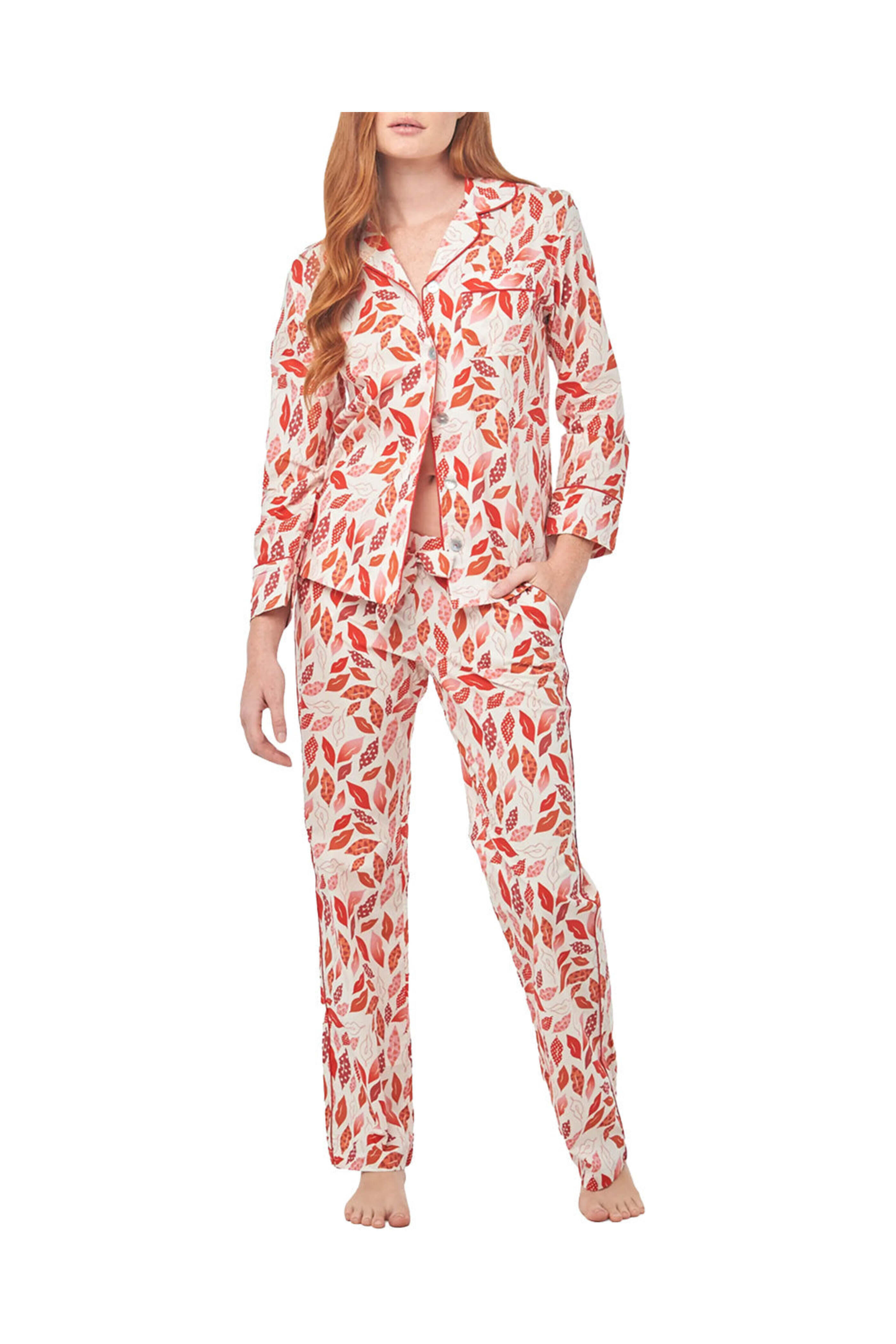 Lazy Poets Emma Pajama Set in Goodnight Kisses. Rounded lapel shirt collar. Long sleeves. Button front closure. Front shirt pocket. Elasticized pants with drawstring closure. Side pant pockets. Contrast piping detail. Relaxed fit. 100% cotton.