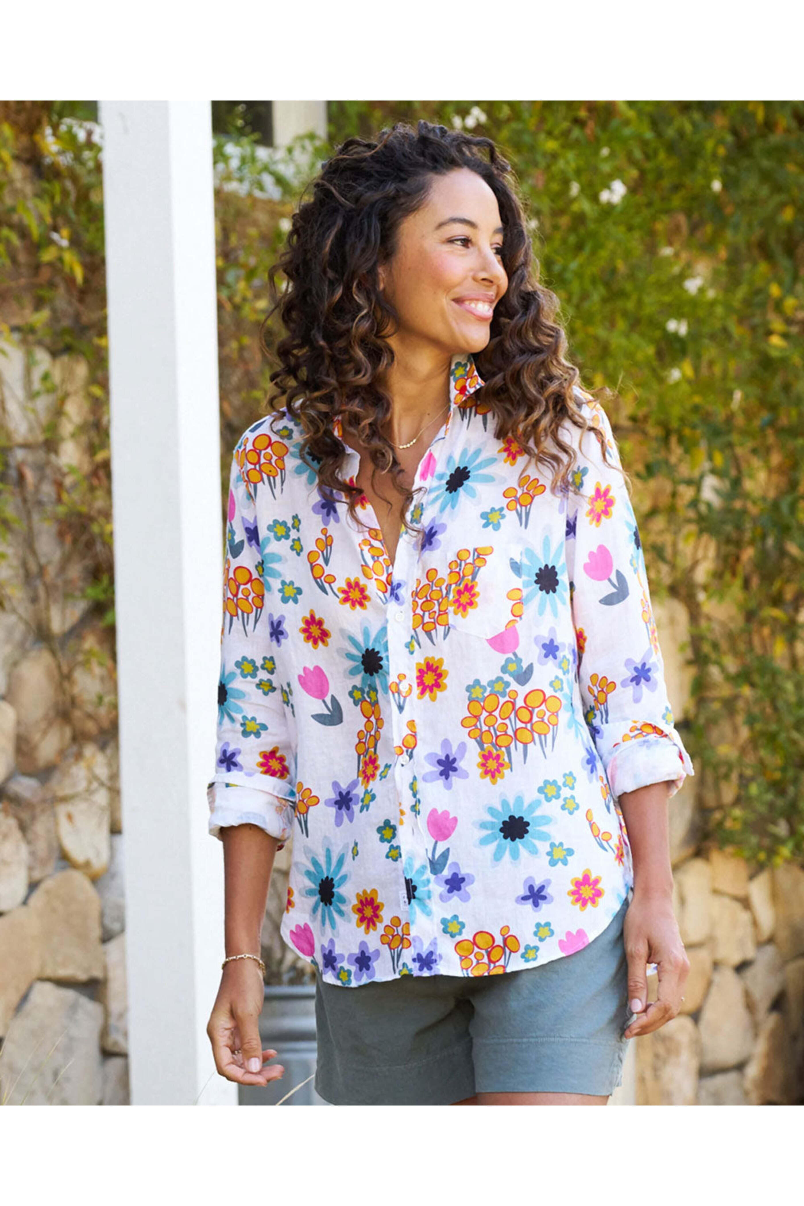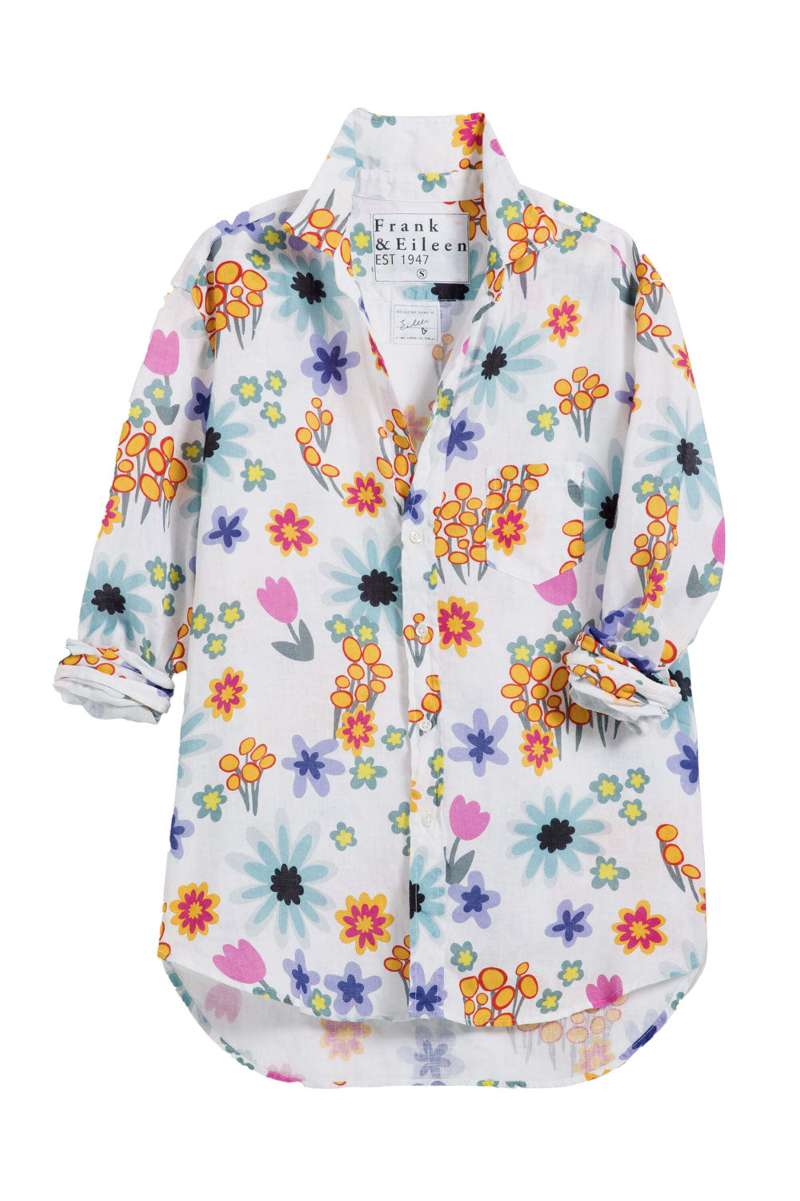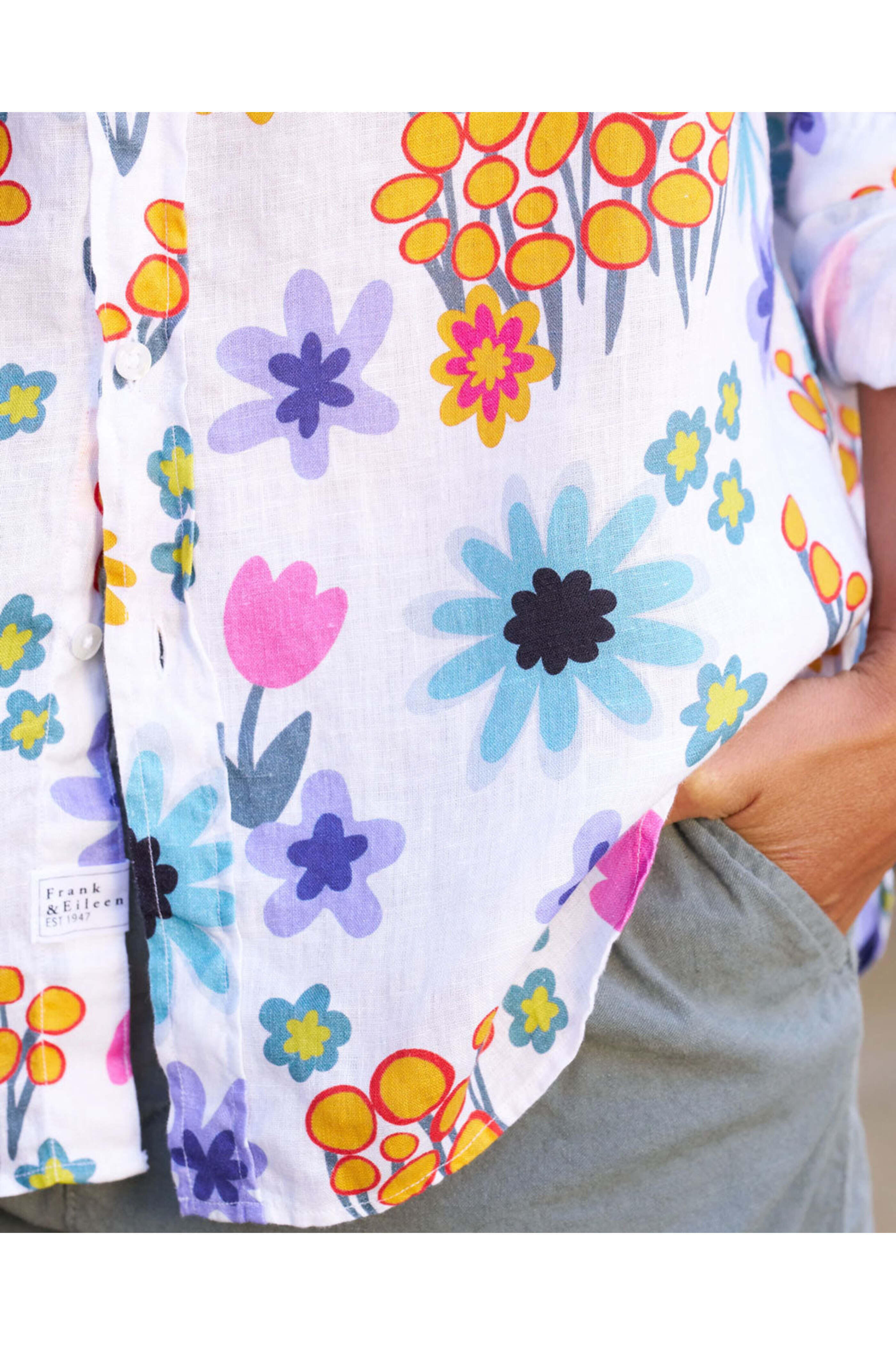 Frank & Eileen Hot Pink Floral Relaxed Eileen Button Up Shirt. Collar. V neck. Long sleeves; button cuffs. Button down front closure. Single chest patch pocket . Relaxed fit. Shirttail hem. 100% linen.